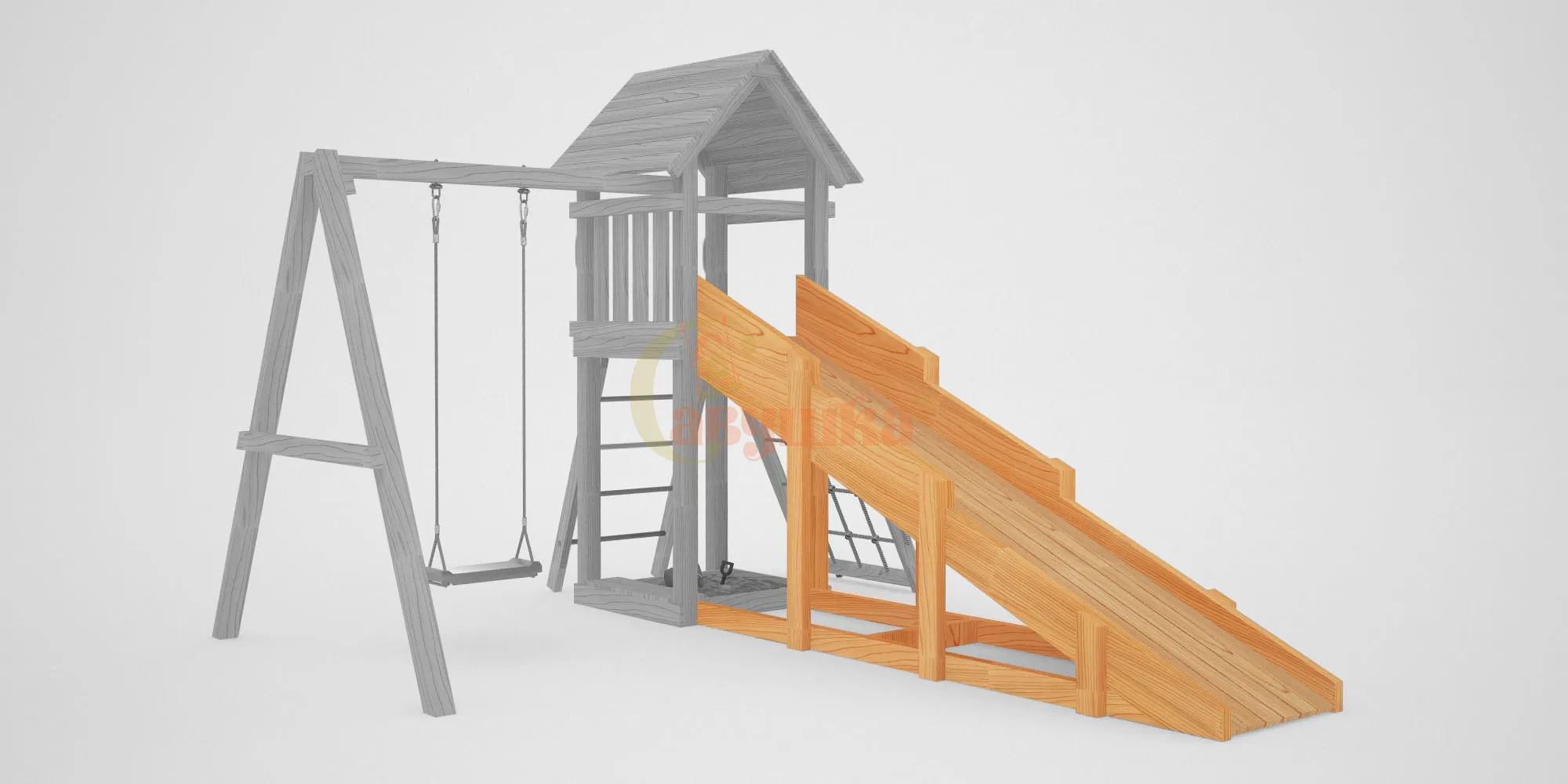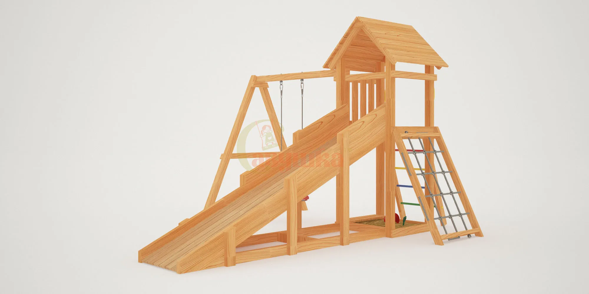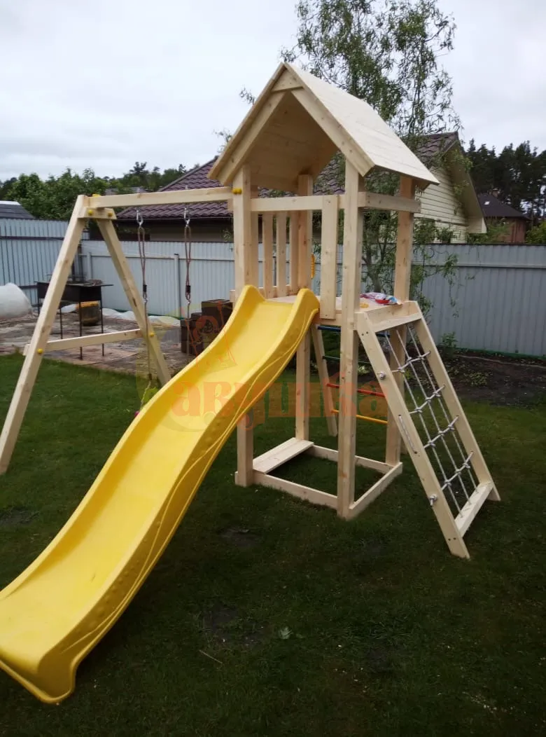 Прочная конструкция из клееного бруса, безопасные углы, сертификация по ГОСТ — это гарантия долговечности и надёжности. Площадка выдержит активные игры и любую погоду.