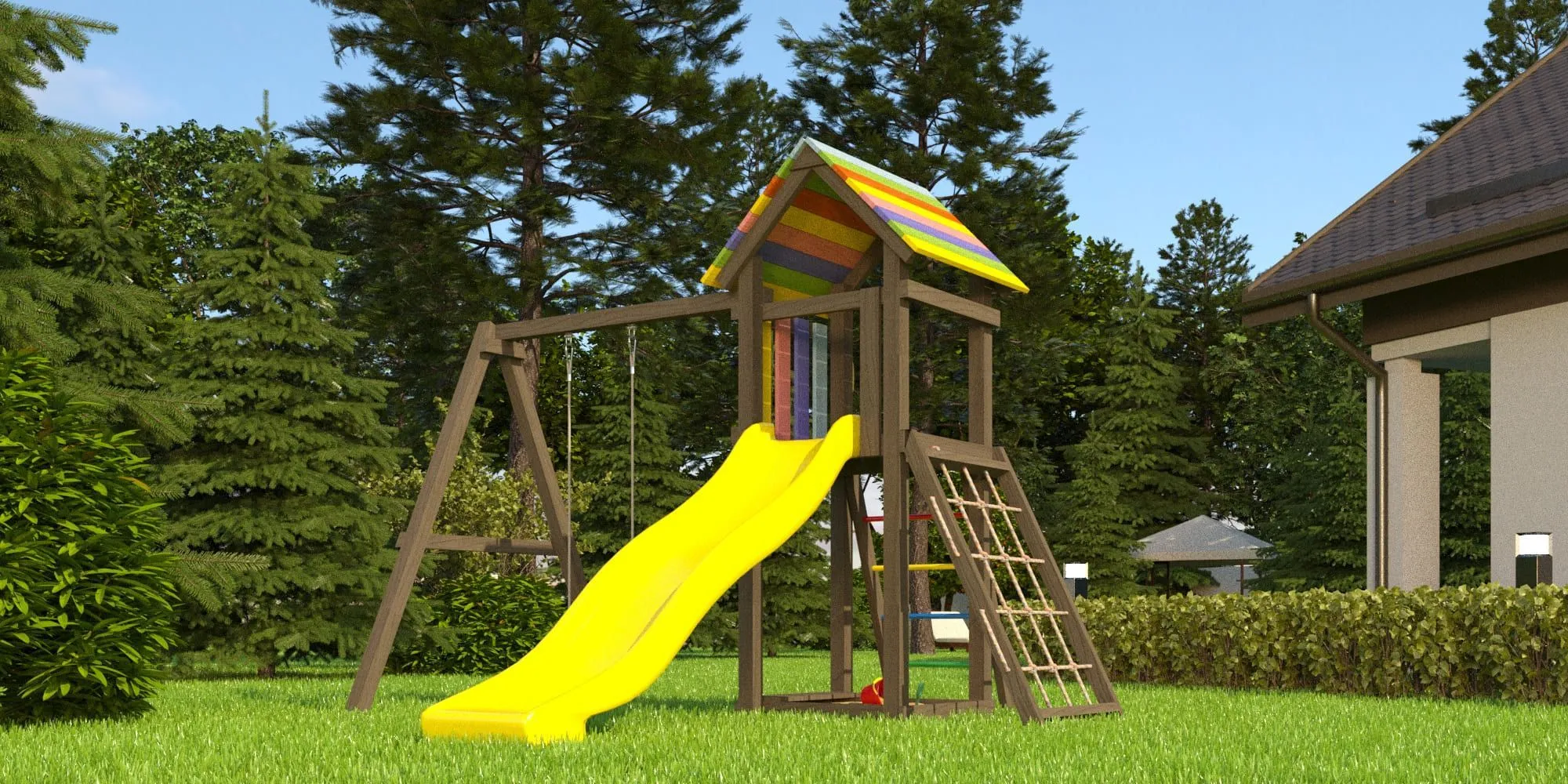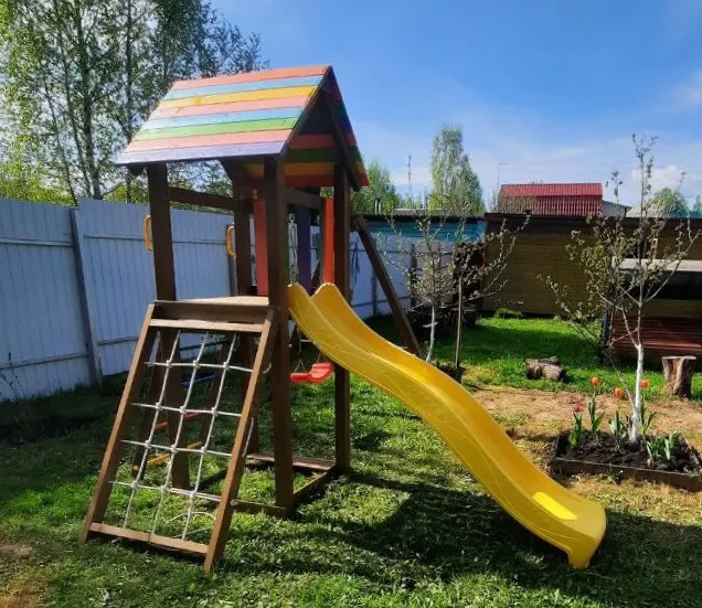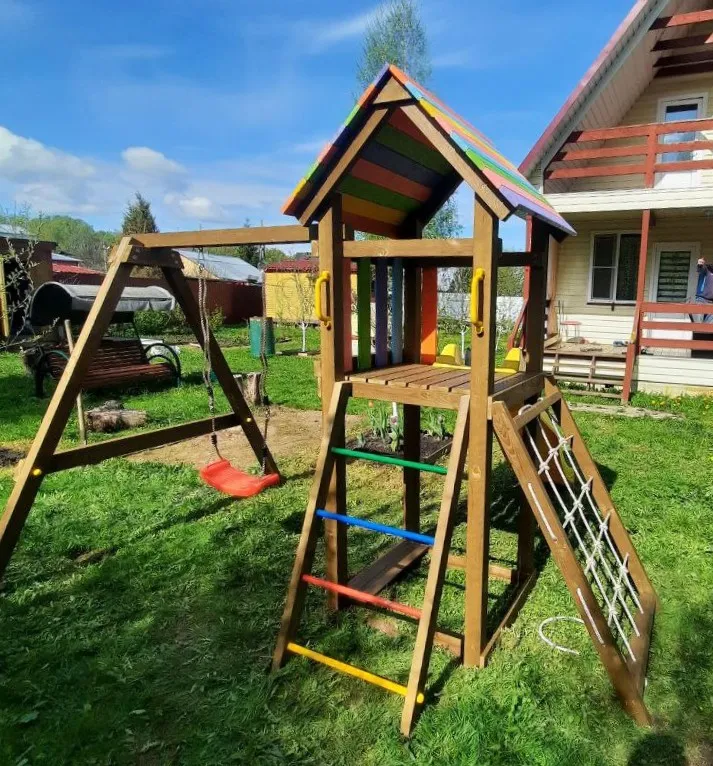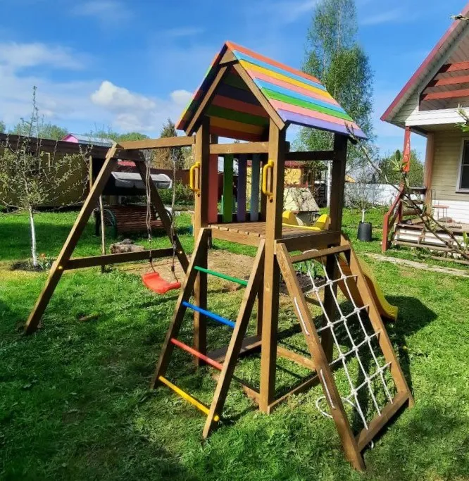 Центр площадки – башня, в основании которой находится песочница. Взбираться наверх можно по-разному: с помощью лестницы с разноцветными металлическими поперечинами либо по сетке-лазалке, которую поместили в раму для устойчивости.Домик закрыт сверху деревянным перекрытием – оно скрывает от прямых солнечных лучей и позволяет передохнуть на свежем воздухе. Комплекс универсален, поскольку включает в себя столь любимые детьми горку и качели (обычные, со спинкой или 3 в 1).