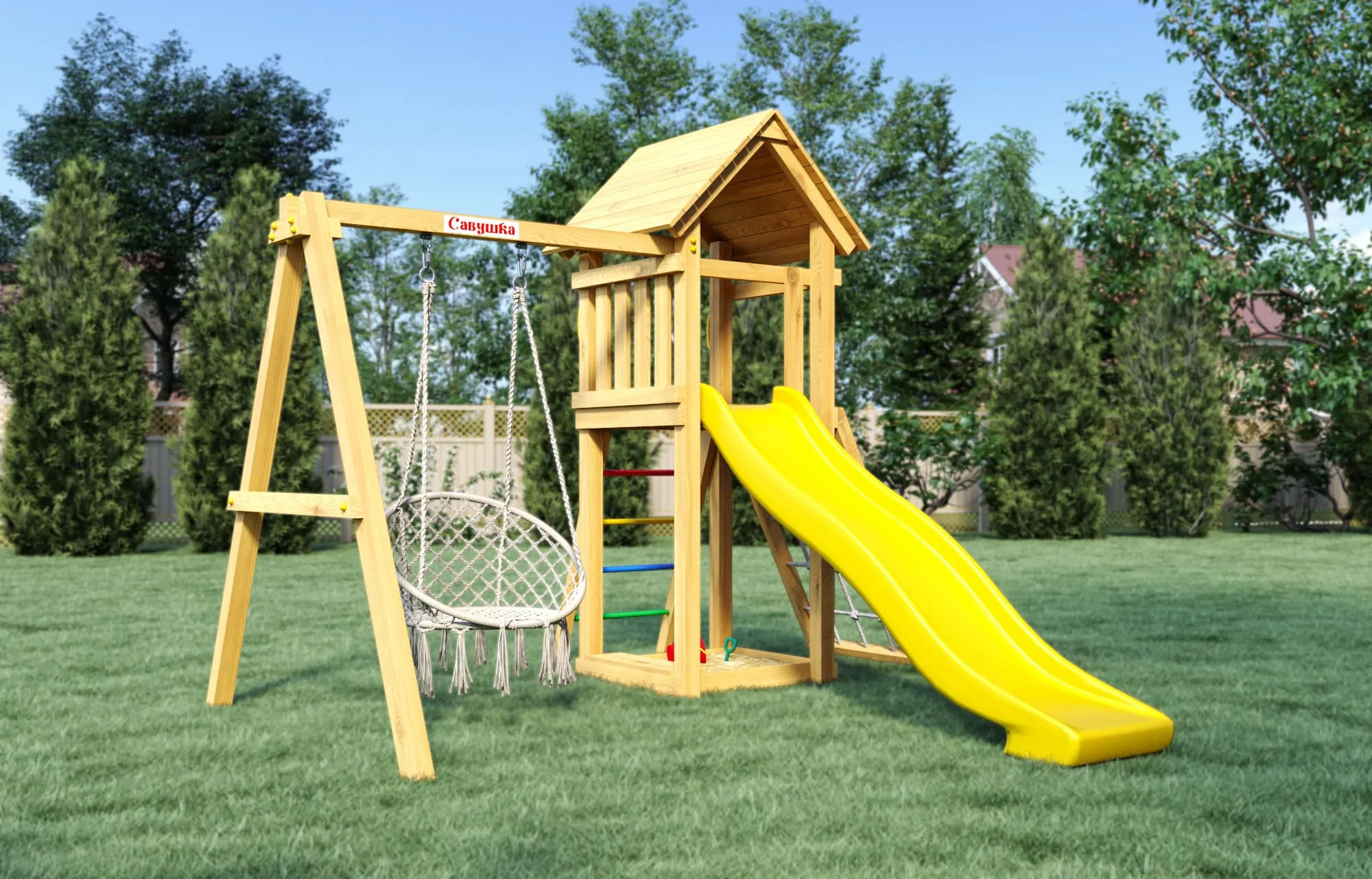 Площадка легко собирается — сами или с помощью профессиональной установки. Идеально подходит для дачи, загородного дома или частного участка.