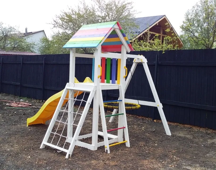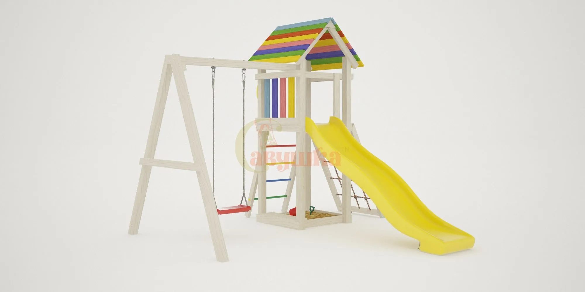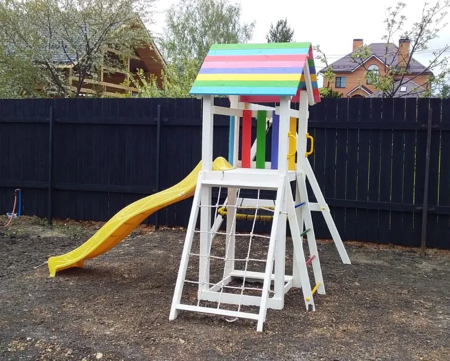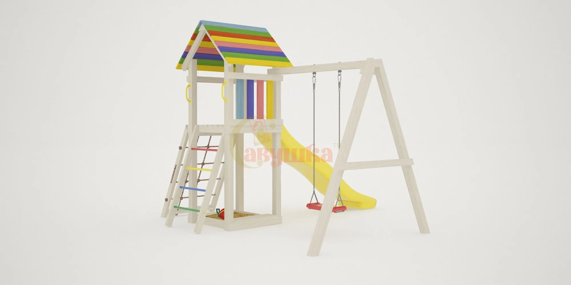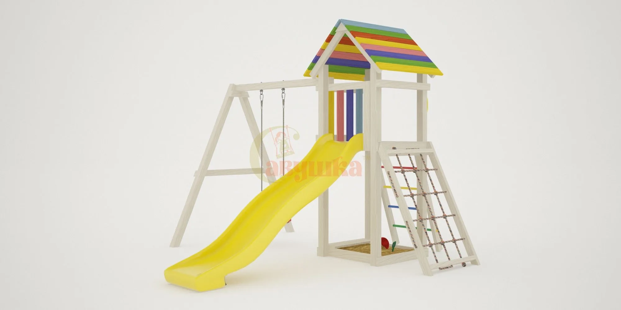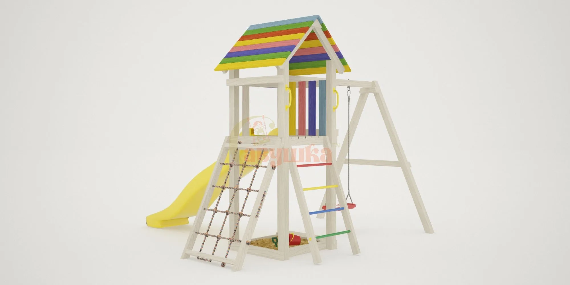 Центр площадки – башня, в основании которой находится песочница. Взбираться наверх можно по-разному: с помощью лестницы с разноцветными металлическими поперечинами либо по сетке-лазалке, которую поместили в раму для устойчивости.Домик закрыт сверху деревянным перекрытием – оно скрывает от прямых солнечных лучей и позволяет передохнуть на свежем воздухе. Комплекс универсален, поскольку включает в себя столь любимые детьми горку и качели (обычные, со спинкой или 3 в 1).