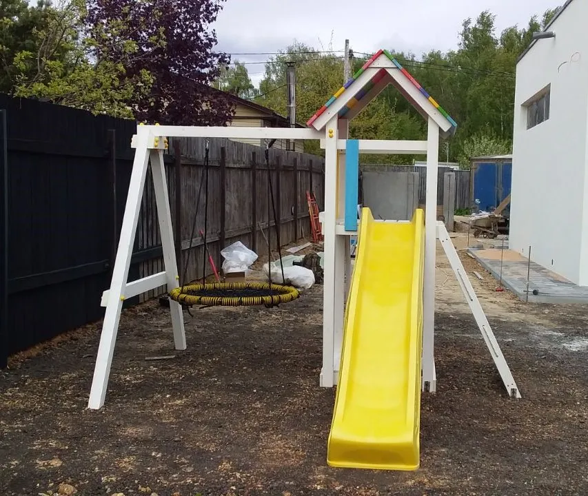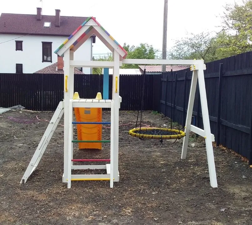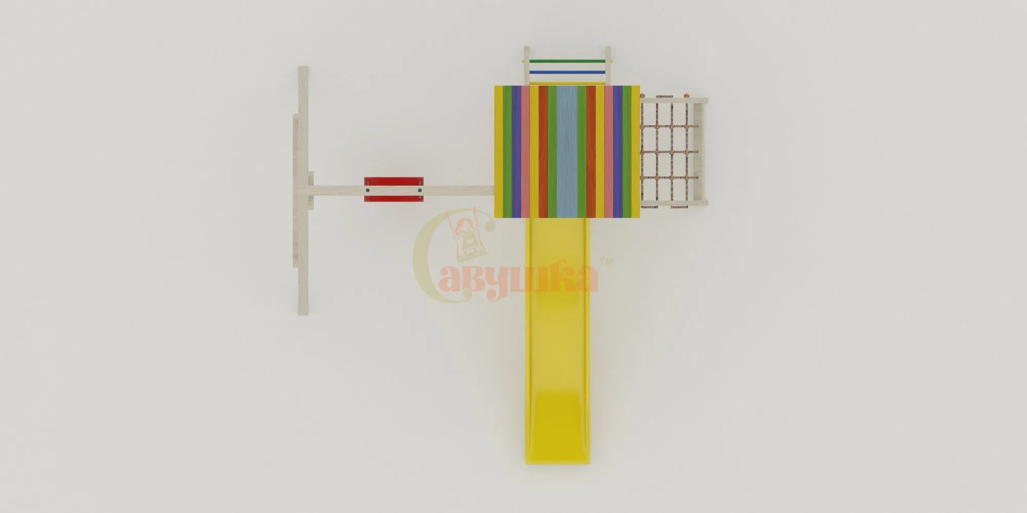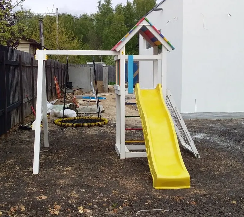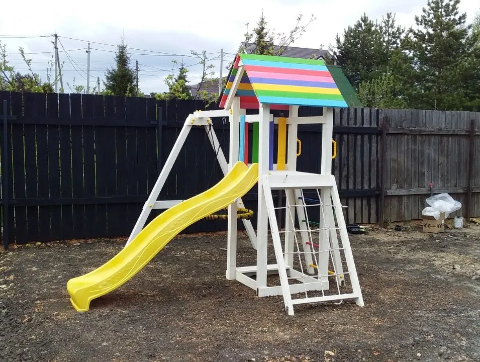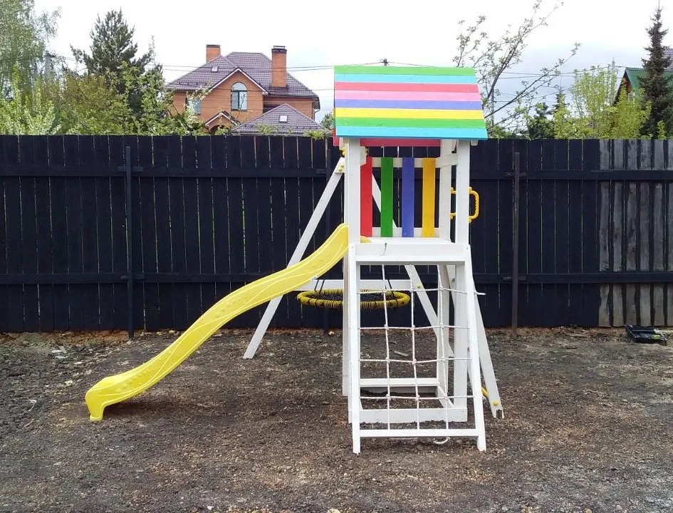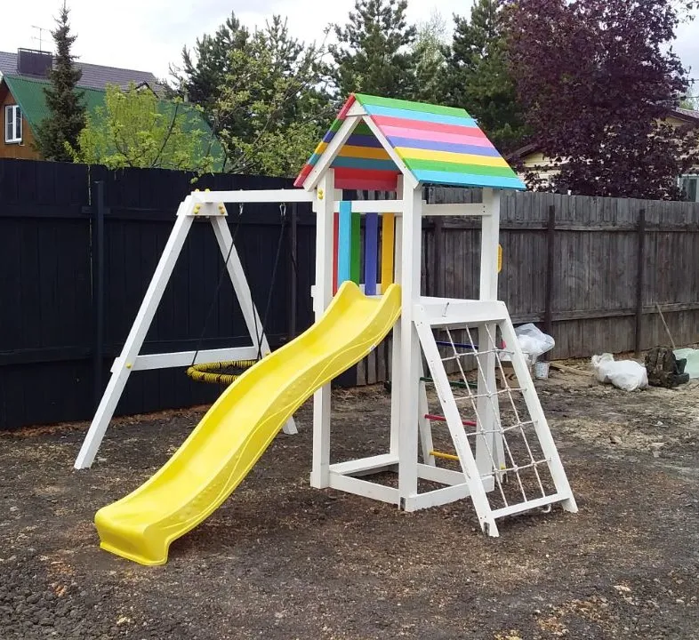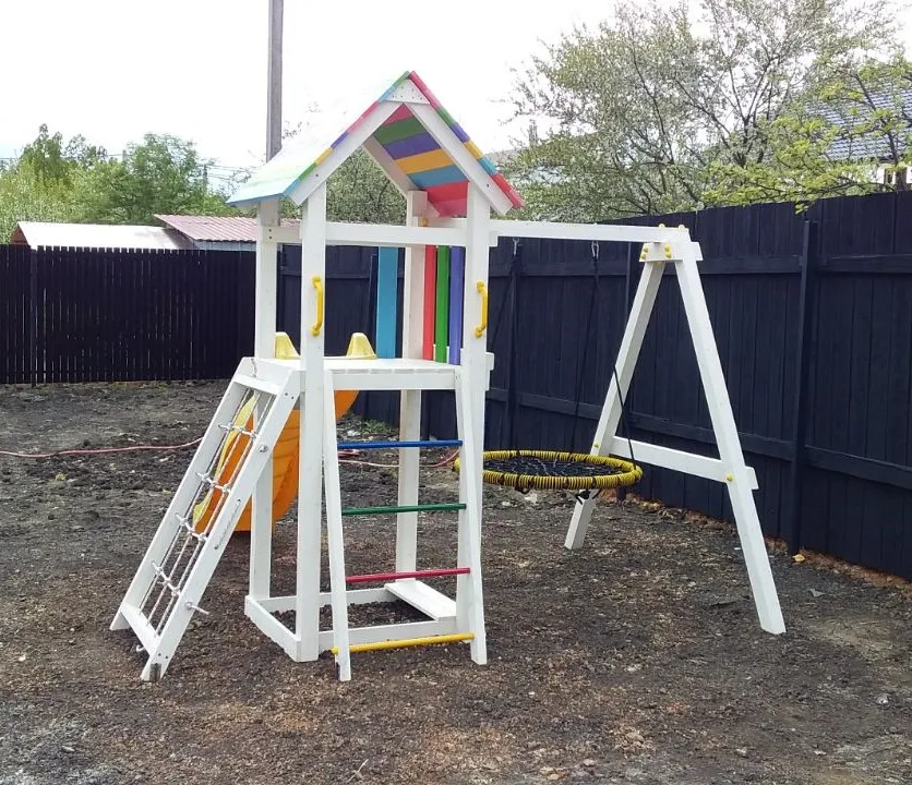 Центр площадки – башня, в основании которой находится песочница. Взбираться наверх можно по-разному: с помощью лестницы с разноцветными металлическими поперечинами либо по сетке-лазалке, которую поместили в раму для устойчивости.Домик закрыт сверху деревянным перекрытием – оно скрывает от прямых солнечных лучей и позволяет передохнуть на свежем воздухе. Комплекс универсален, поскольку включает в себя столь любимые детьми горку и качели (обычные, со спинкой или 3 в 1).
