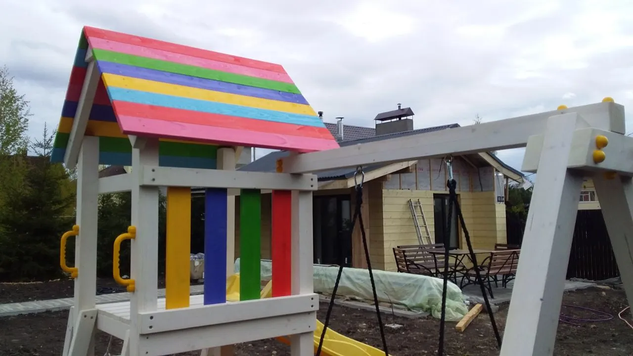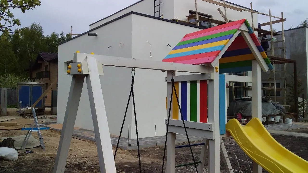 Российский производитель гарантирует сохранение геометрии рамы, ручается за навесное бельгийское оборудование и выбирает натуральные материалы, прошедшие сертификацию. Балки клееного бруса гладкие, острые края скруглены – отсутствие ран и ссадин важнее всего.