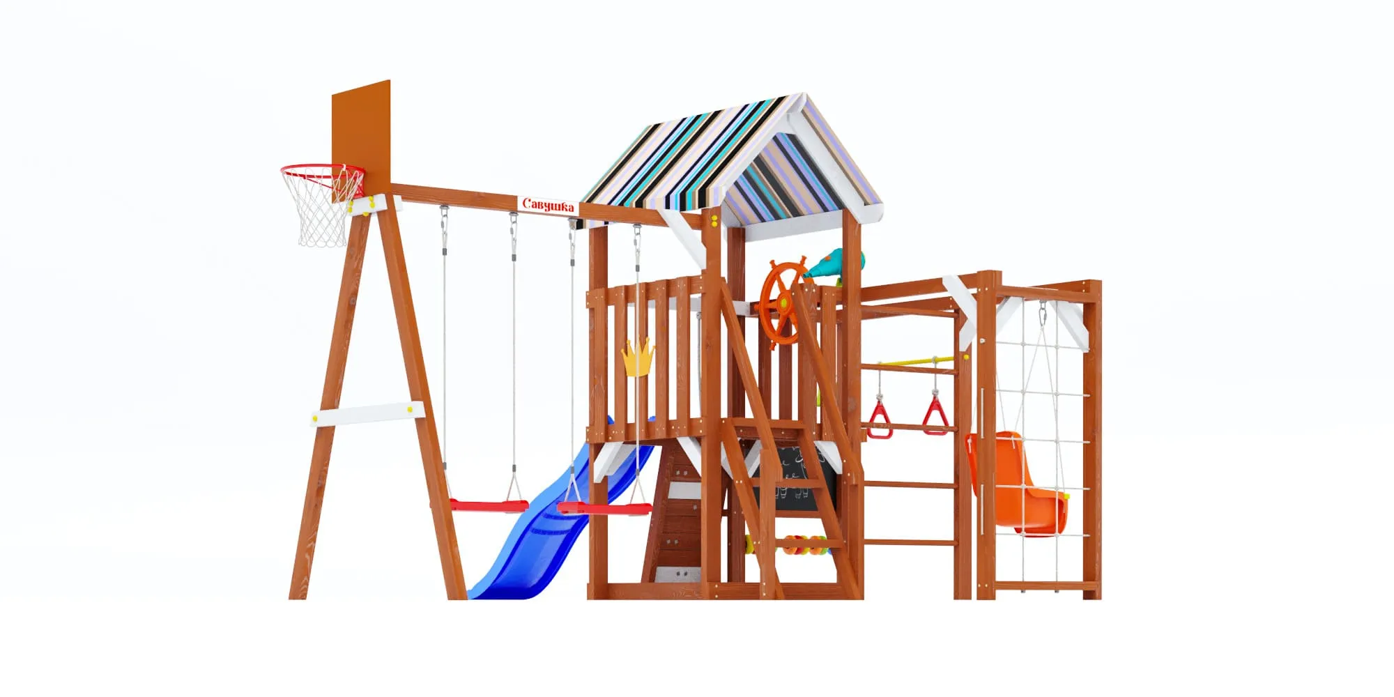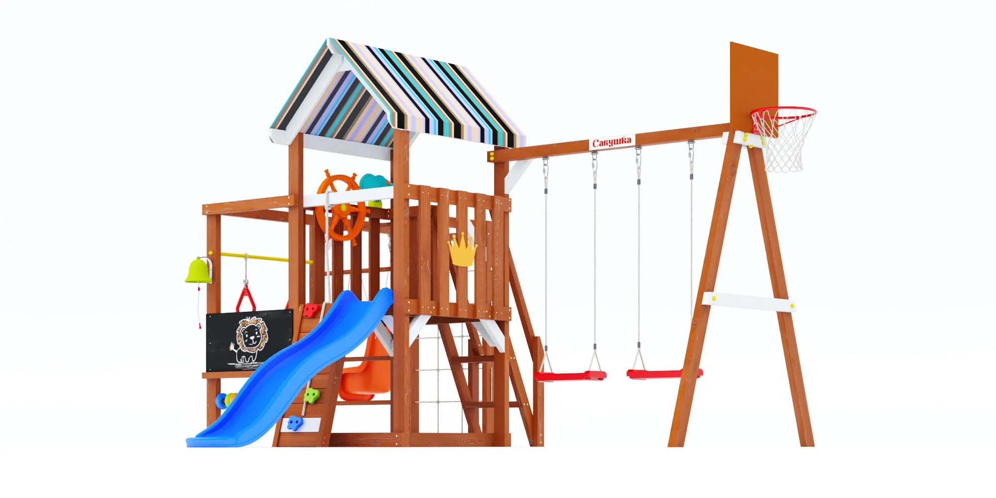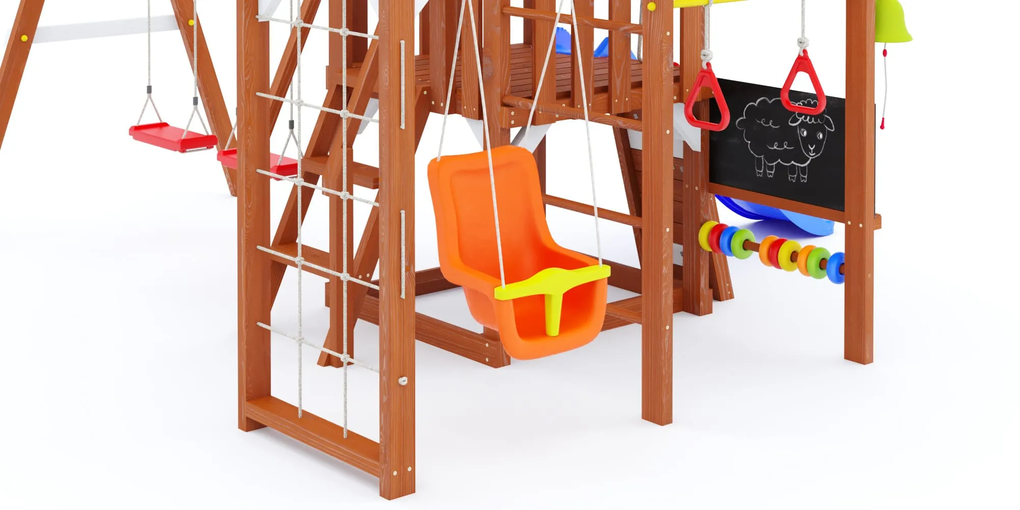 Подходит для установки в частном доме, на даче или во дворе. Благодаря двойной шлифовке и окрашиванию сертифицированными составами, конструкция безопасна даже для самых маленьких.