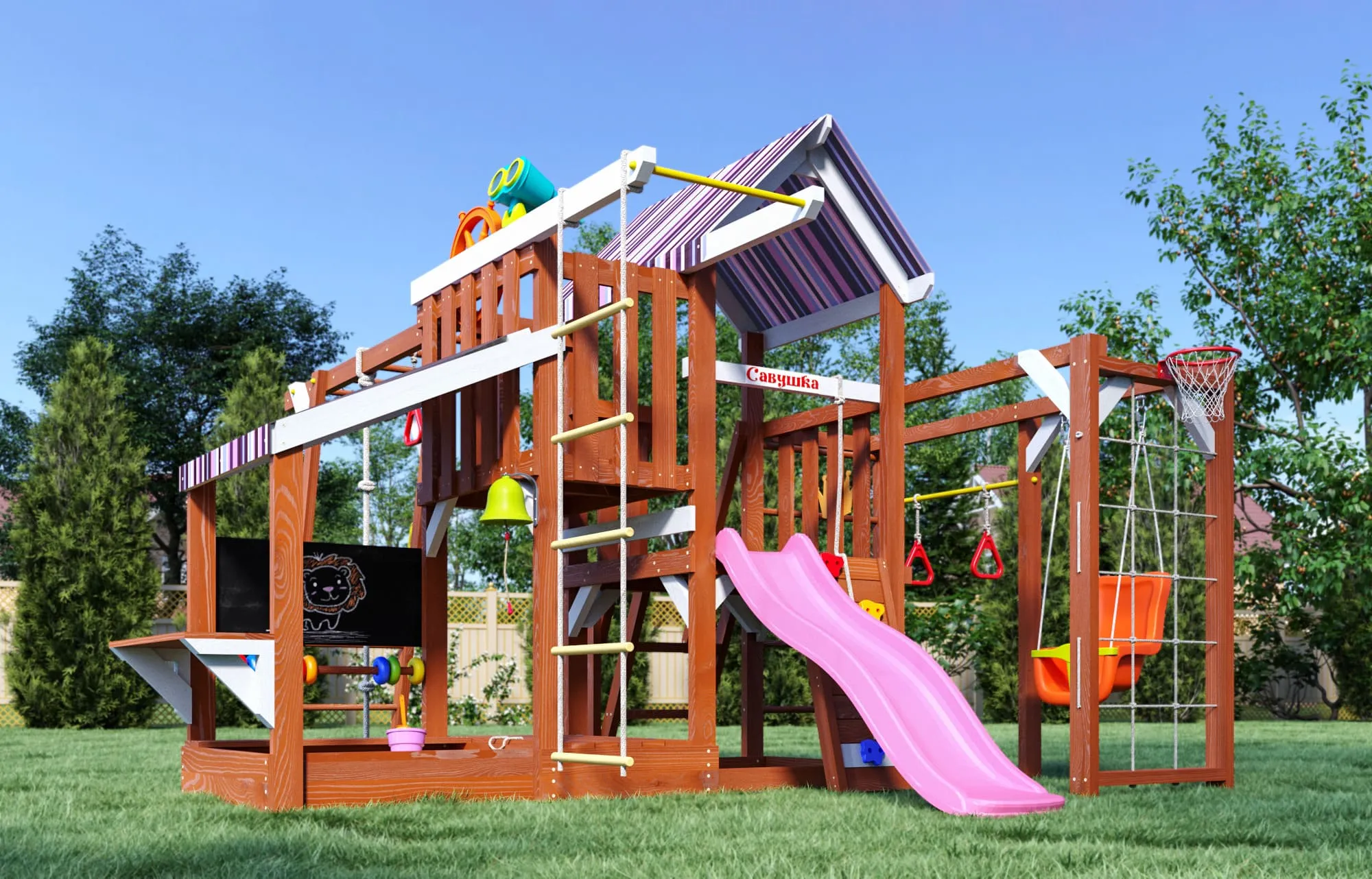 — Цвет крыши и горки на выбор (см. в каталоге): синий, салатовый или розовый