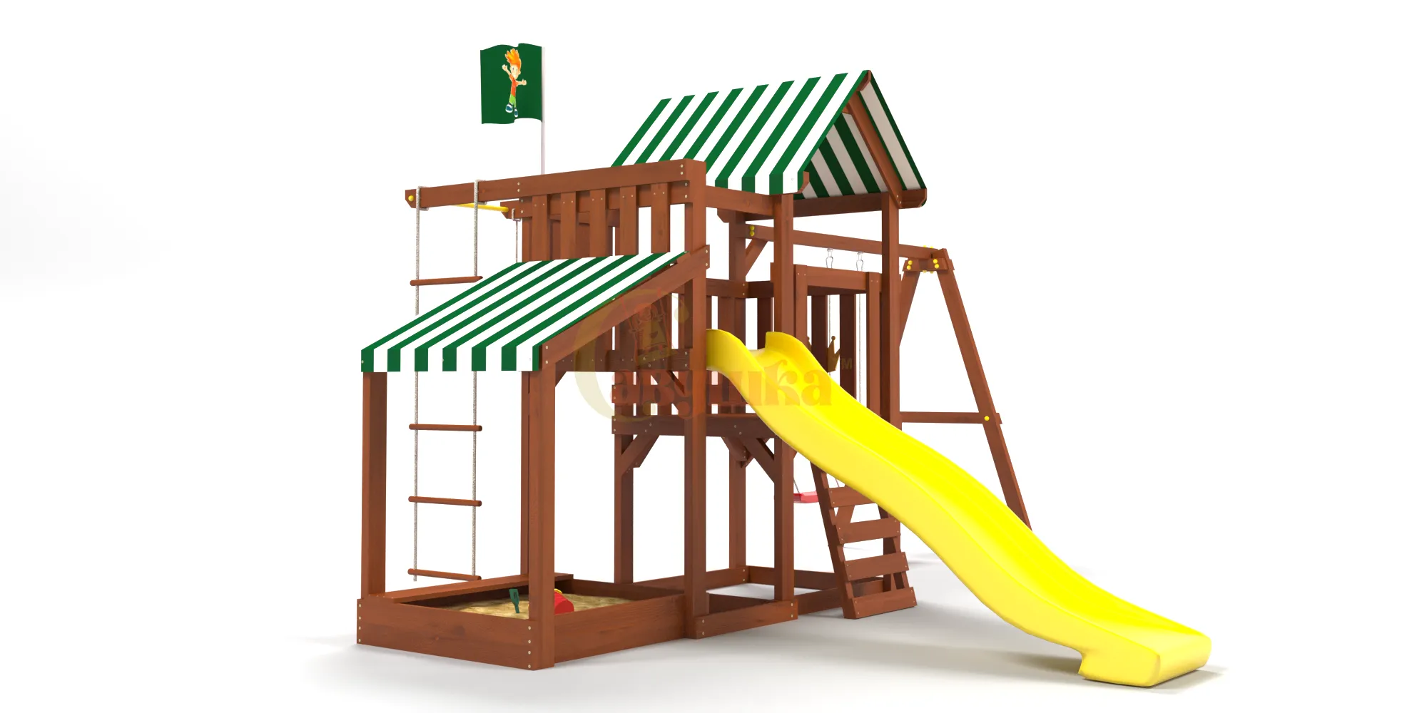 Эта модель — результат тщательной работы дизайнеров, инженеров и заботливых родителей. Каждая деталь отшлифована вручную. Покрытие — от мирового бренда Sherwin-Williams, безопасное даже для самых маленьких. Горка из Бельгии, прочный брус, крепления по ГОСТ — всё продумано до мелочей.