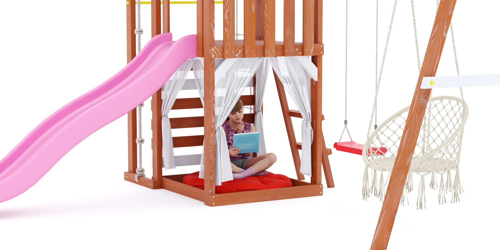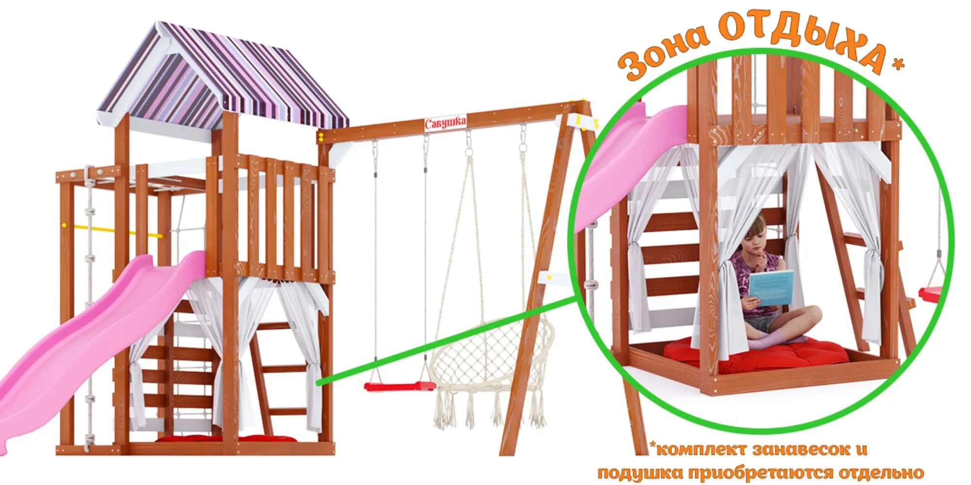 К площадке можно приобрести набор декоративных занавесок и подушку — создайте ещё более уютное игровое пространство для ребёнка.