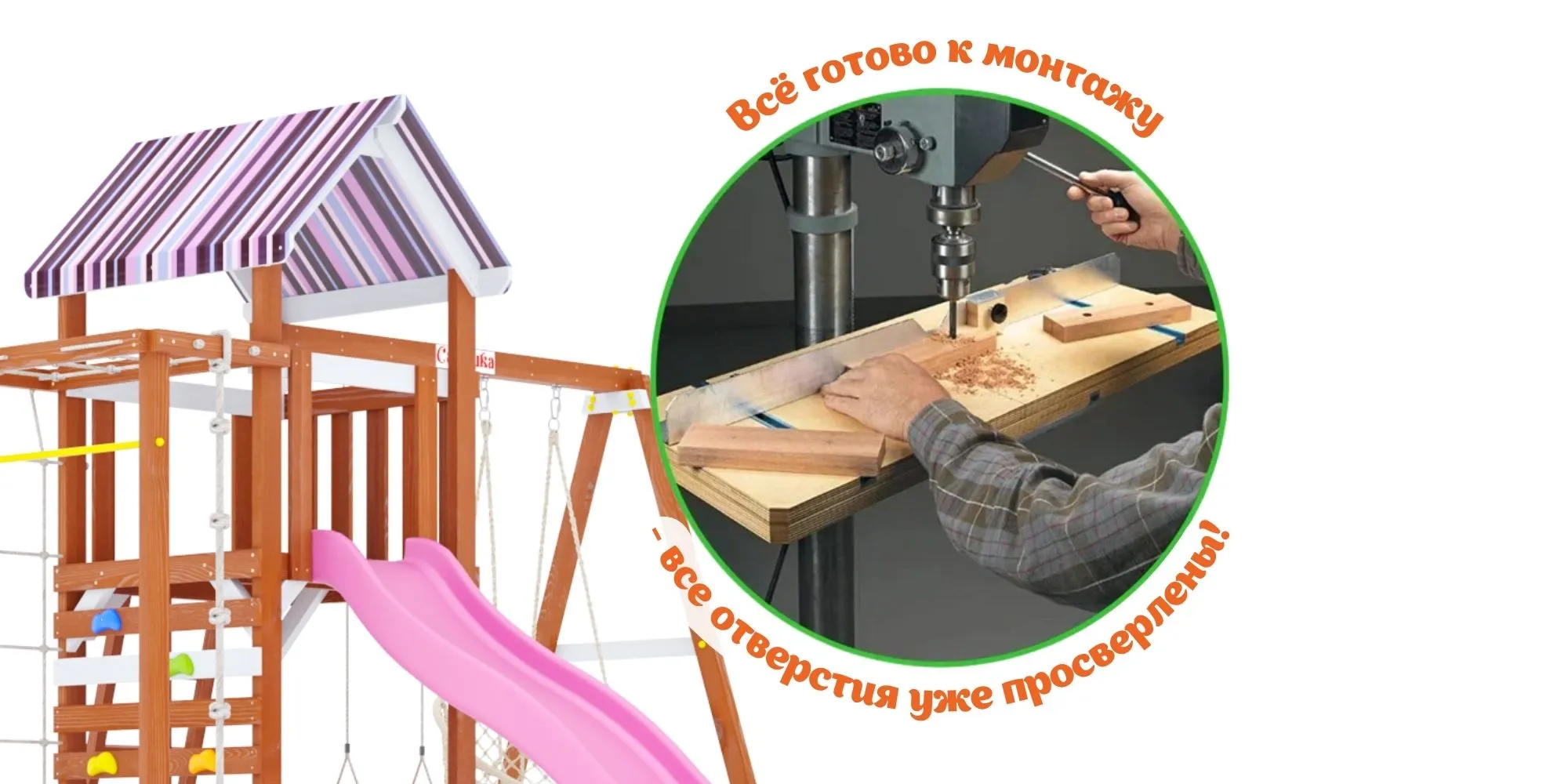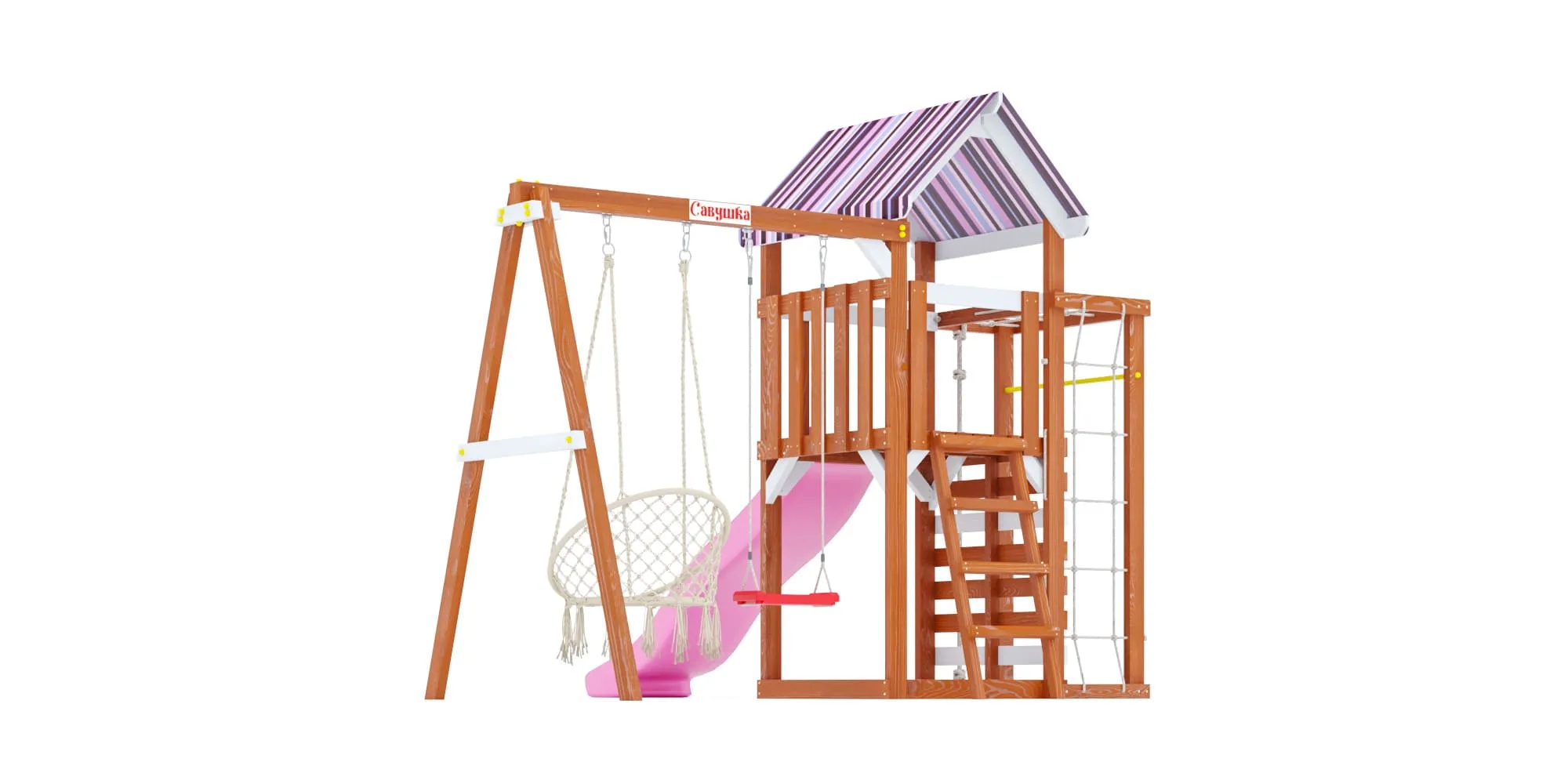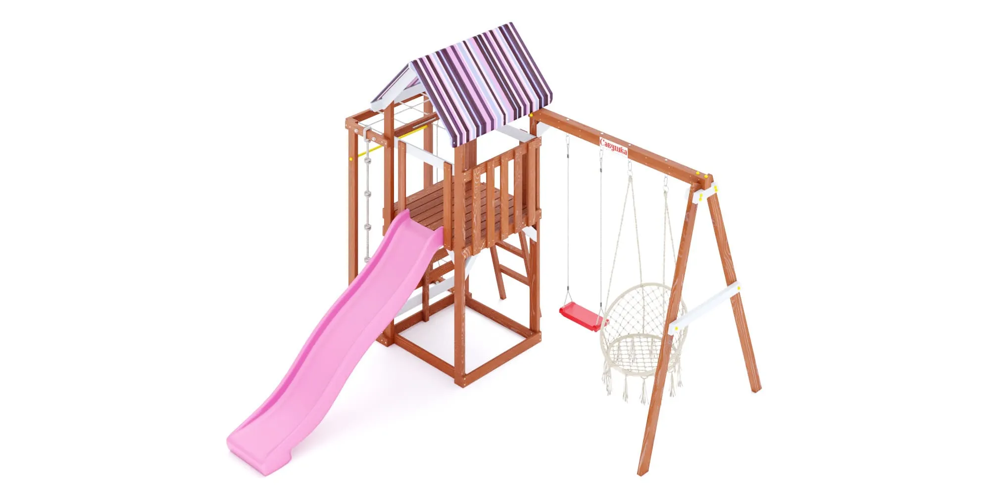 Подходит детям от 3 лет, выдерживает серьёзную нагрузку (до 300 кг на подвесах), легко собирается и вписывается даже в компактные участки. Все элементы прошли европейскую и российскую сертификацию, безопасны и долговечны.