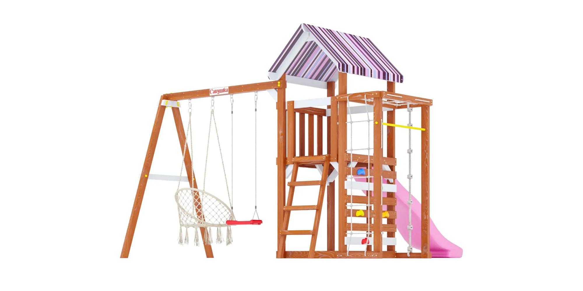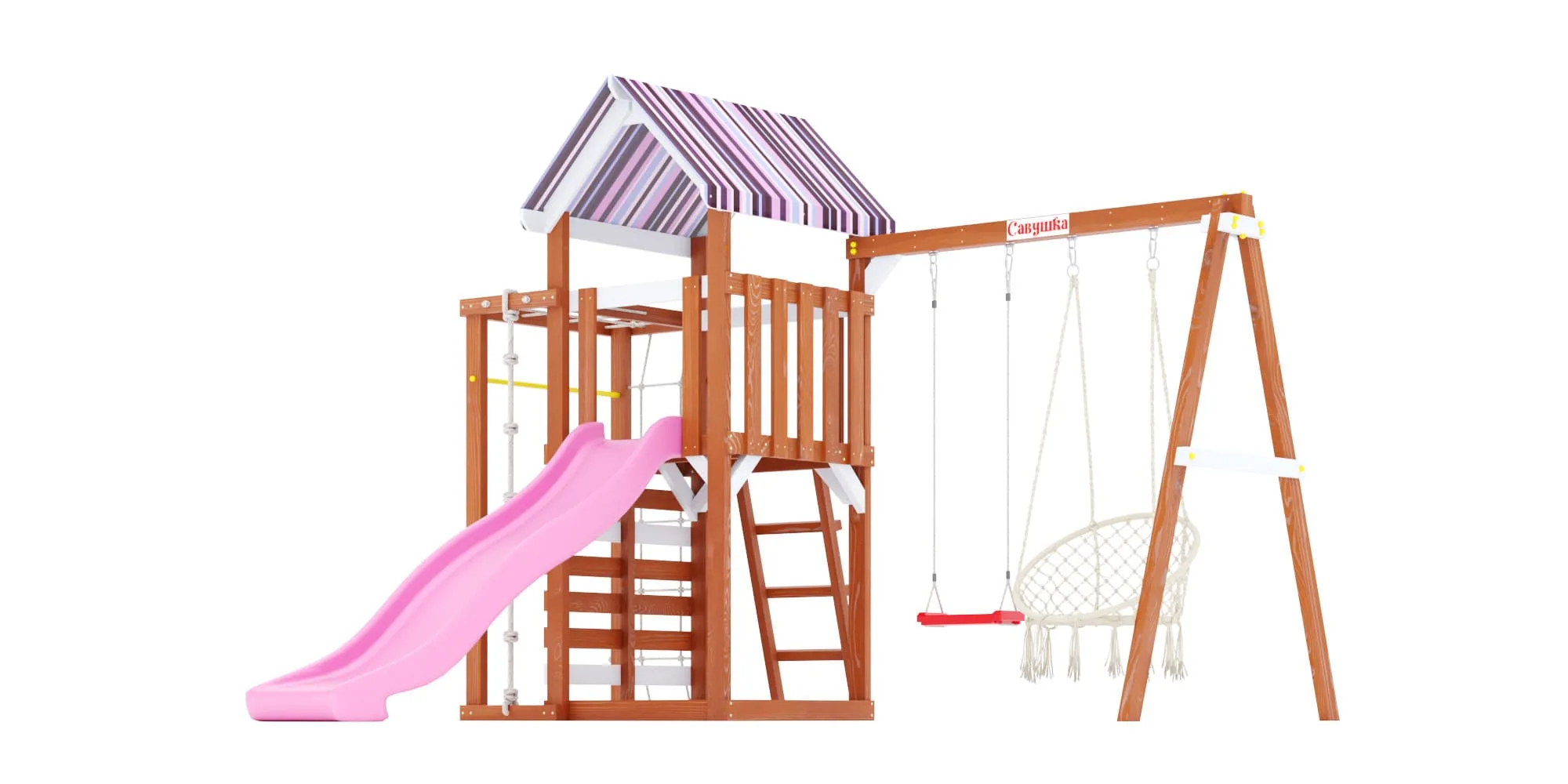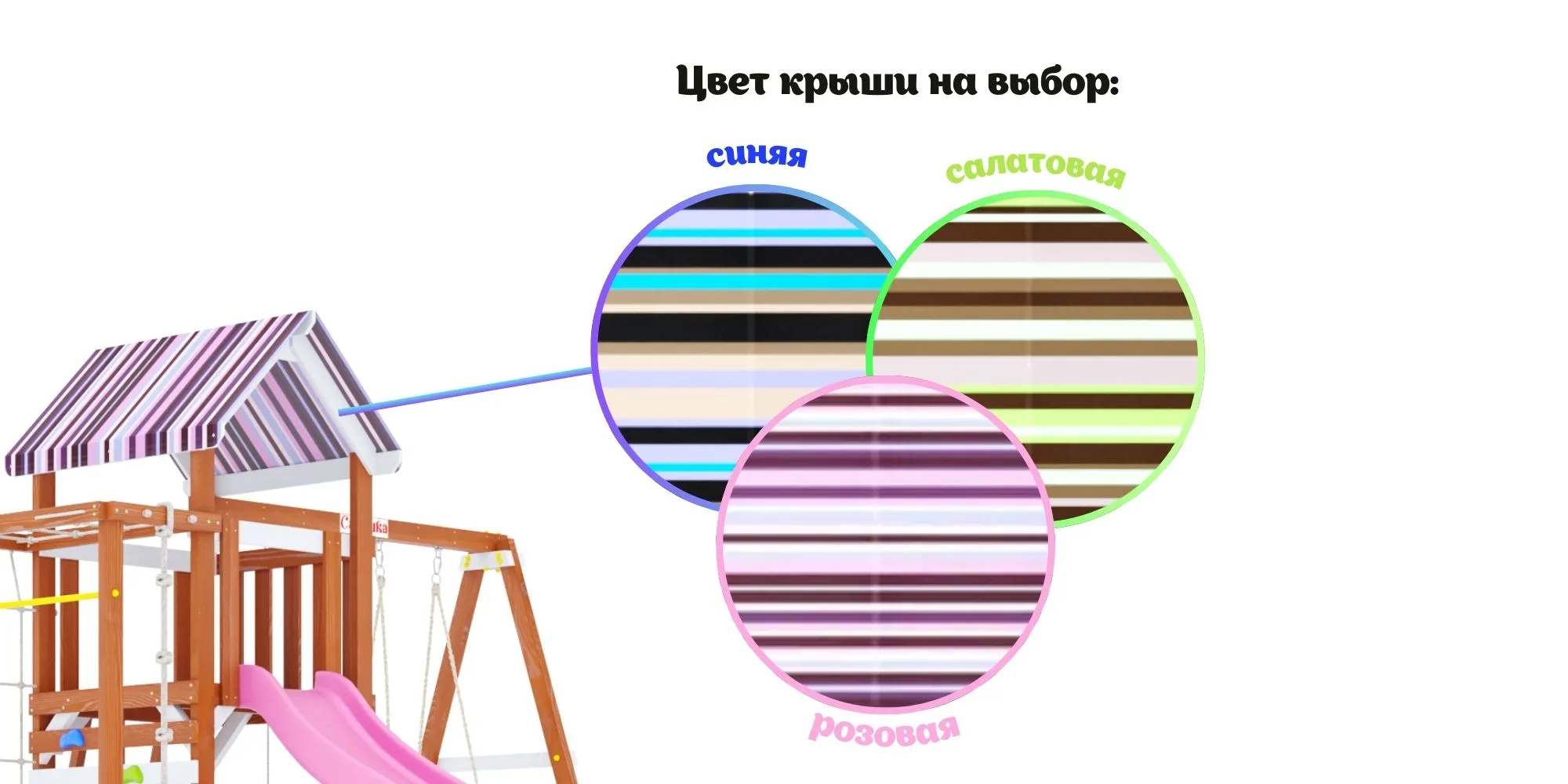 - Площадка окрашена в тёплый цвет махагон с белыми акцентами, а крыша и горка представлены в трёх расцветках на выбор (см. в каталоге): синий, салатовый или розовый.