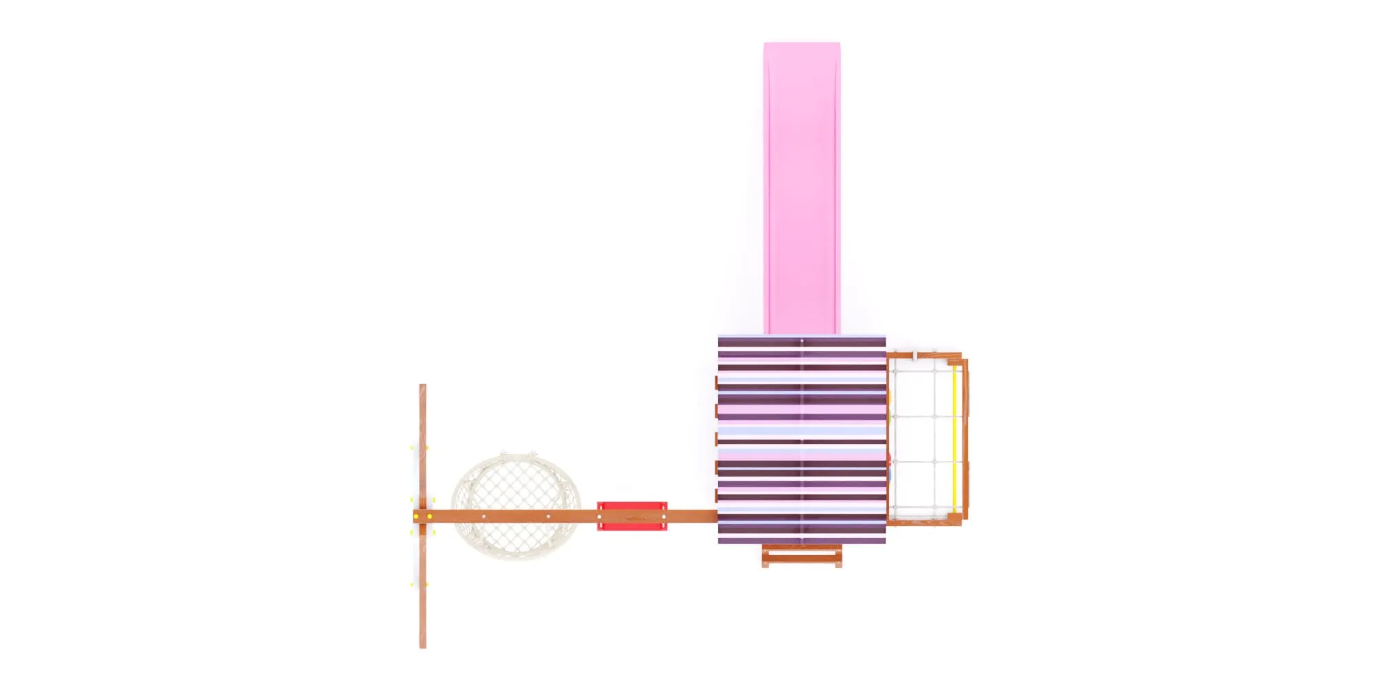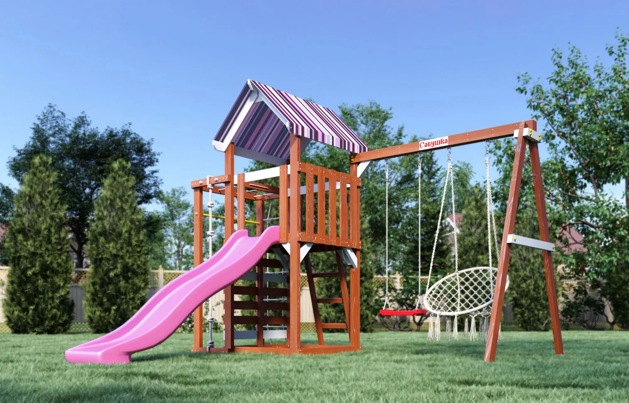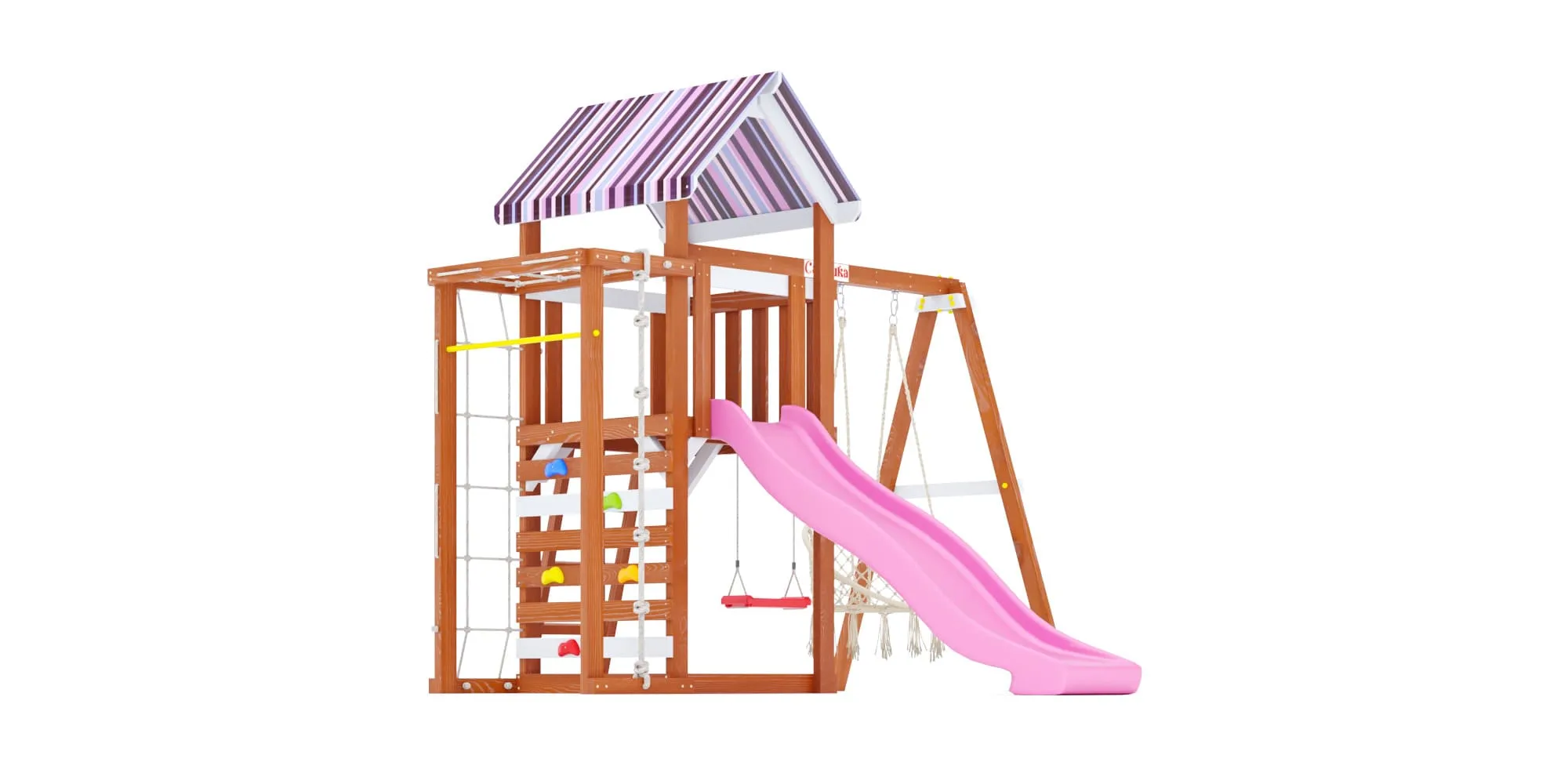 - Площадка окрашена в тёплый цвет махагон с белыми акцентами, а крыша и горка представлены в трёх расцветках на выбор (см. в каталоге): синий, салатовый или розовый.