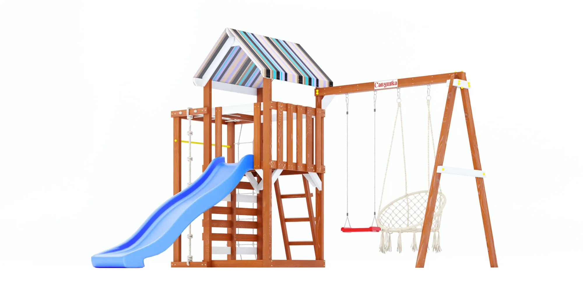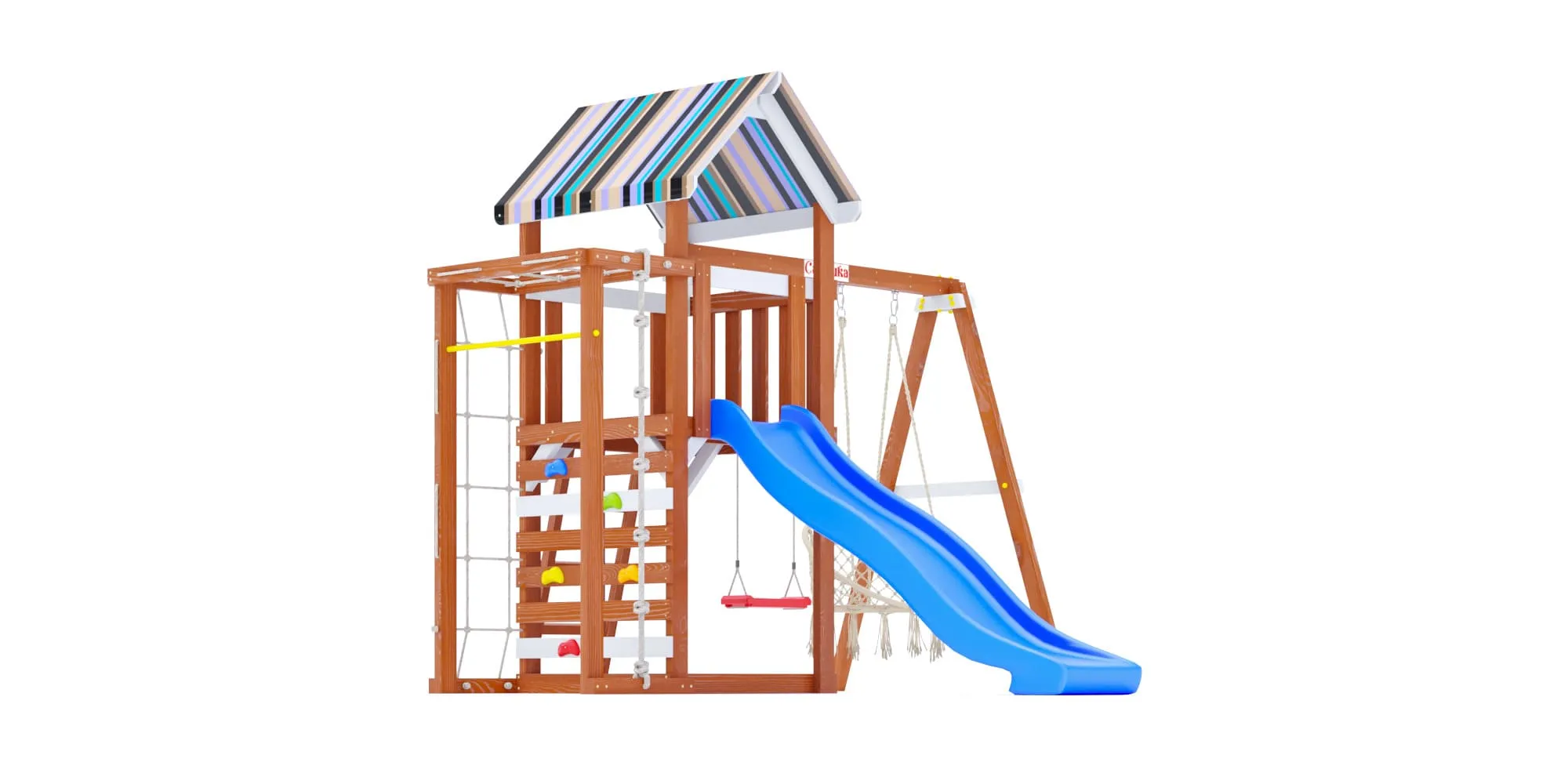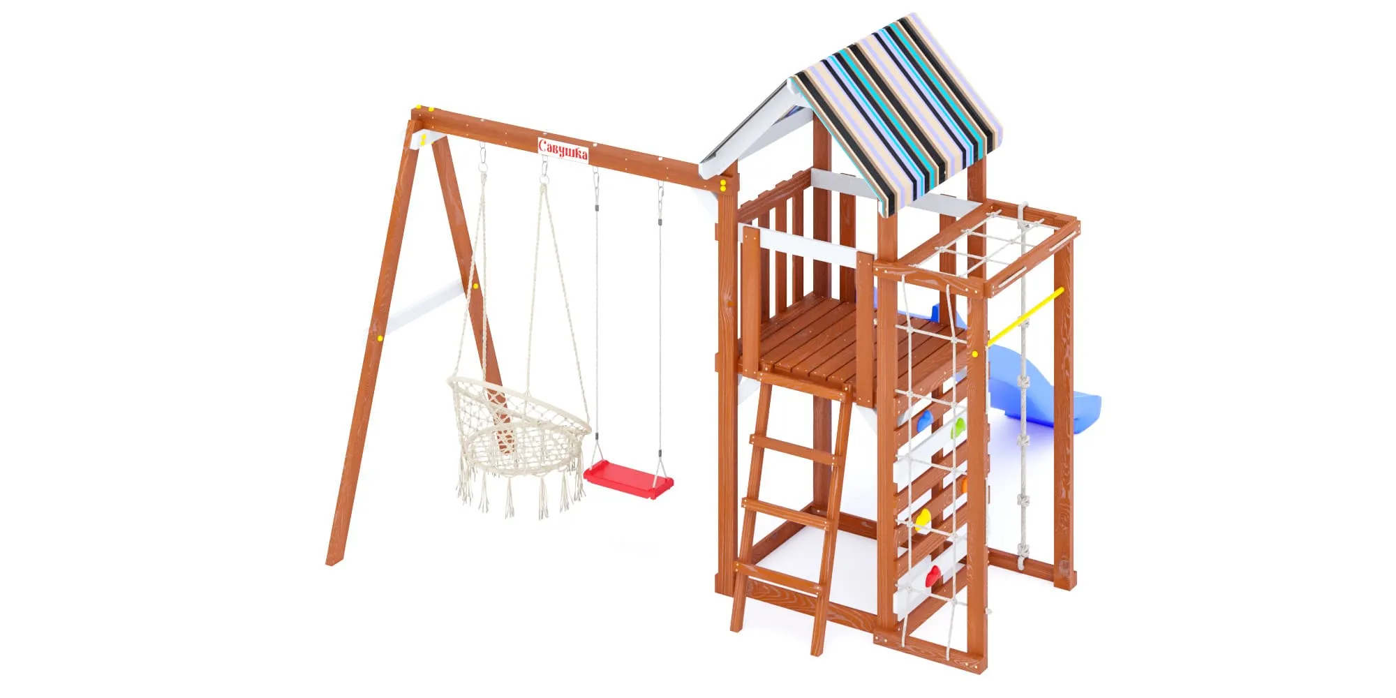 - Площадка окрашена в тёплый цвет махагон с белыми акцентами, а крыша и горка представлены в трёх расцветках на выбор (ищи в каталоге): синий, салатовый или розовый.