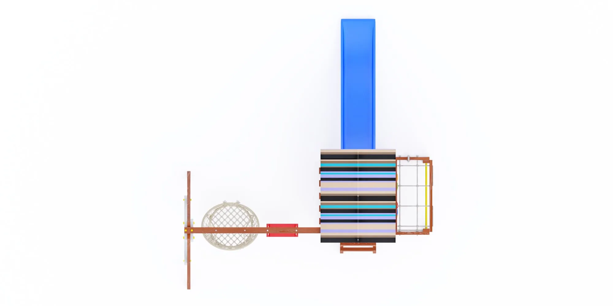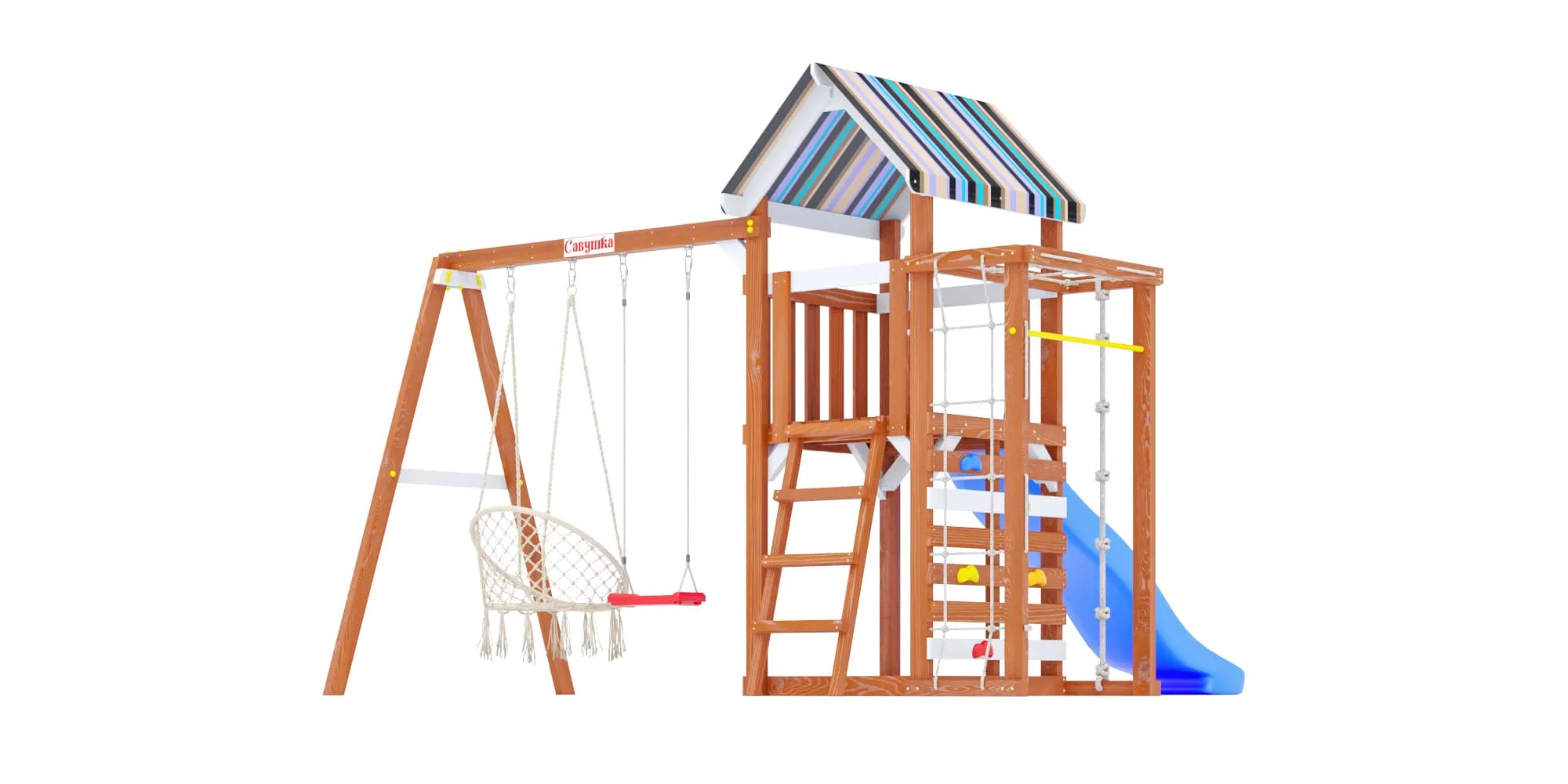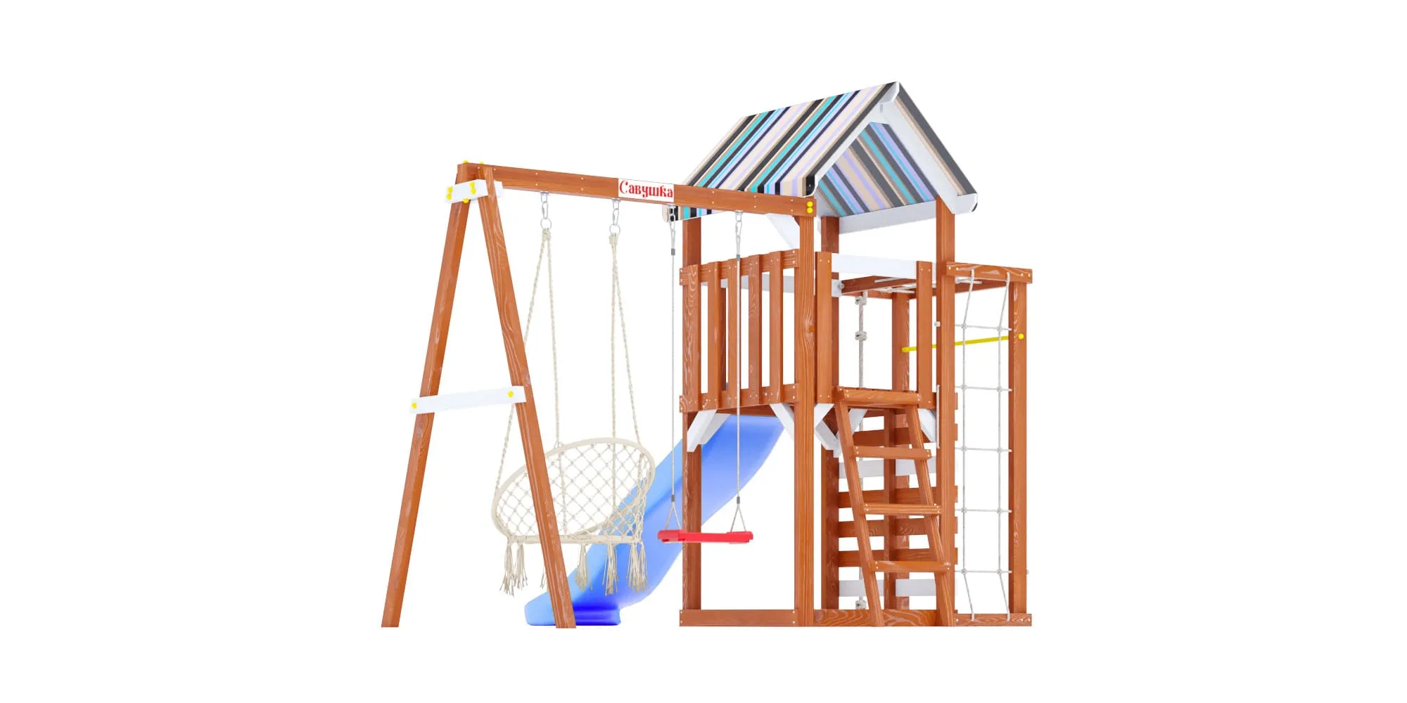 - Площадка окрашена в тёплый цвет махагон с белыми акцентами, а крыша и горка представлены в трёх расцветках на выбор (ищи в каталоге): синий, салатовый или розовый.