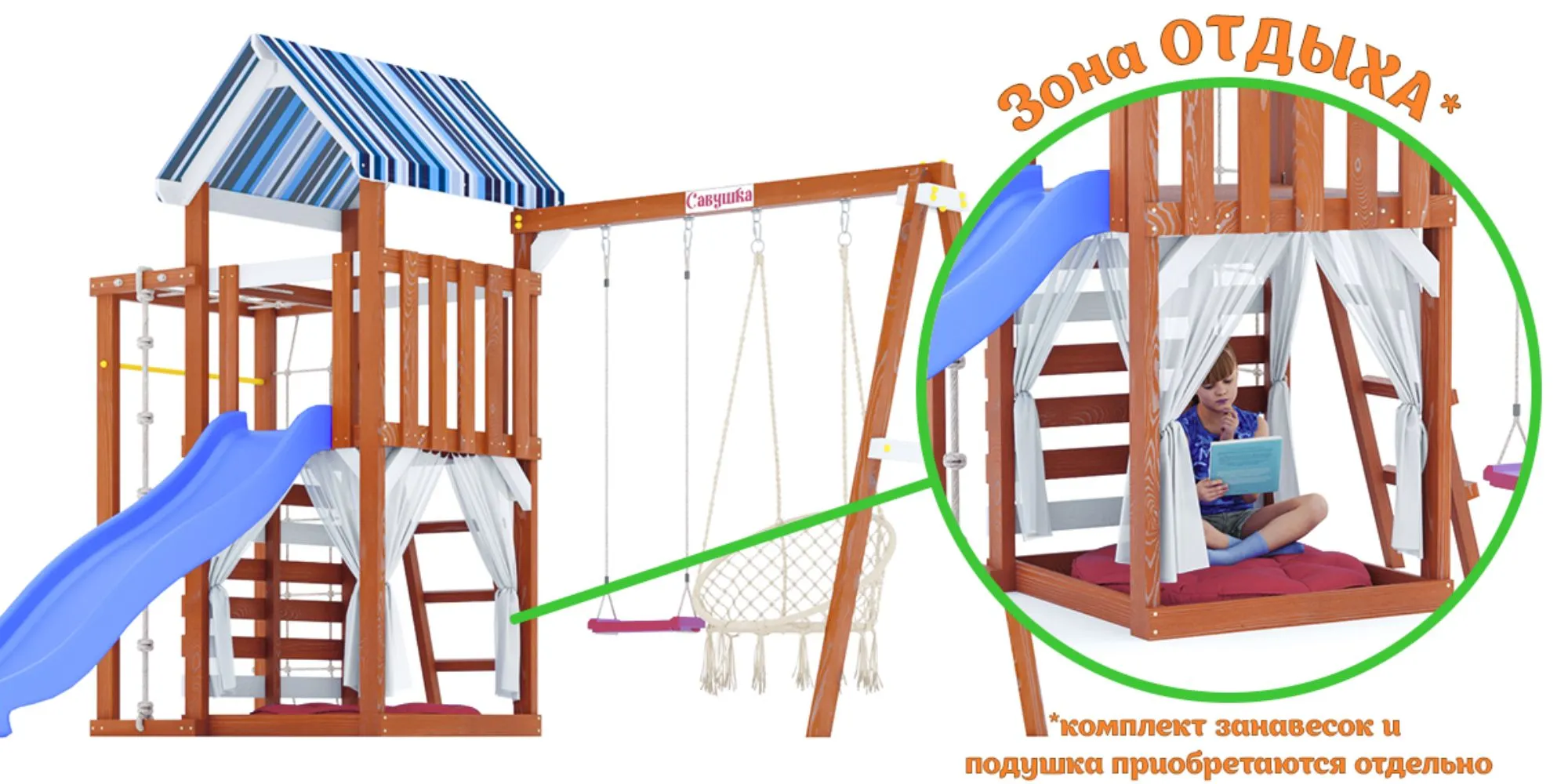 К площадке можно приобрести набор декоративных занавесок и подушку — создайте ещё более уютное игровое пространство для ребёнка.