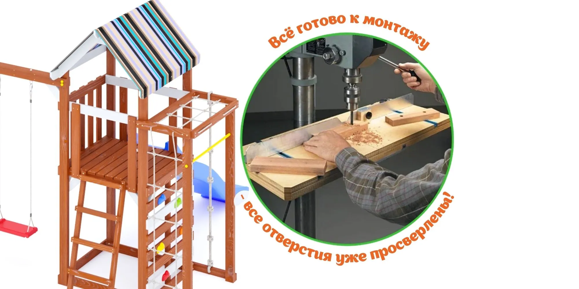 - Надёжные материалы: дерево, сертифицированный пластик (Бельгия), усиленные подвесы, устойчивые к УФ и влажности.