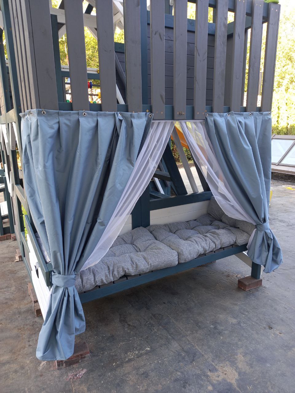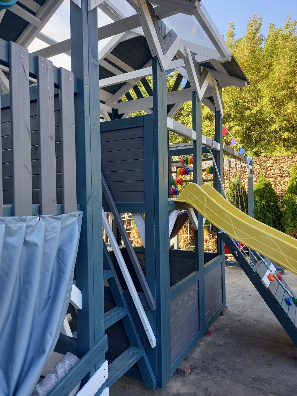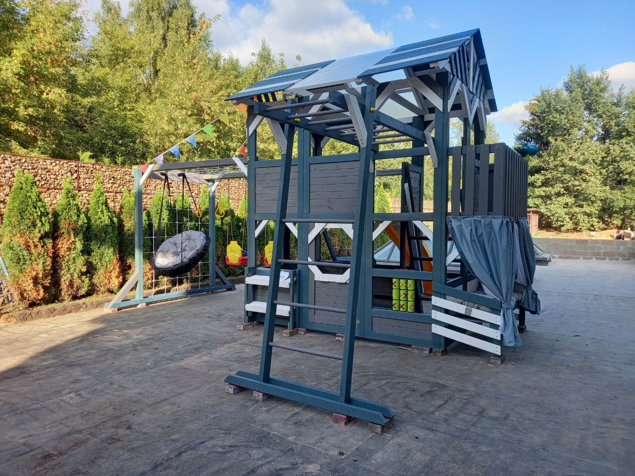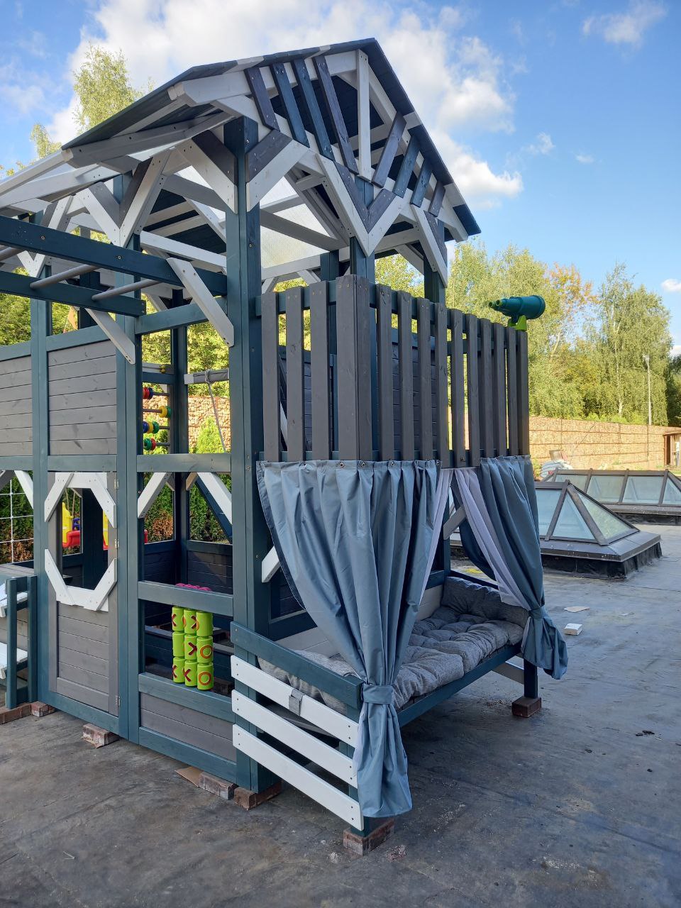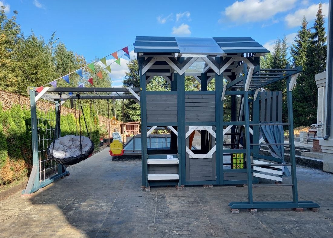 Цветовая палитра PlayHouse-3 выполнена в стильных и современных оттенках: серый индиго, белый и светло-серый. Такое сочетание гармонично впишется в любой двор, подчёркивая утончённый вкус и заботу о красоте детского пространства.