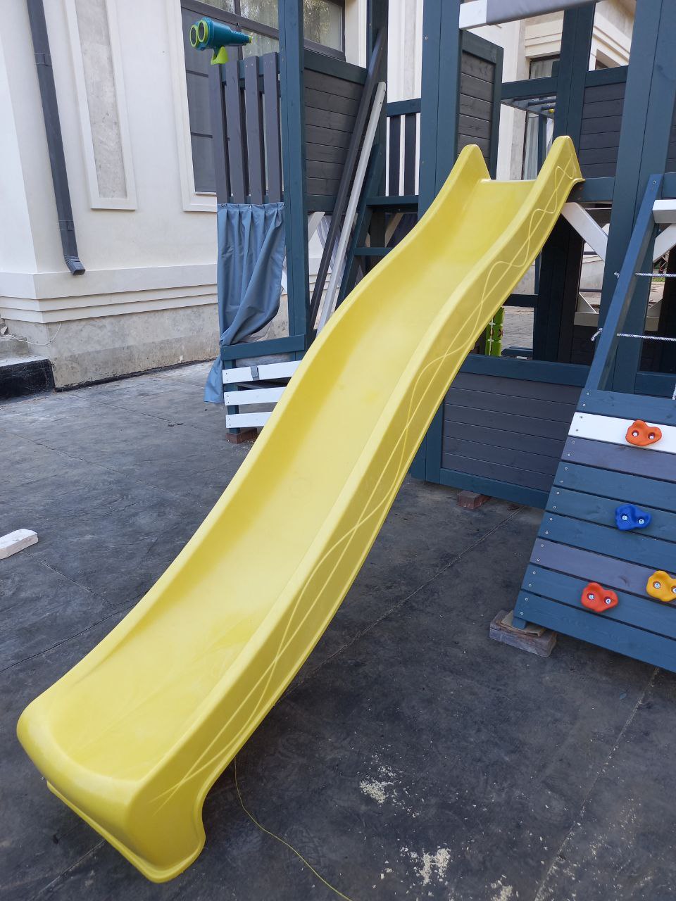 - Горка усилена рёбрами жёсткости и может быть подключена к воде для летнего мини-аквапарка. Подвесное кресло обеспечивает удобство и безопасность.