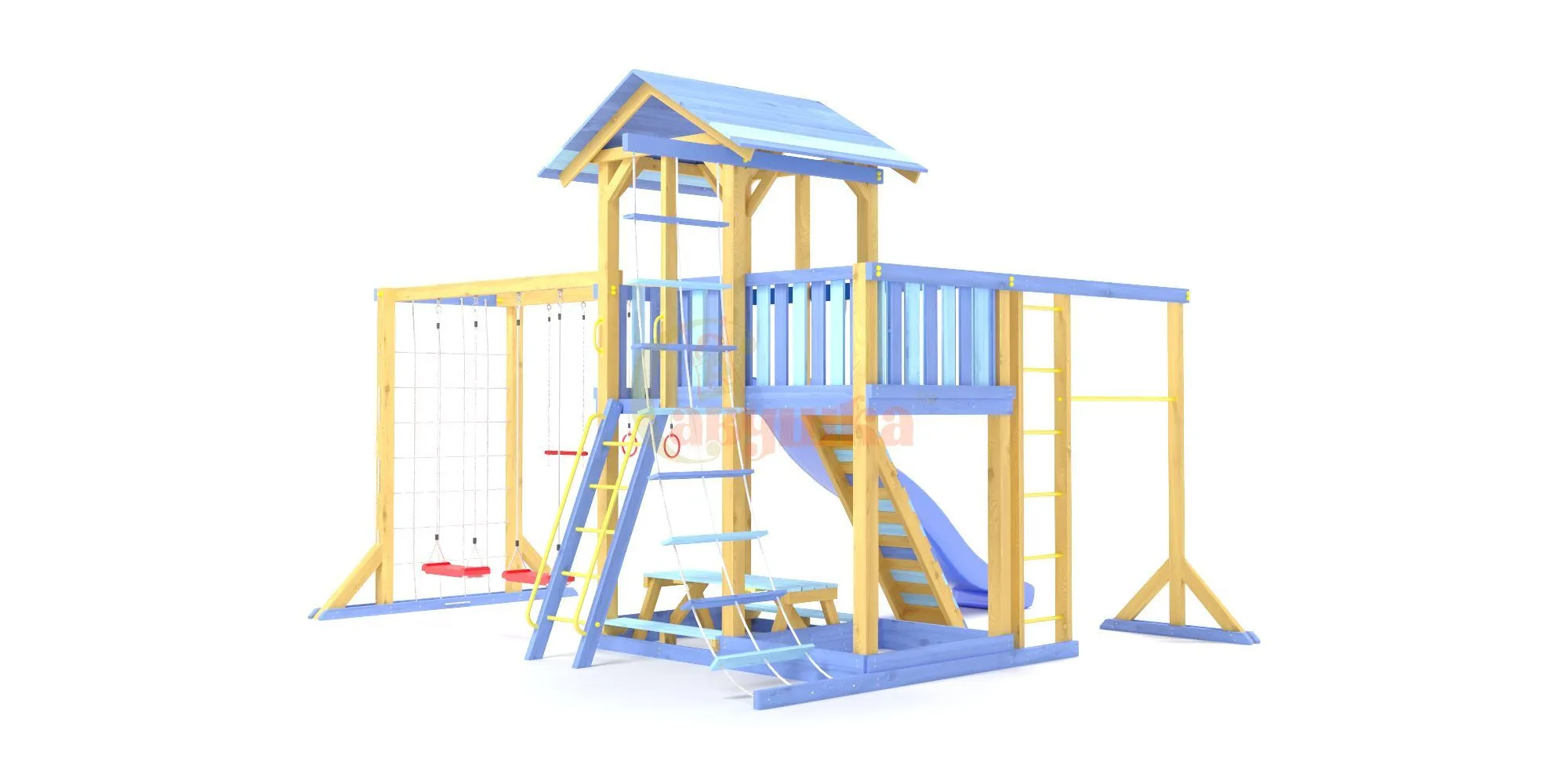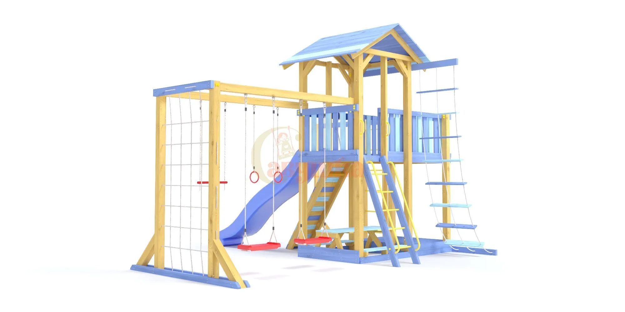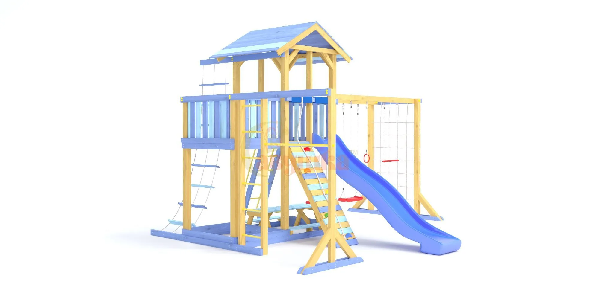 Каркас комплекса выполнен из сосны и окрашен в яркие цвета – сиреневый и голубой в сочетании с натуральным цветом конструктива. Горка выполнена в синем цвете, что придает комплексу стильный и современный вид. В стандартной комплектации предусмотрена дизайнерская деревянная крыша из трех гармоничных цветов.