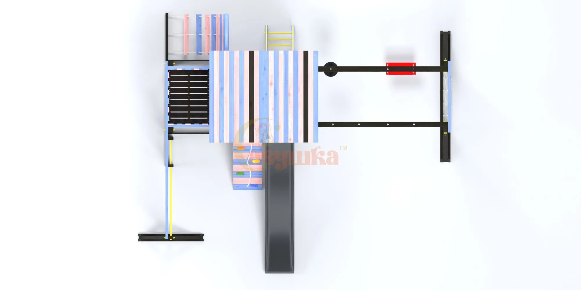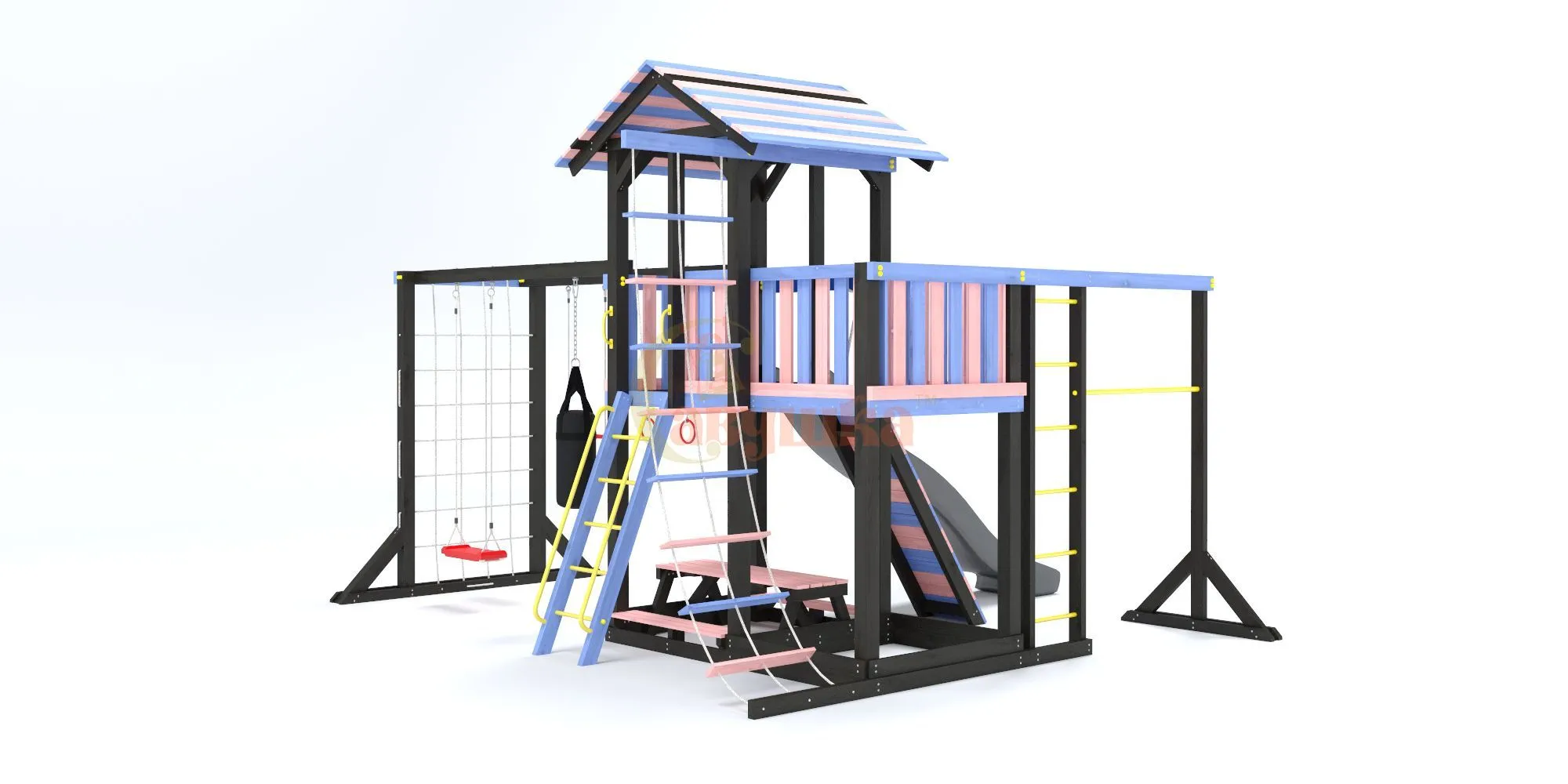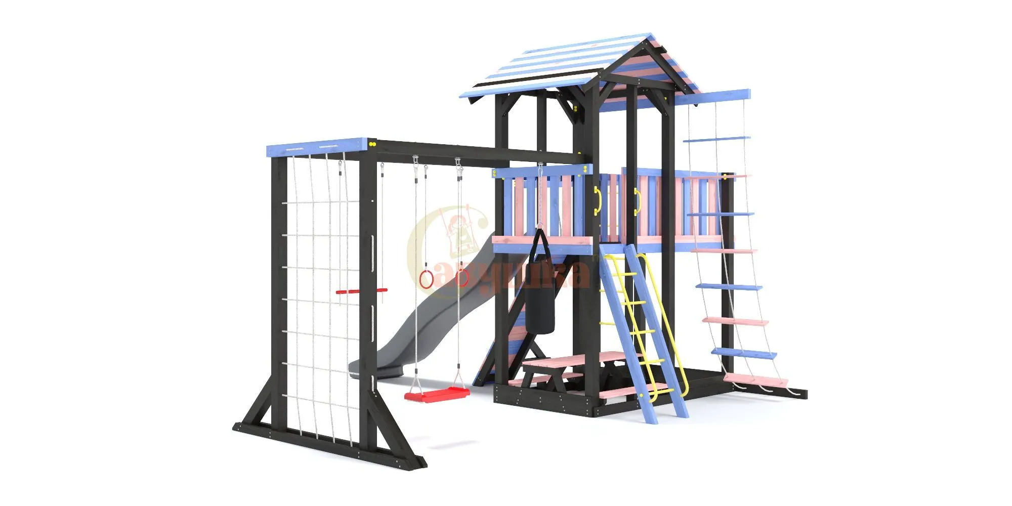 В комплекте игровой площадки имеется все необходимое оборудование – горка, качели, трапеция, кольца гимнастические и боксерская груша, которые подходят как для малышей, так и для более активных детей. Кроме того, на площадке имеется столик с лавочками для рисования или игры в куклы.
