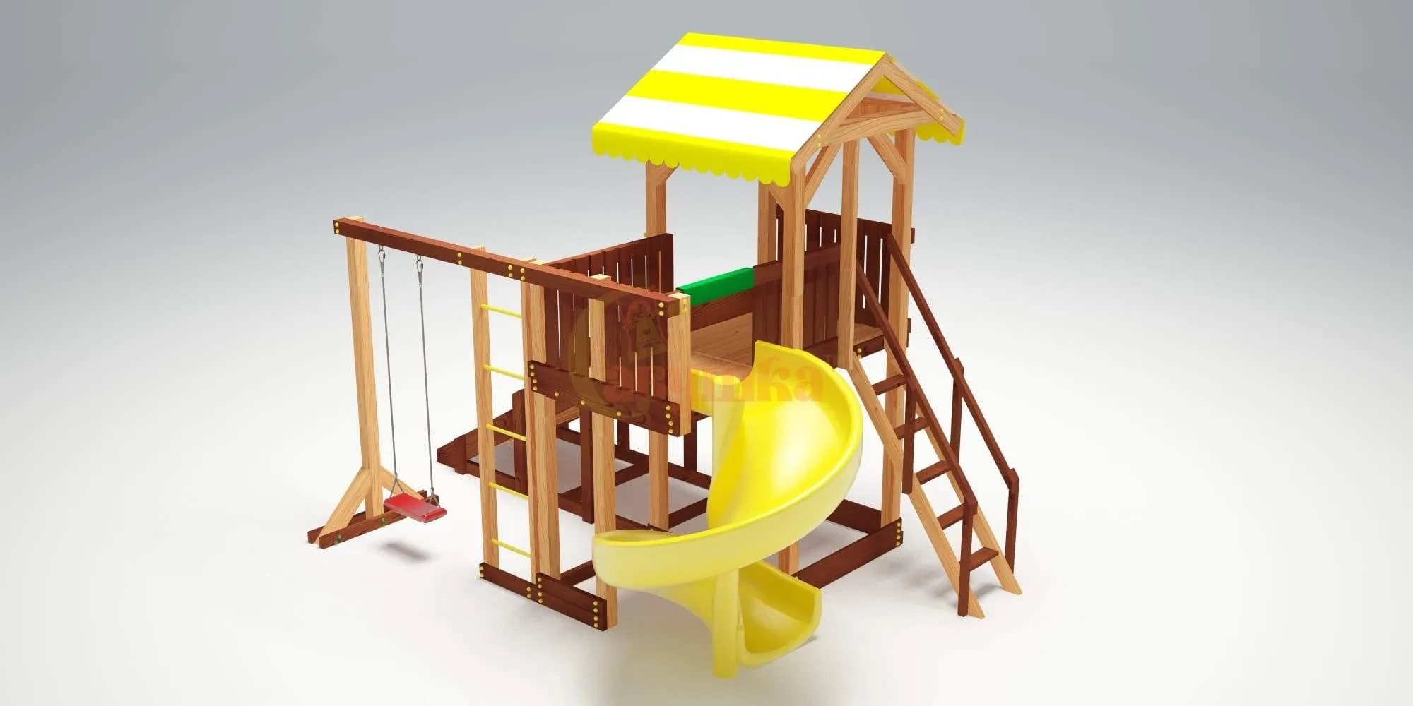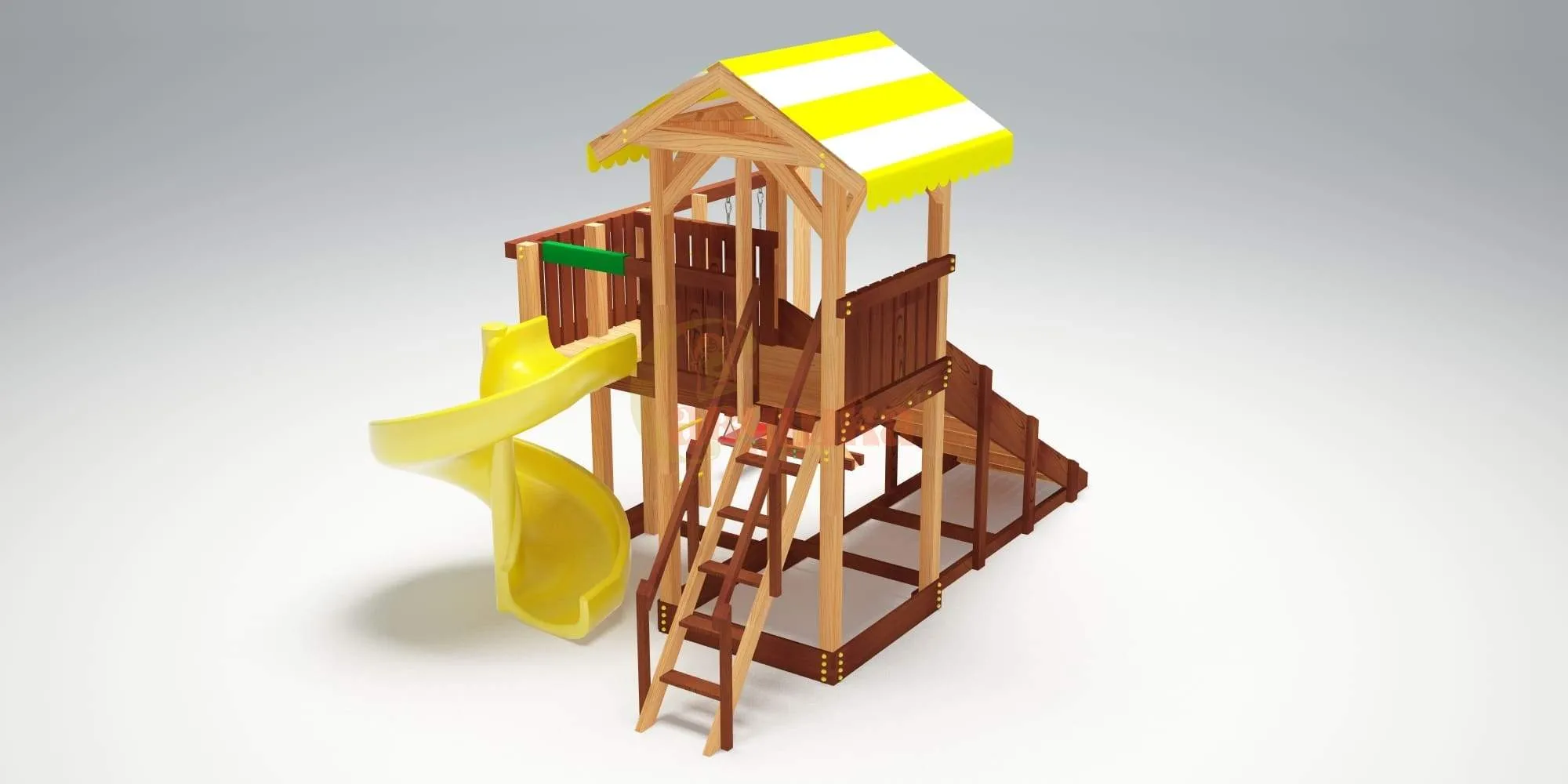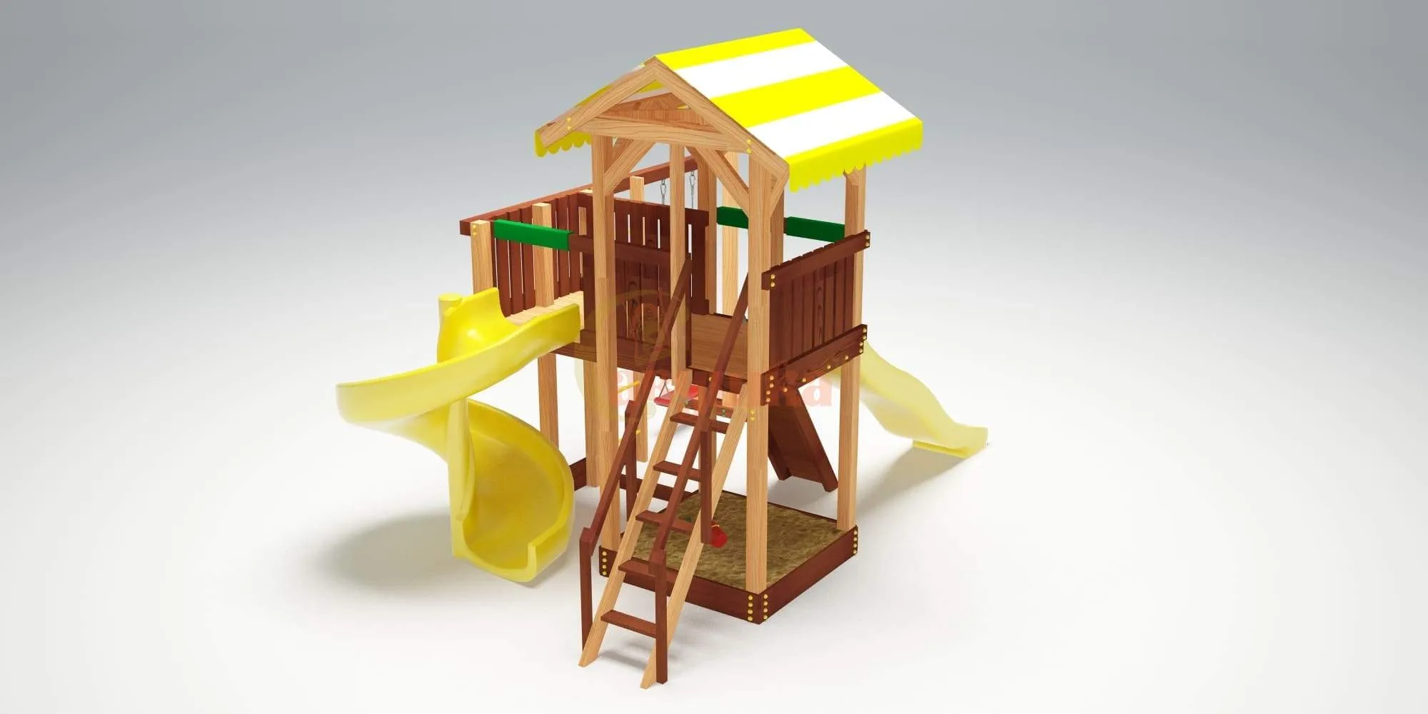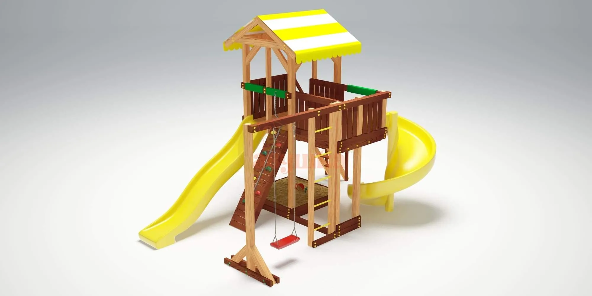 Конструкция выполнена из клеёного бруса 90×90 мм и окрашена сертифицированной краской на водной основе. Скруглённые углы, мягкие заглушки и надёжные перила обеспечивают полную безопасность для детей.