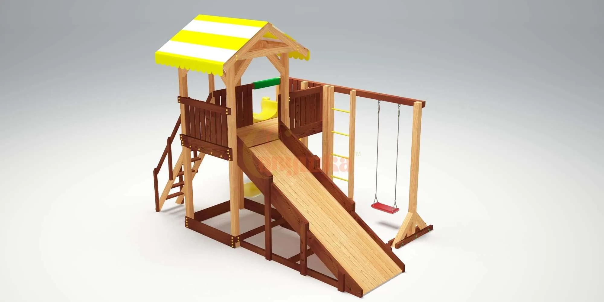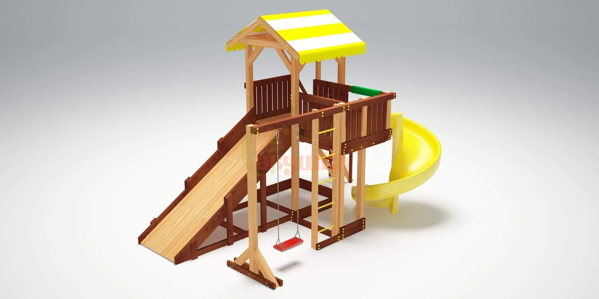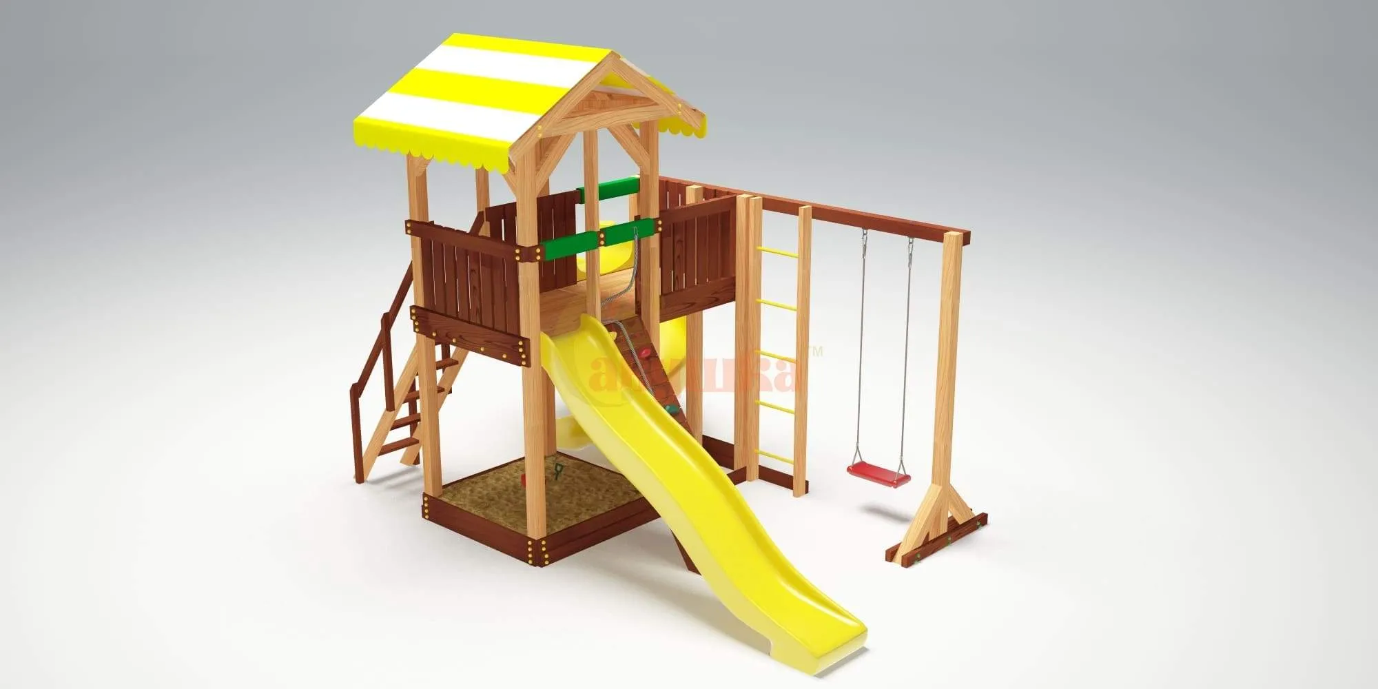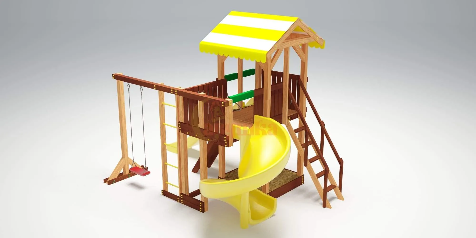 Конструкция выполнена из клеёного бруса 90×90 мм и окрашена сертифицированной краской на водной основе. Скруглённые углы, мягкие заглушки и надёжные перила обеспечивают полную безопасность для детей.