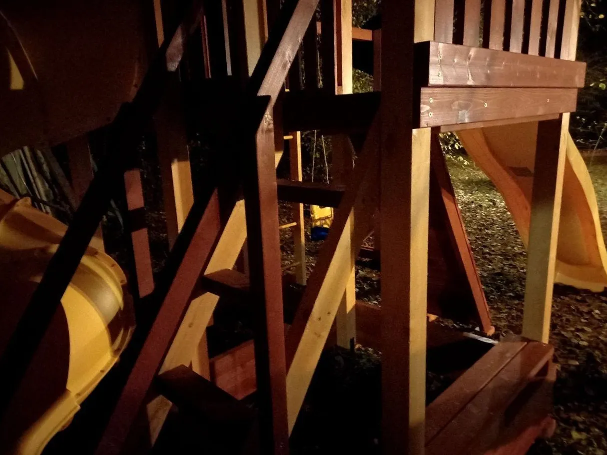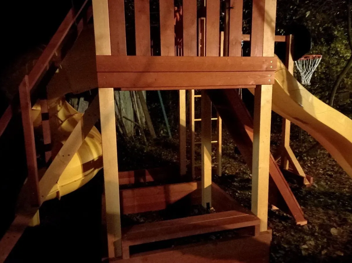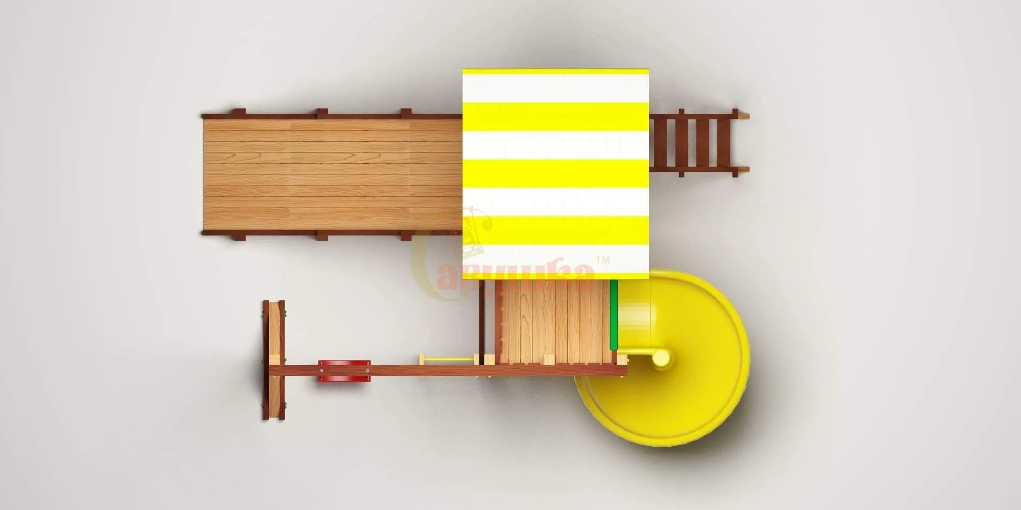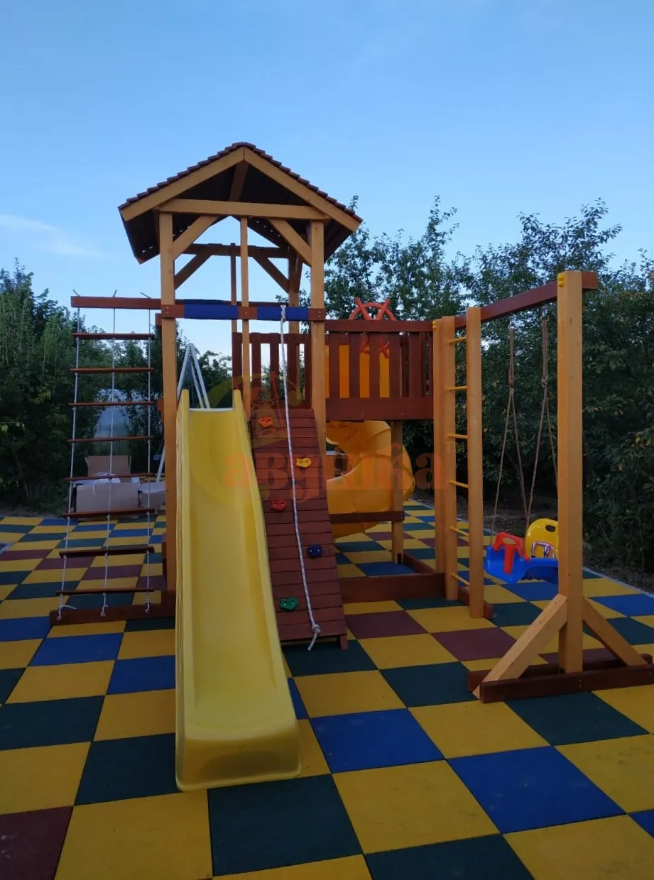 Конструкция выполнена из клеёного бруса 90×90 мм и окрашена сертифицированной краской на водной основе. Скруглённые углы, мягкие заглушки и надёжные перила обеспечивают полную безопасность для детей.