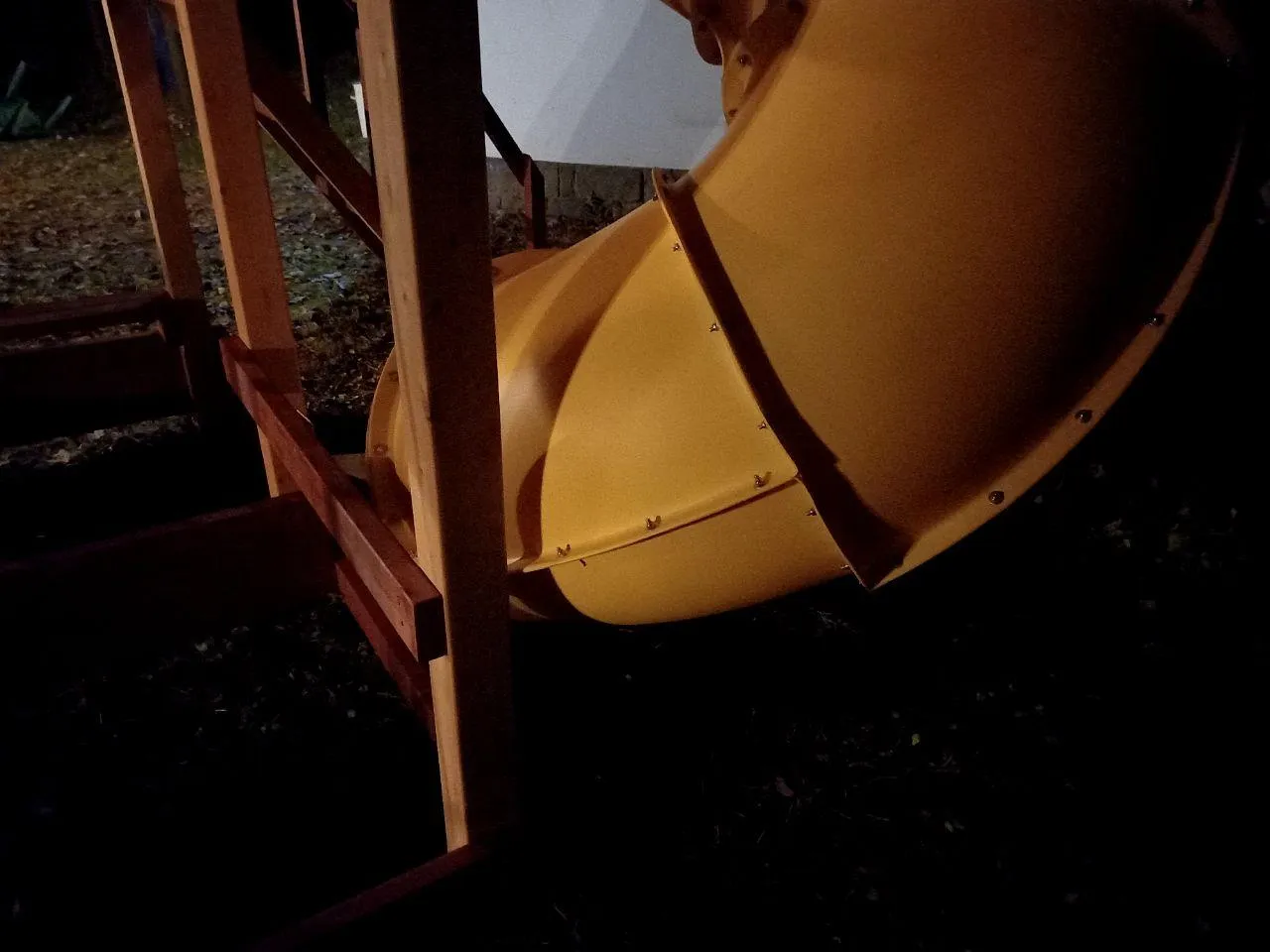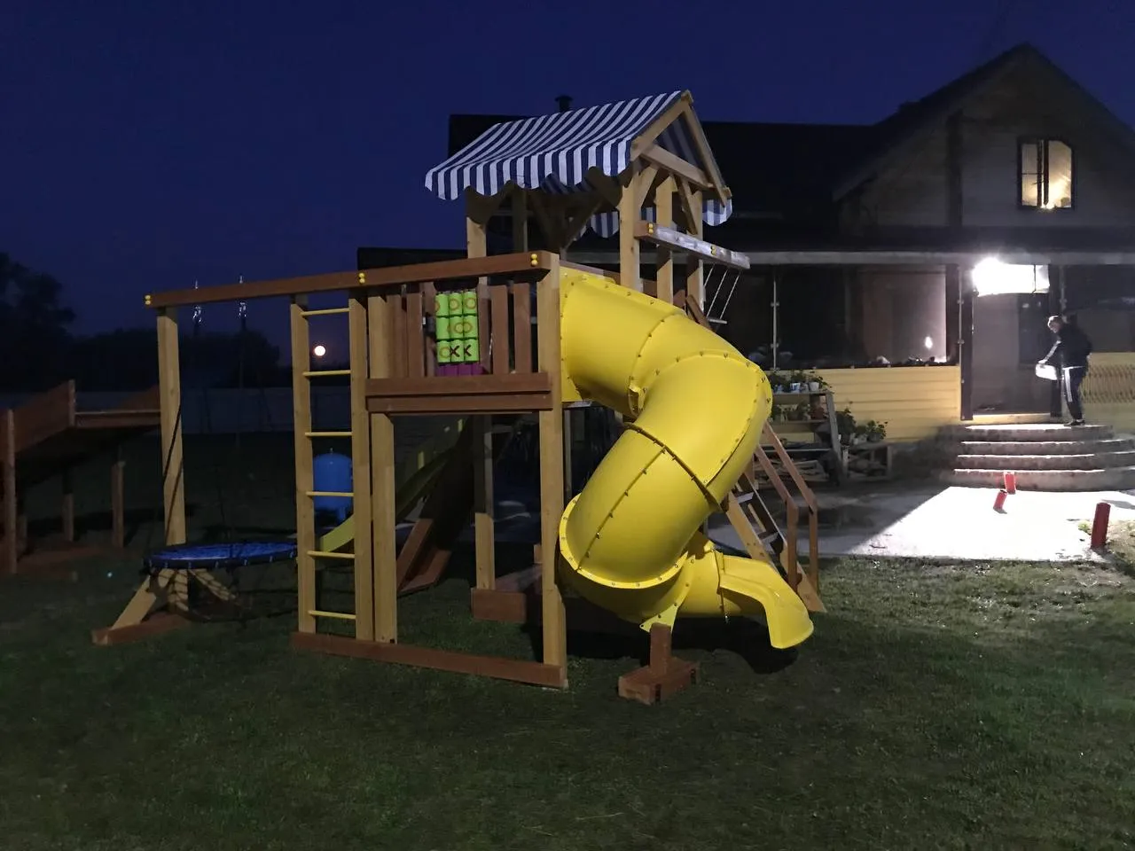 летом — две горки (прямая и труба-тоннель), зимой — широкий деревянный скат для катания на ватрушках.