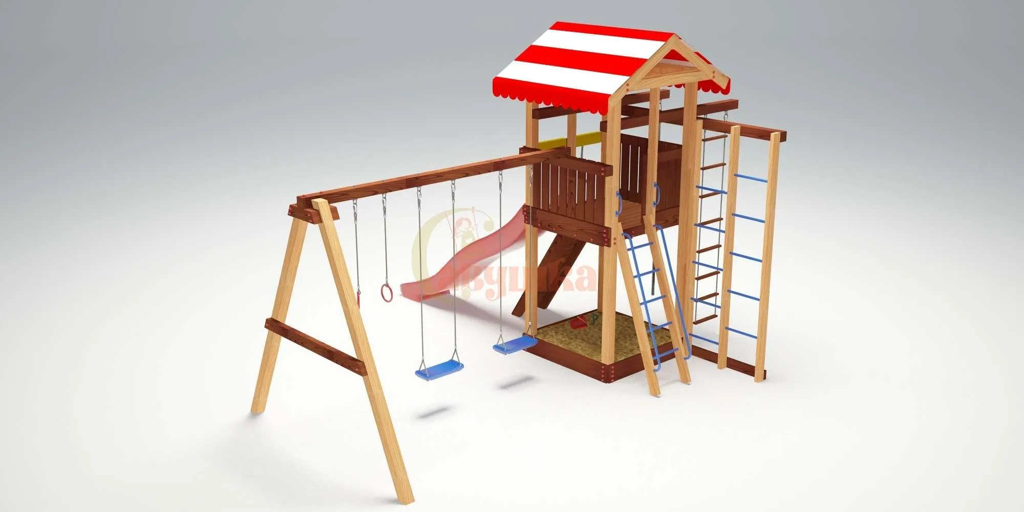 Может ли детская площадка российского производителя быть яркой, интересной для детей, безопасной, а также не иметь проблем со сборкой и при этом быть доступной? Да!Этому описанию соответствует модель Савушка 8. Это современный уличный комплекс с каркасом из клееного бруса (он не меняет форму со временем), покрытого несколькими слоями краски на водной основе.
