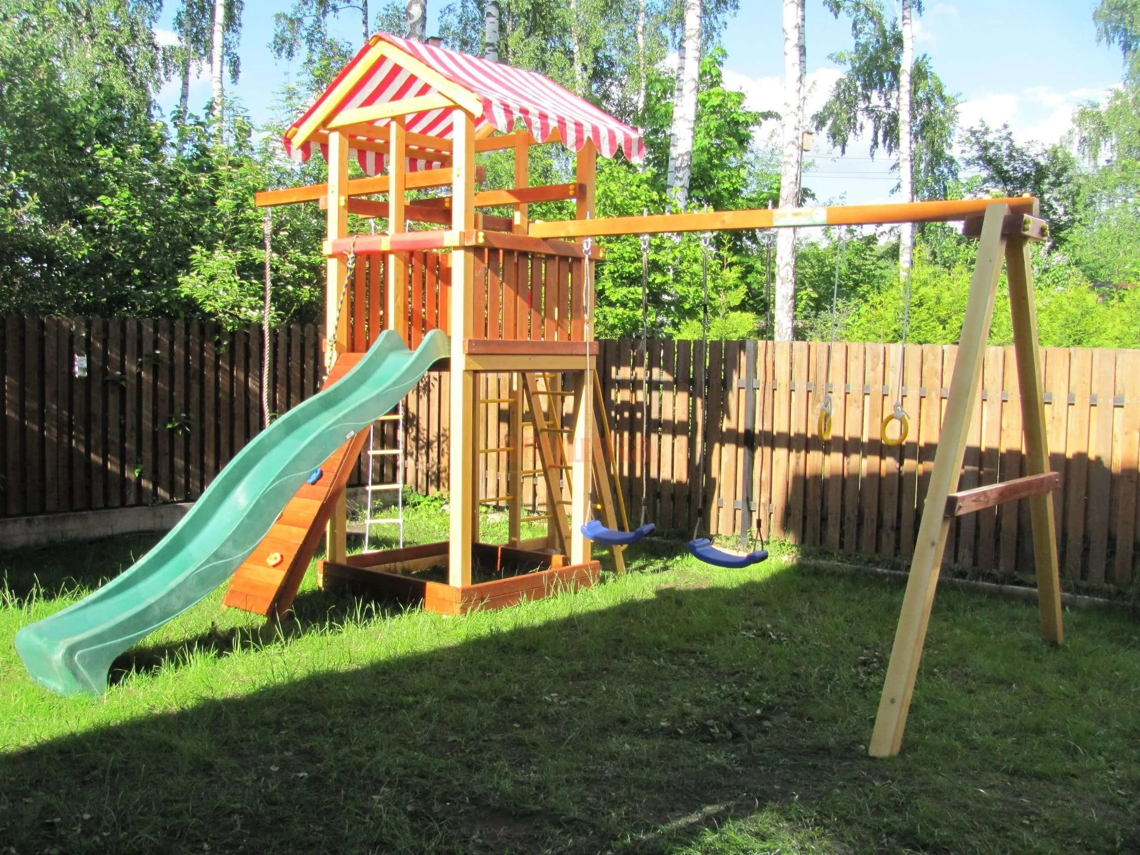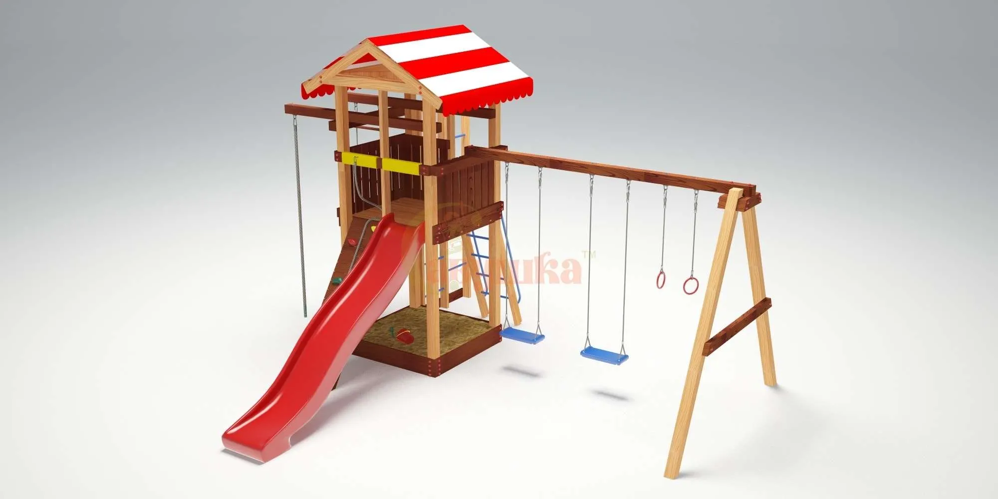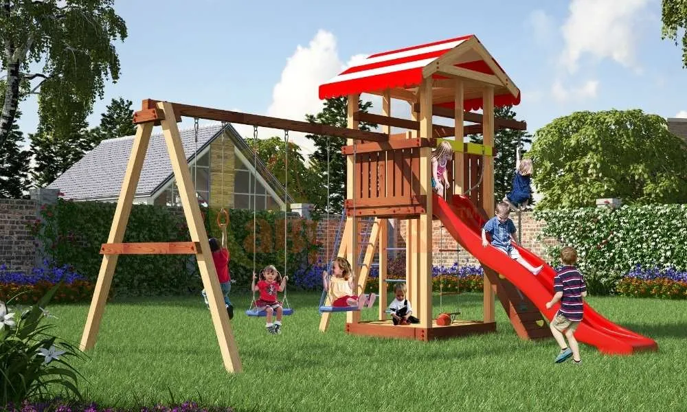 Малышей не оставит равнодушными башня с горкой. Длина горки три метра. Она сделана из яркого, прочного пластика, который имеет скользкую поверхность и не трескается со временем.