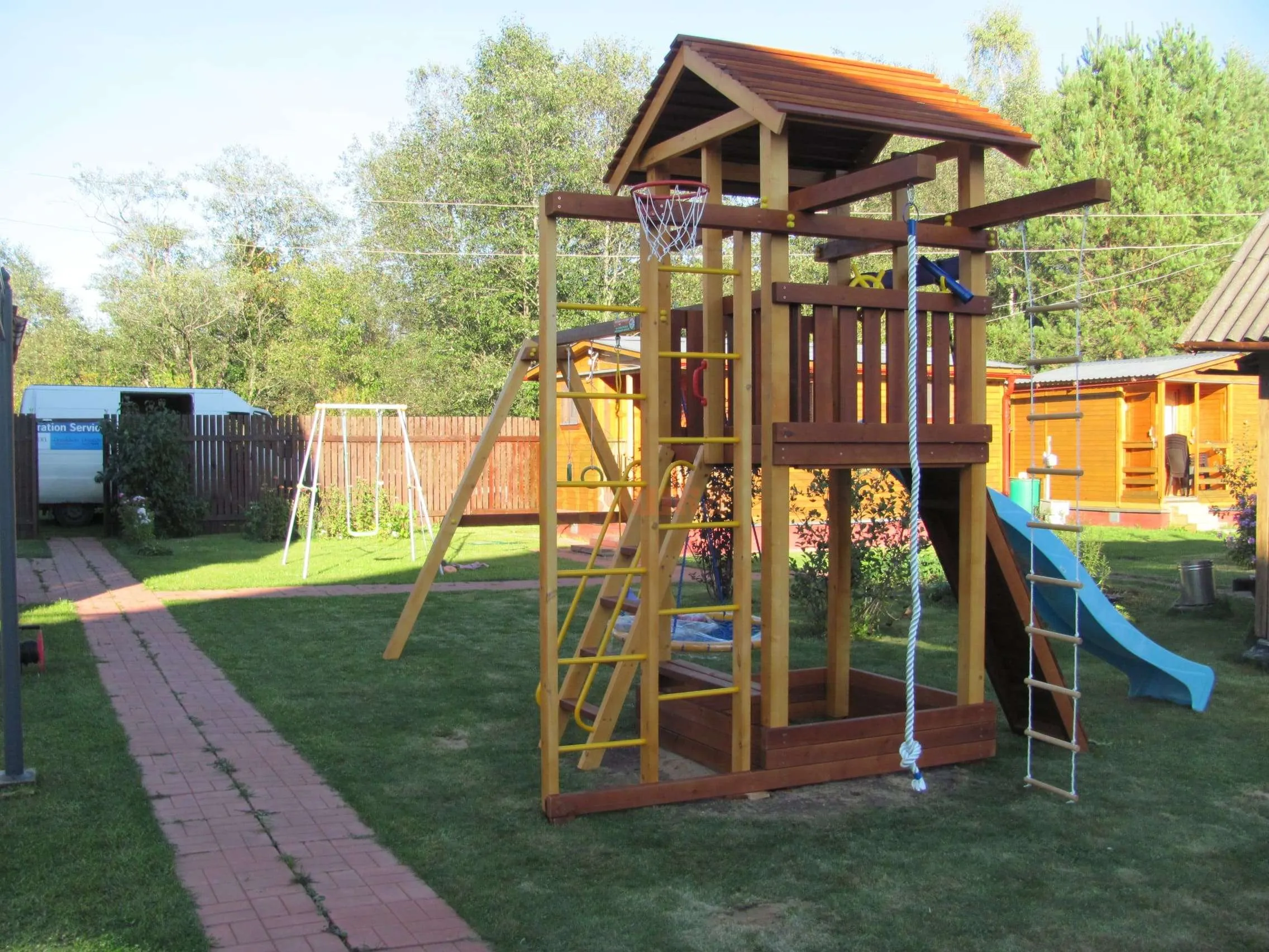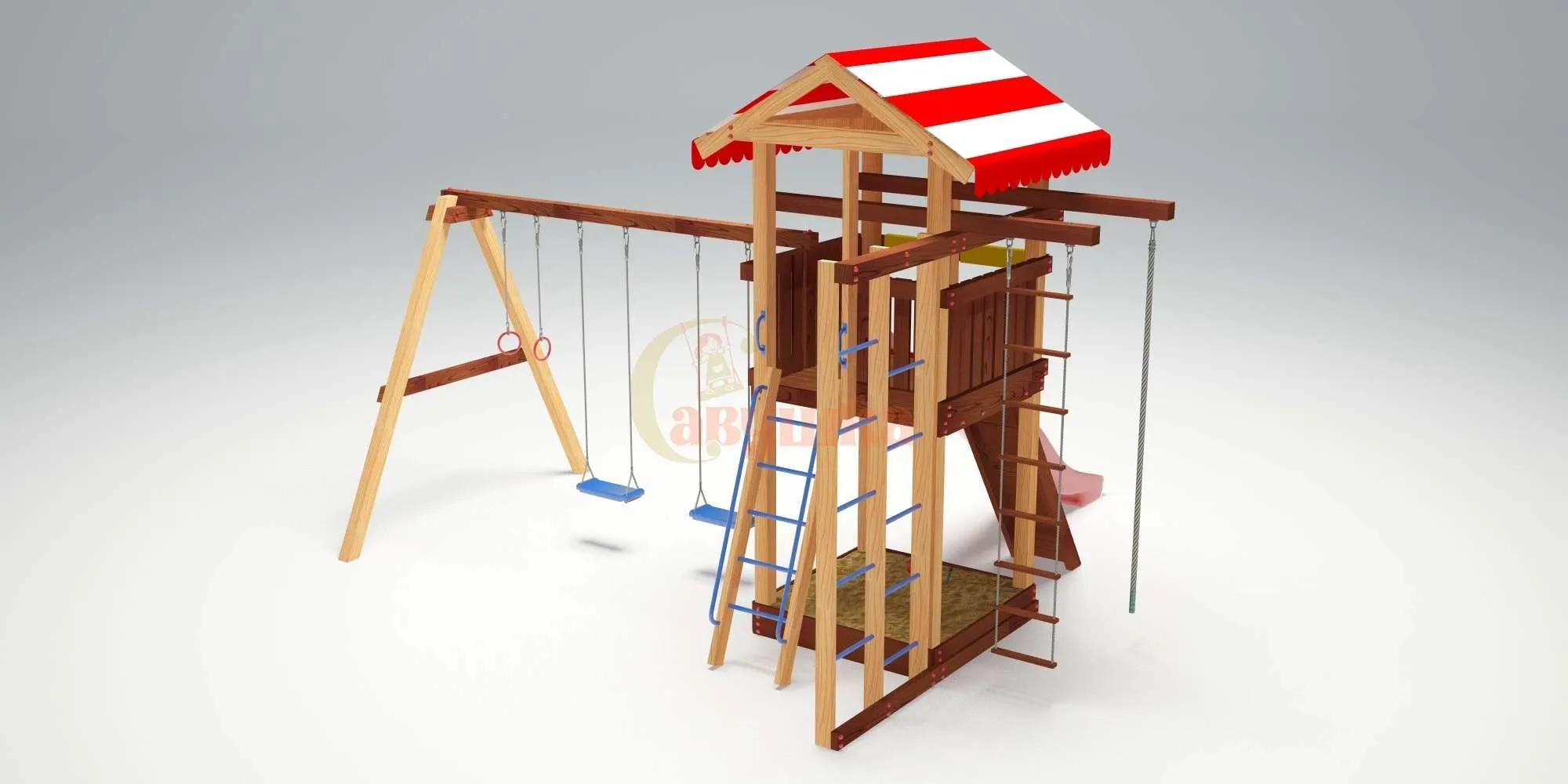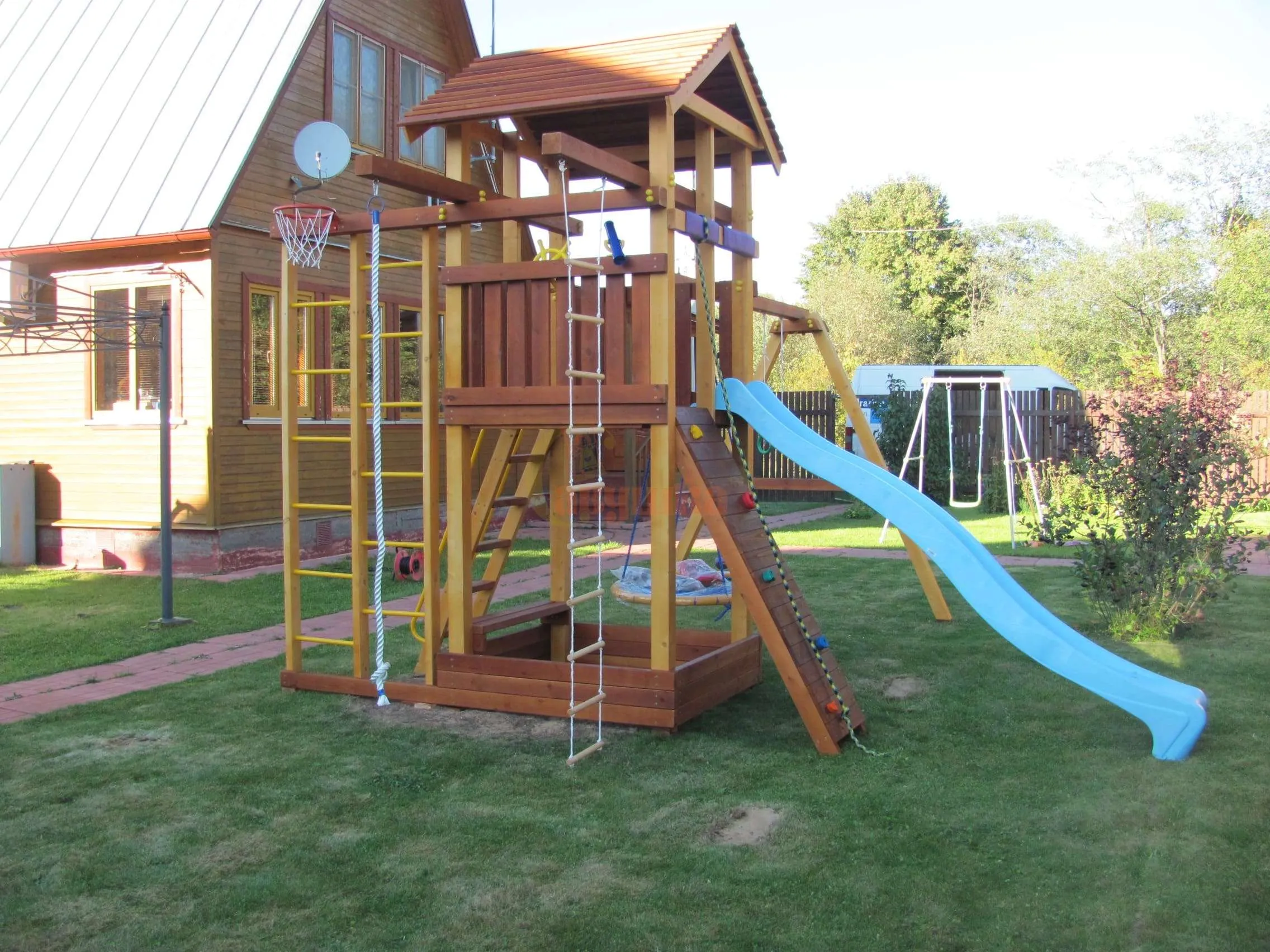 Забраться наверх ребенок может по лестнице или мини-скалодрому с канатом. Небольшая песочница находится на нижнем уровне и закрыта от дождя платформой башни.