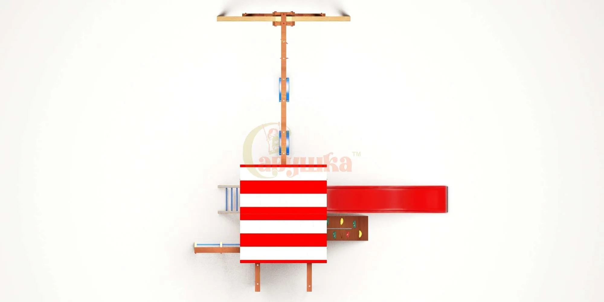 Чтобы дети при игре случайно не ударились головой, руками или другими частями тела о деревянный каркас, мы обернули потенциально опасные поверхности мягкими накладками. Весь металлический крепеж модели имеет защитные пластиковые заглушки.