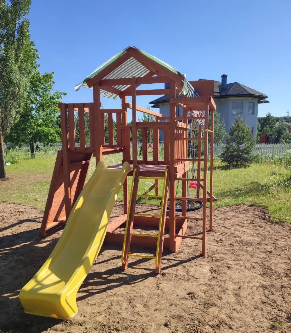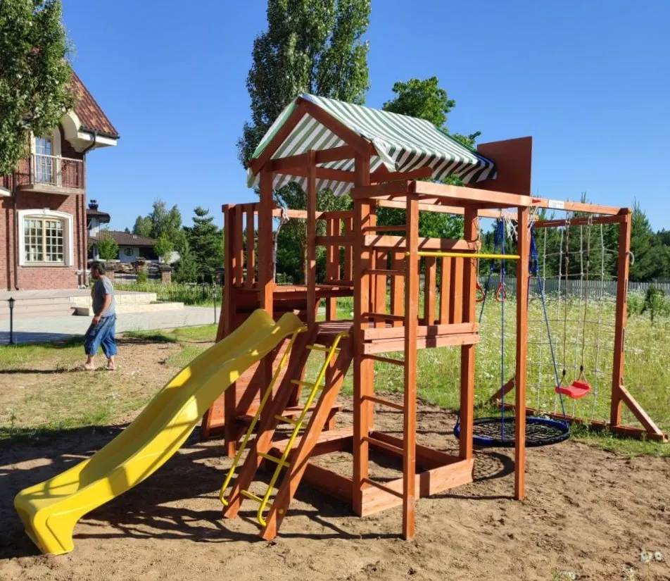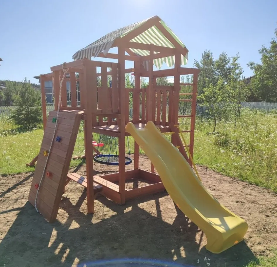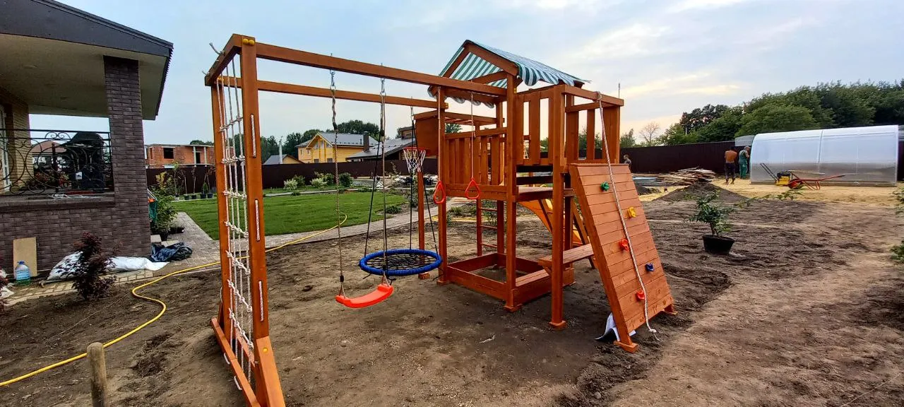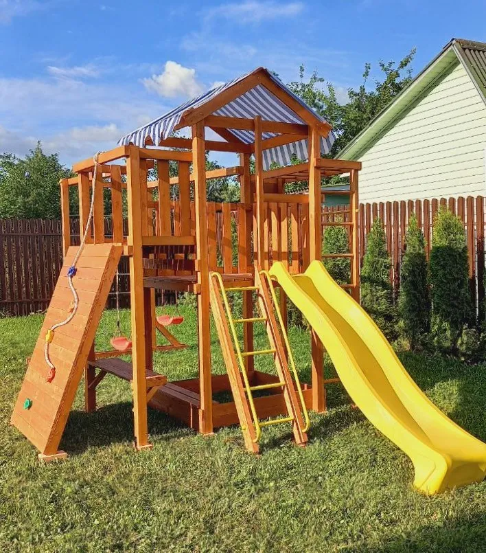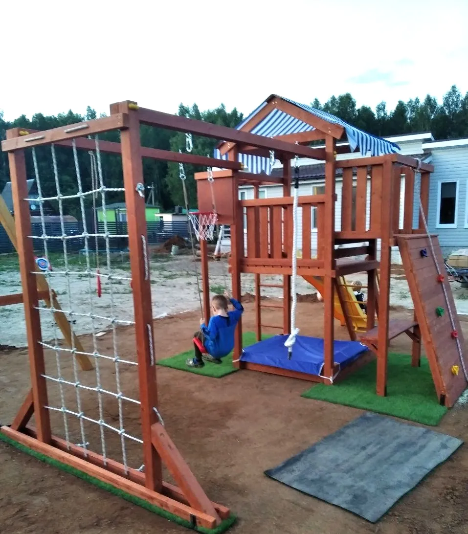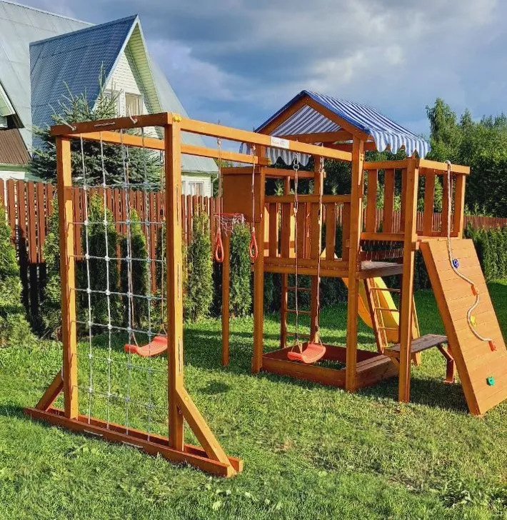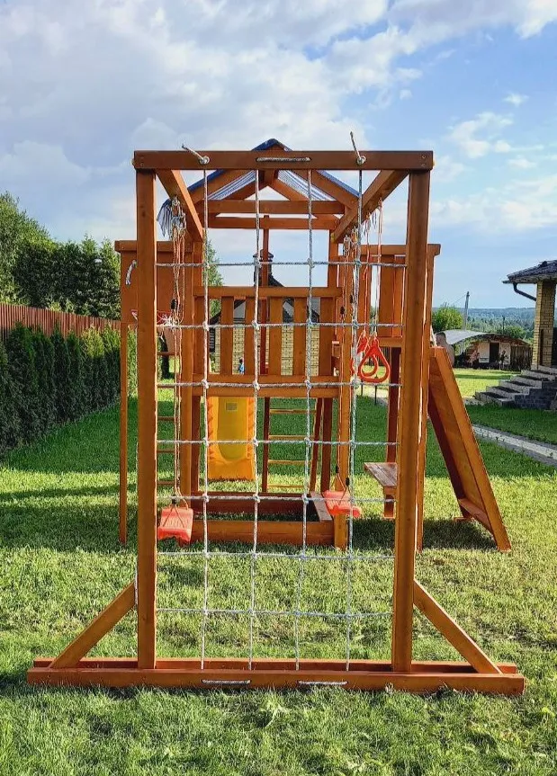 Конструкция выполнена из натуральных и экологичных материалов, все соединения надежно закреплены, а болтовые крепления закрыты пластиковыми заглушками. Это обеспечивает комфортную и безопасную игру на площадке.