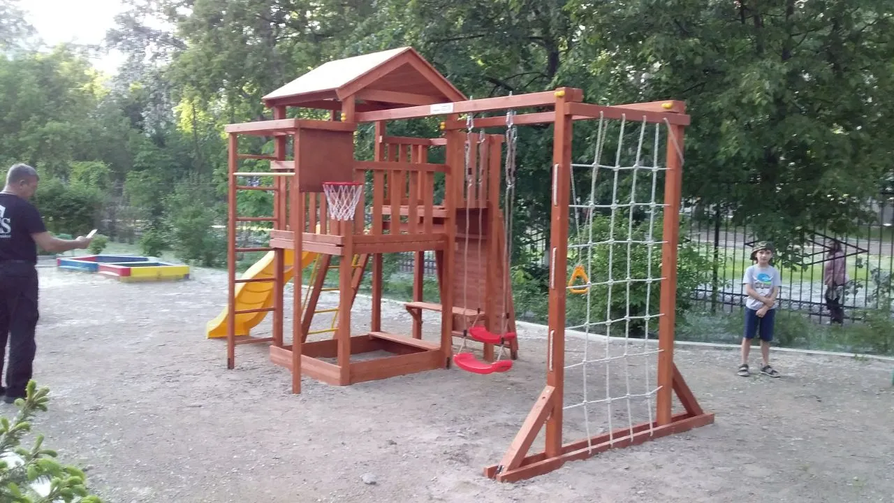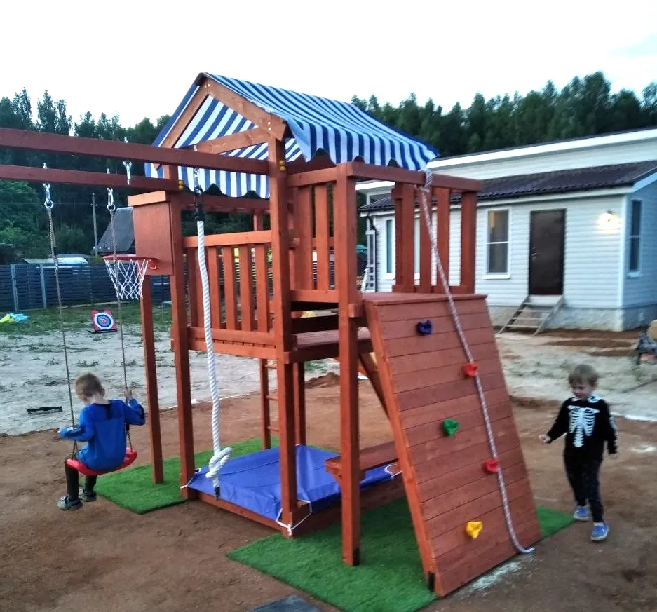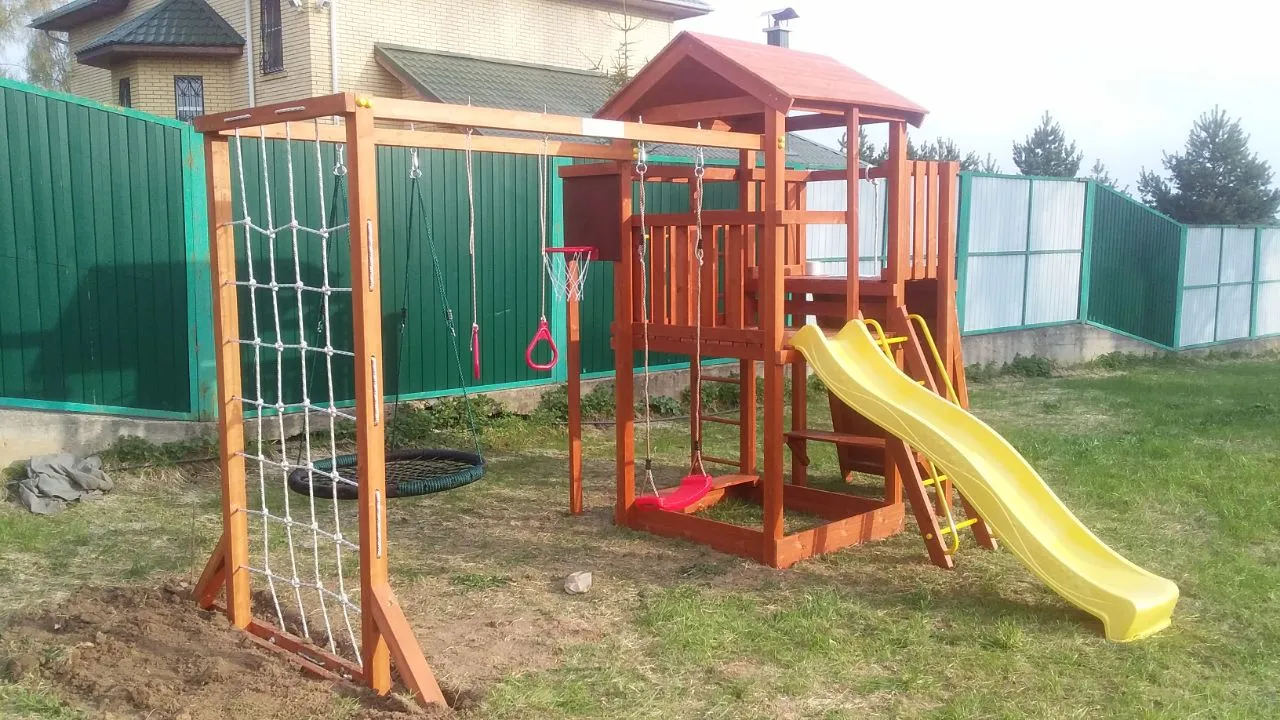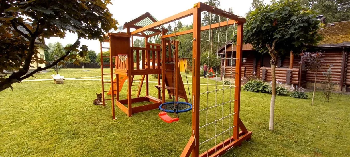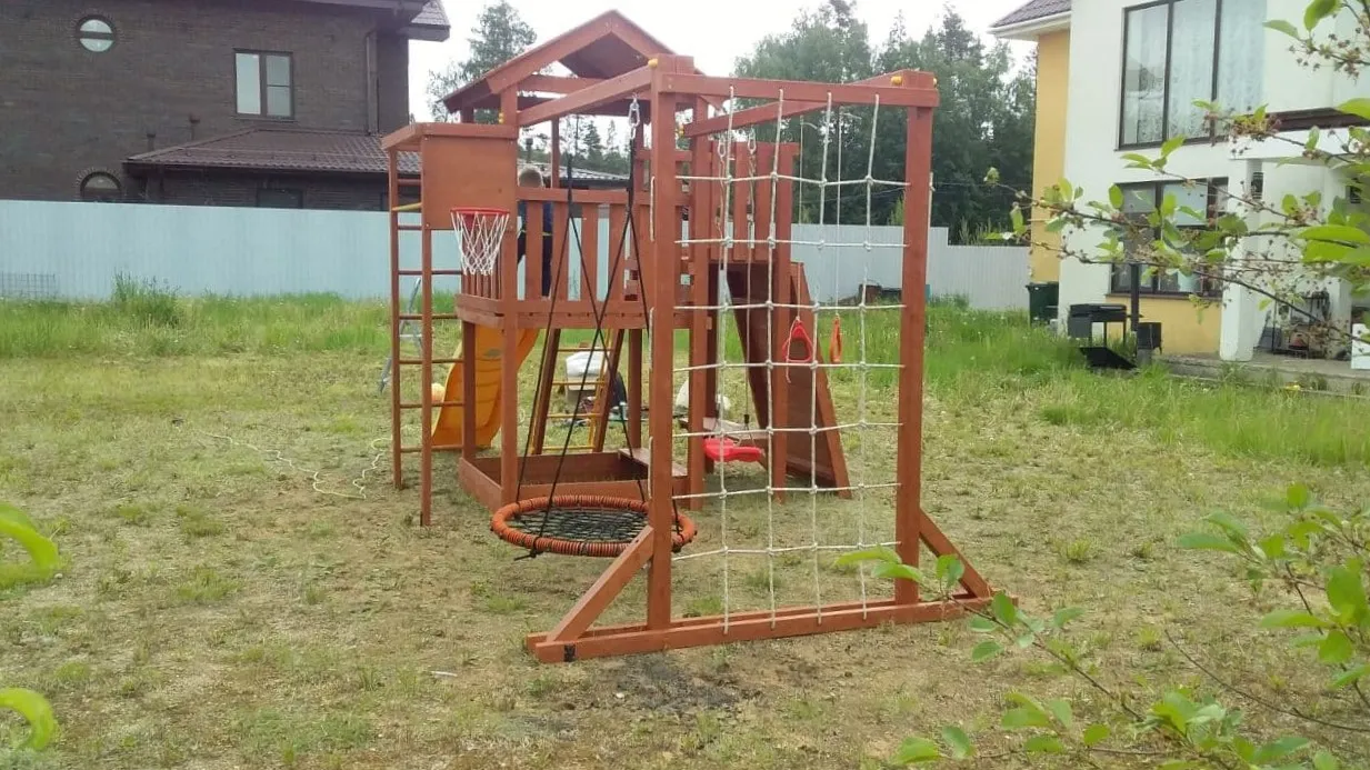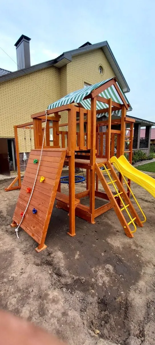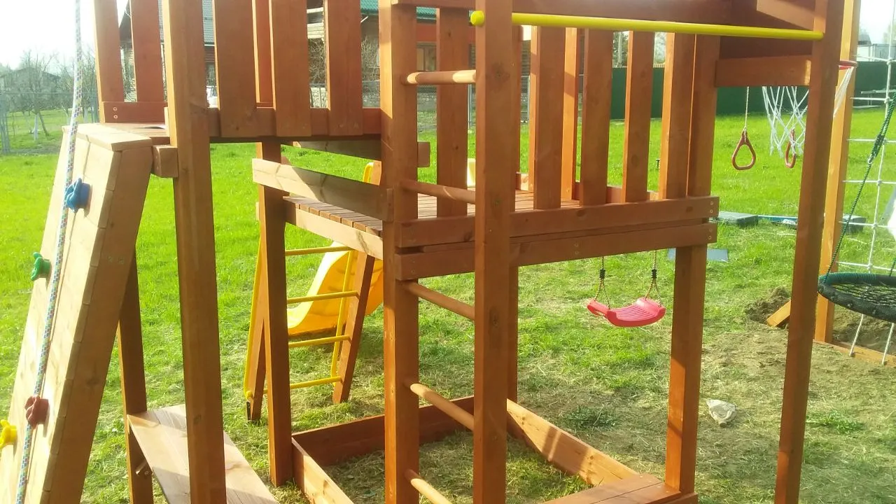 Конструкция выполнена из натуральных и экологичных материалов, все соединения надежно закреплены, а болтовые крепления закрыты пластиковыми заглушками. Это обеспечивает комфортную и безопасную игру на площадке.