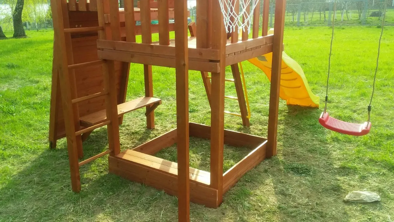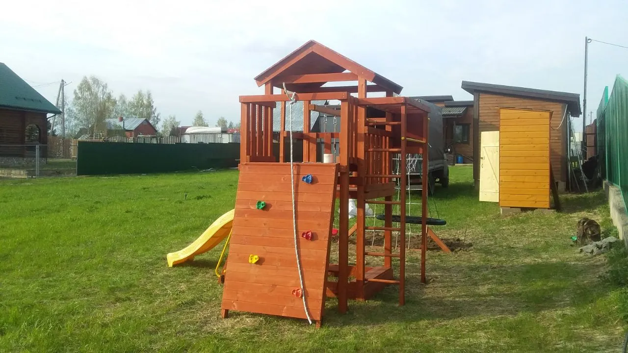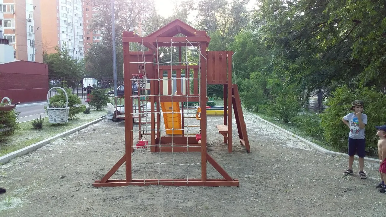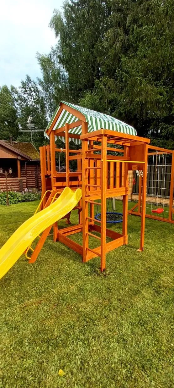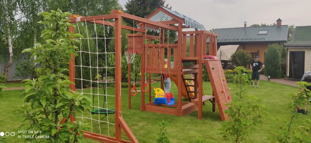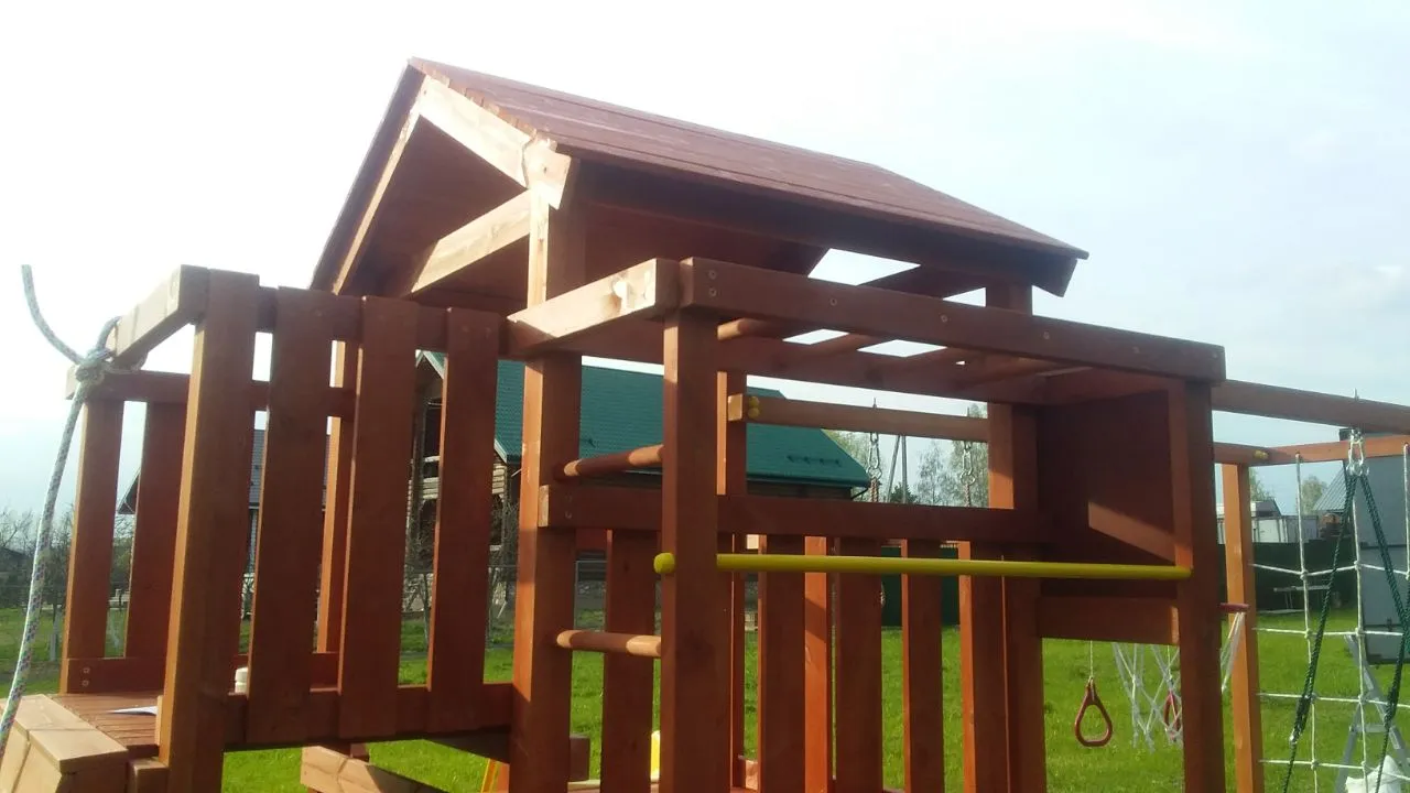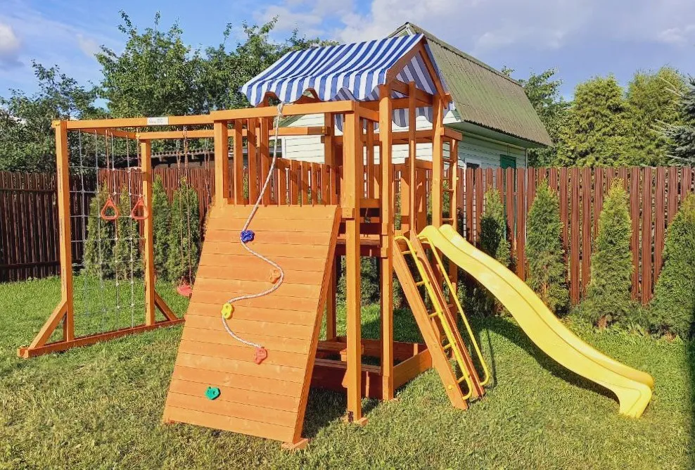 Конструкция выполнена из натуральных и экологичных материалов, все соединения надежно закреплены, а болтовые крепления закрыты пластиковыми заглушками. Это обеспечивает комфортную и безопасную игру на площадке.