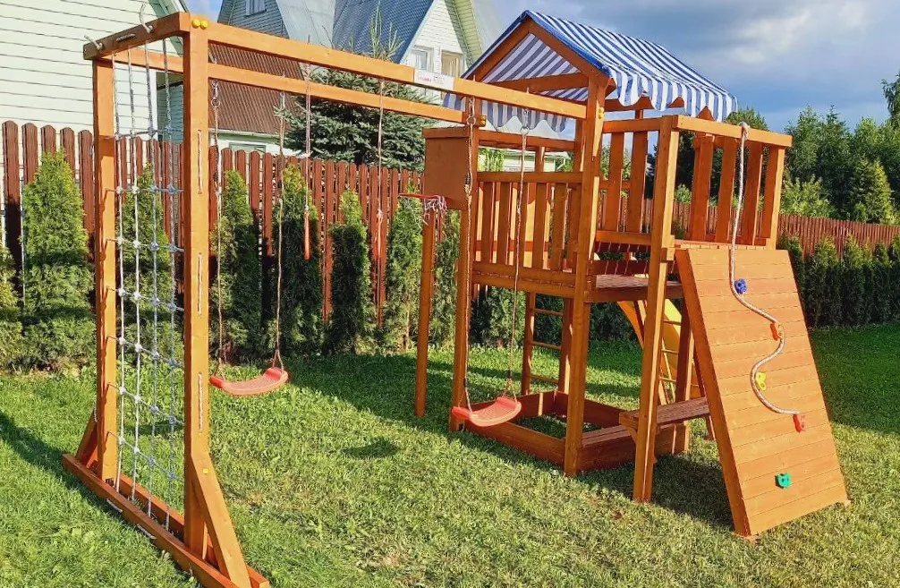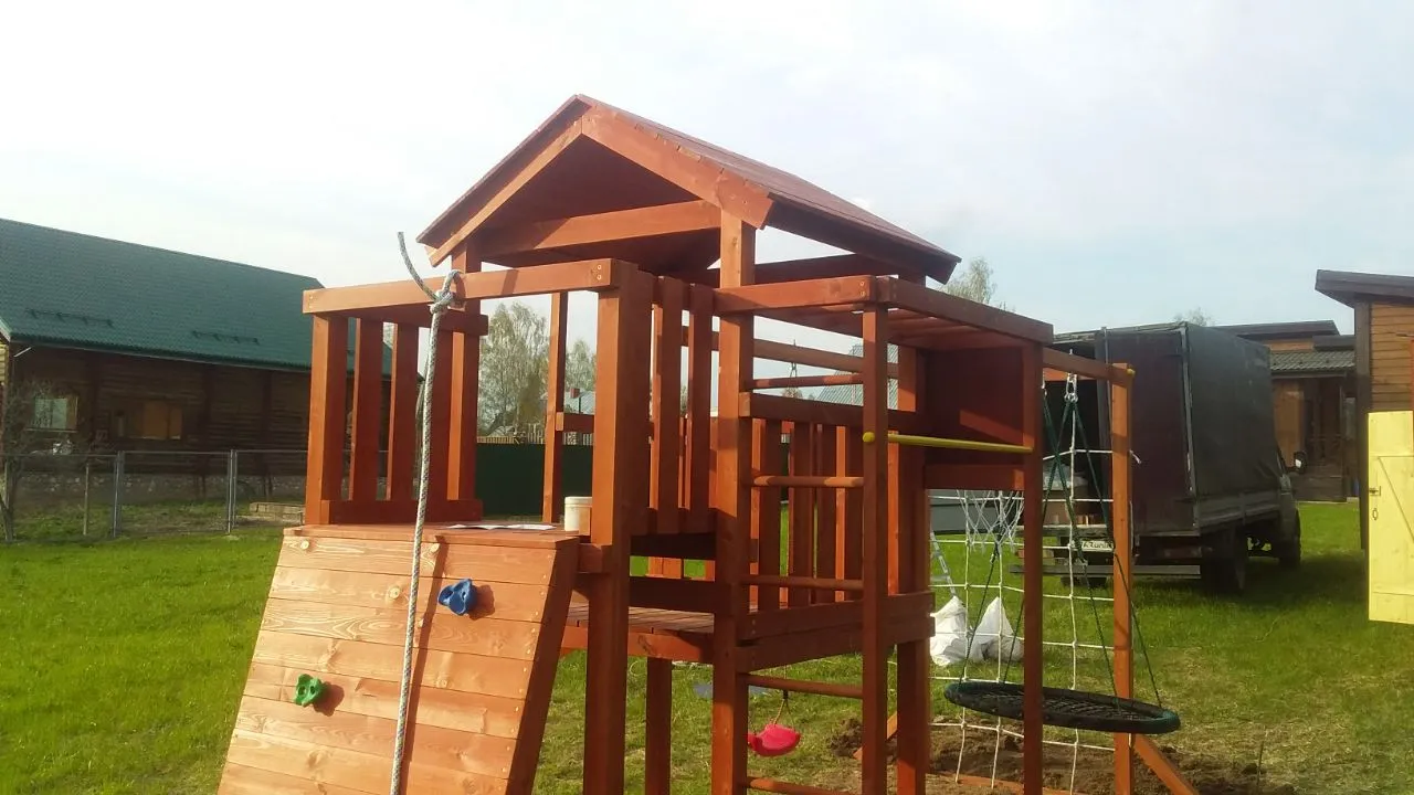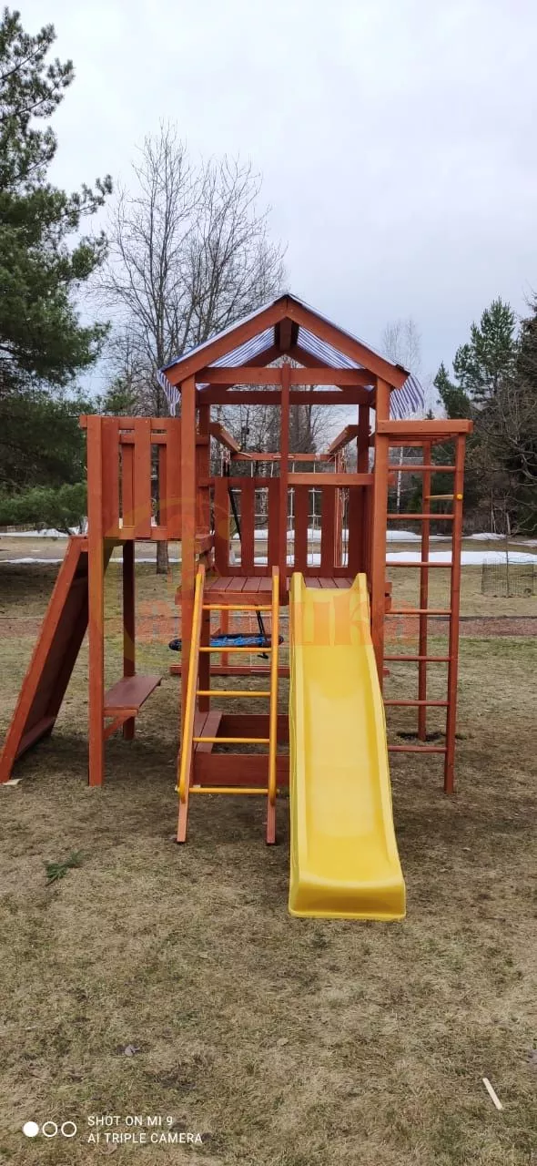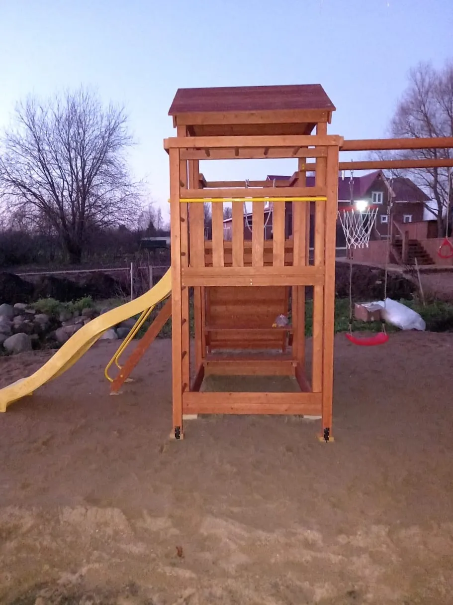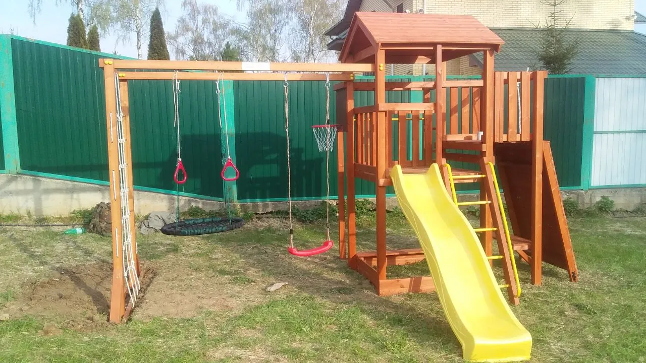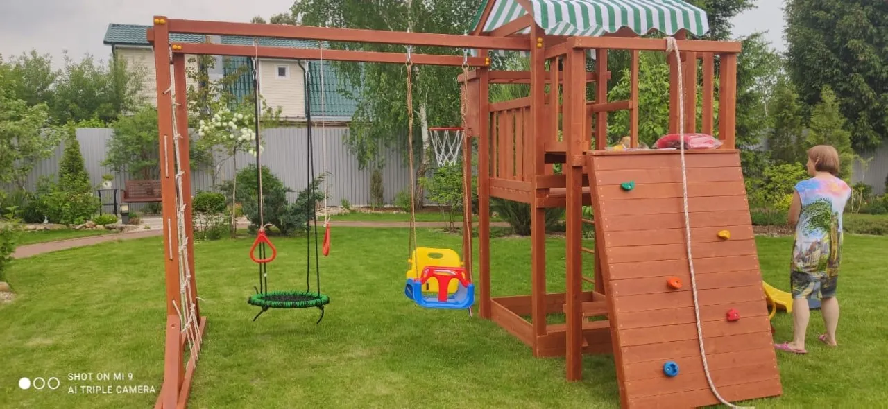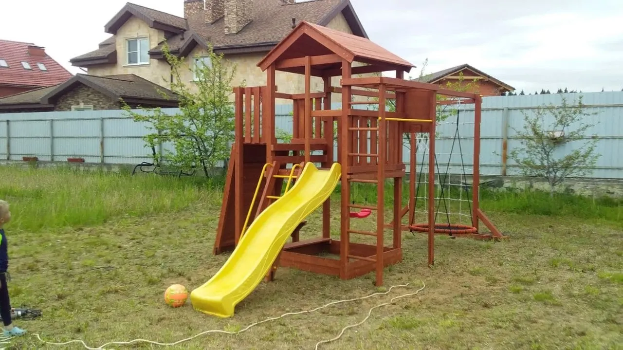 Конструкция выполнена из натуральных и экологичных материалов, все соединения надежно закреплены, а болтовые крепления закрыты пластиковыми заглушками. Это обеспечивает комфортную и безопасную игру на площадке.