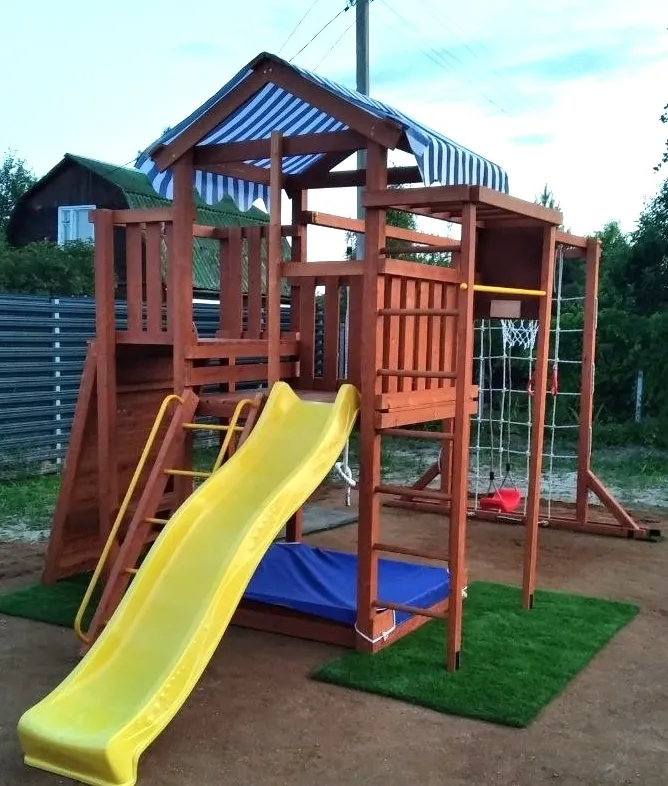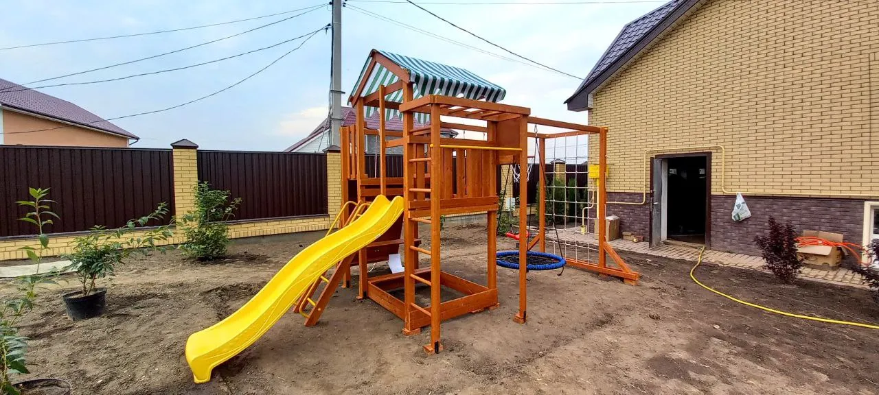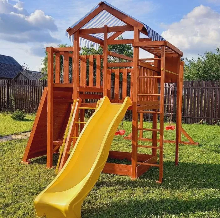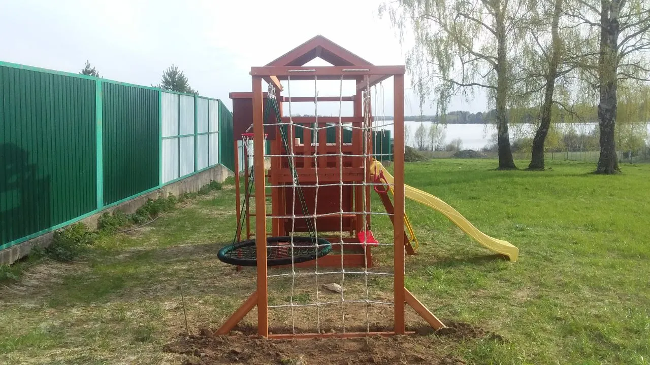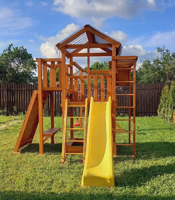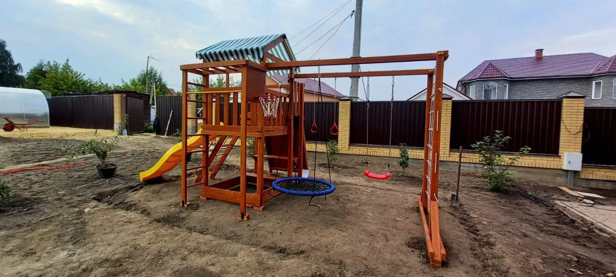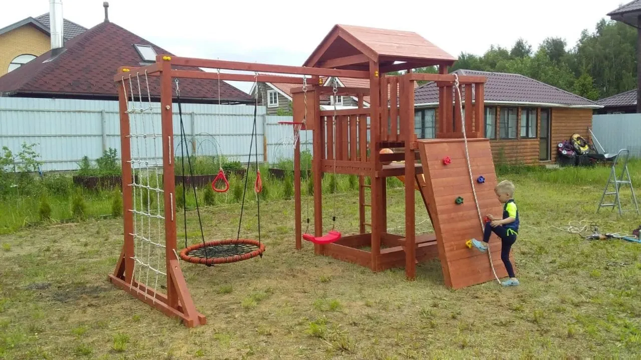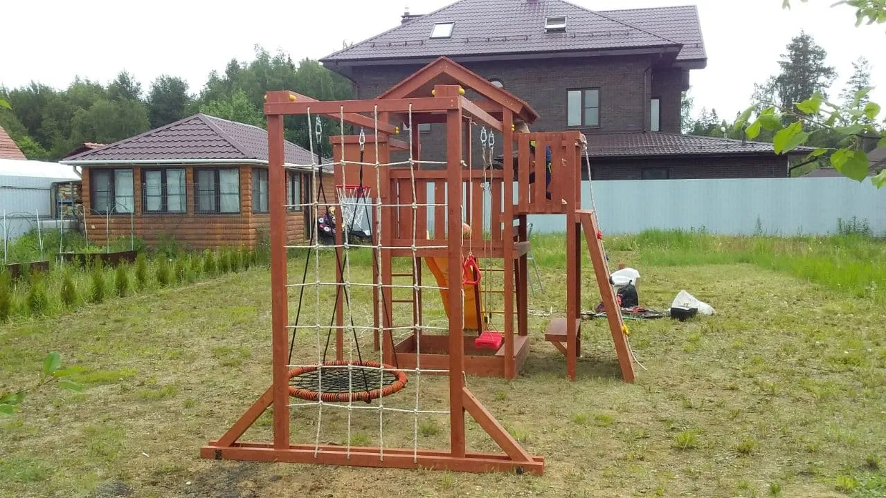 Конструкция выполнена из натуральных и экологичных материалов, все соединения надежно закреплены, а болтовые крепления закрыты пластиковыми заглушками. Это обеспечивает комфортную и безопасную игру на площадке.