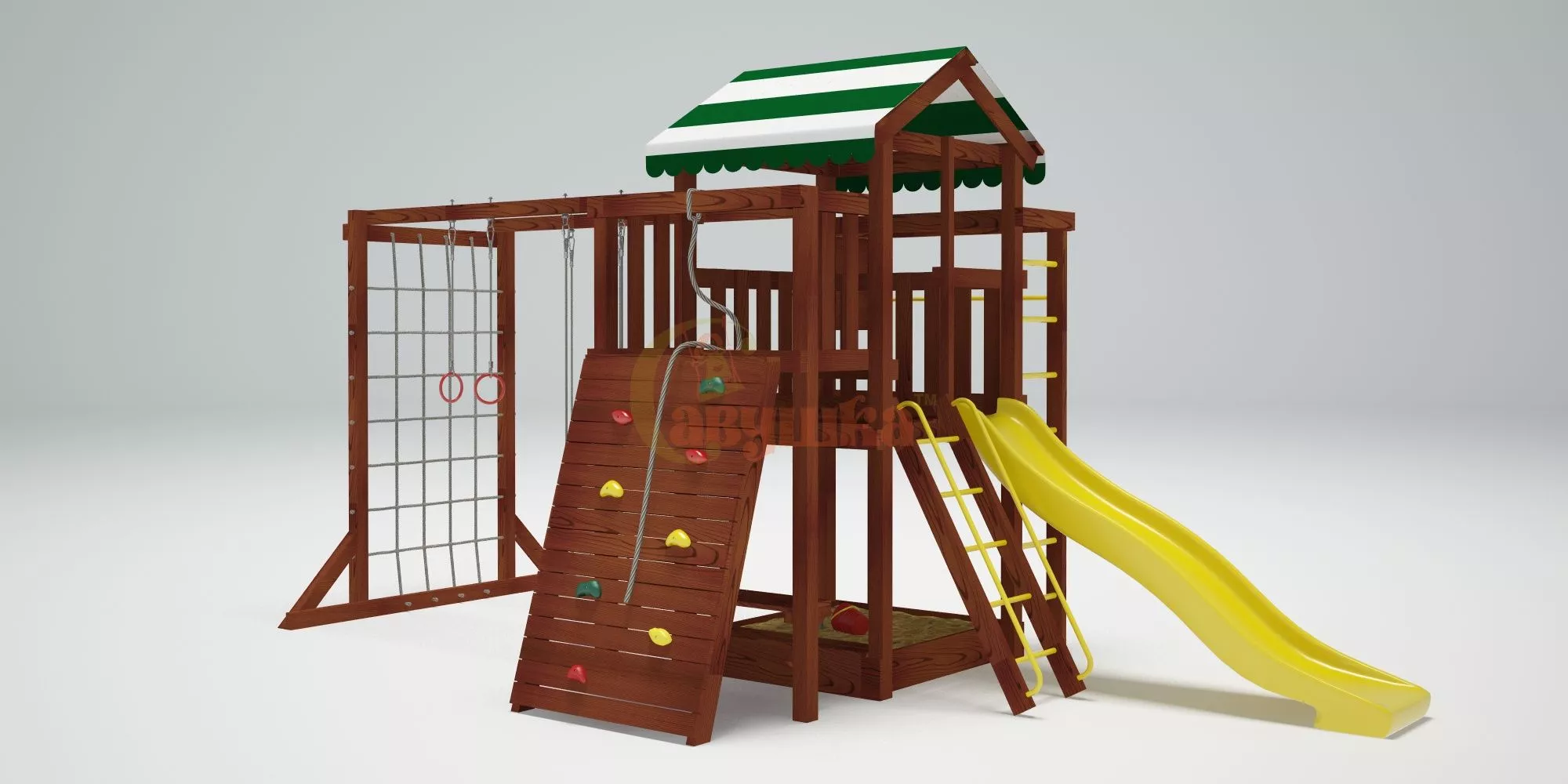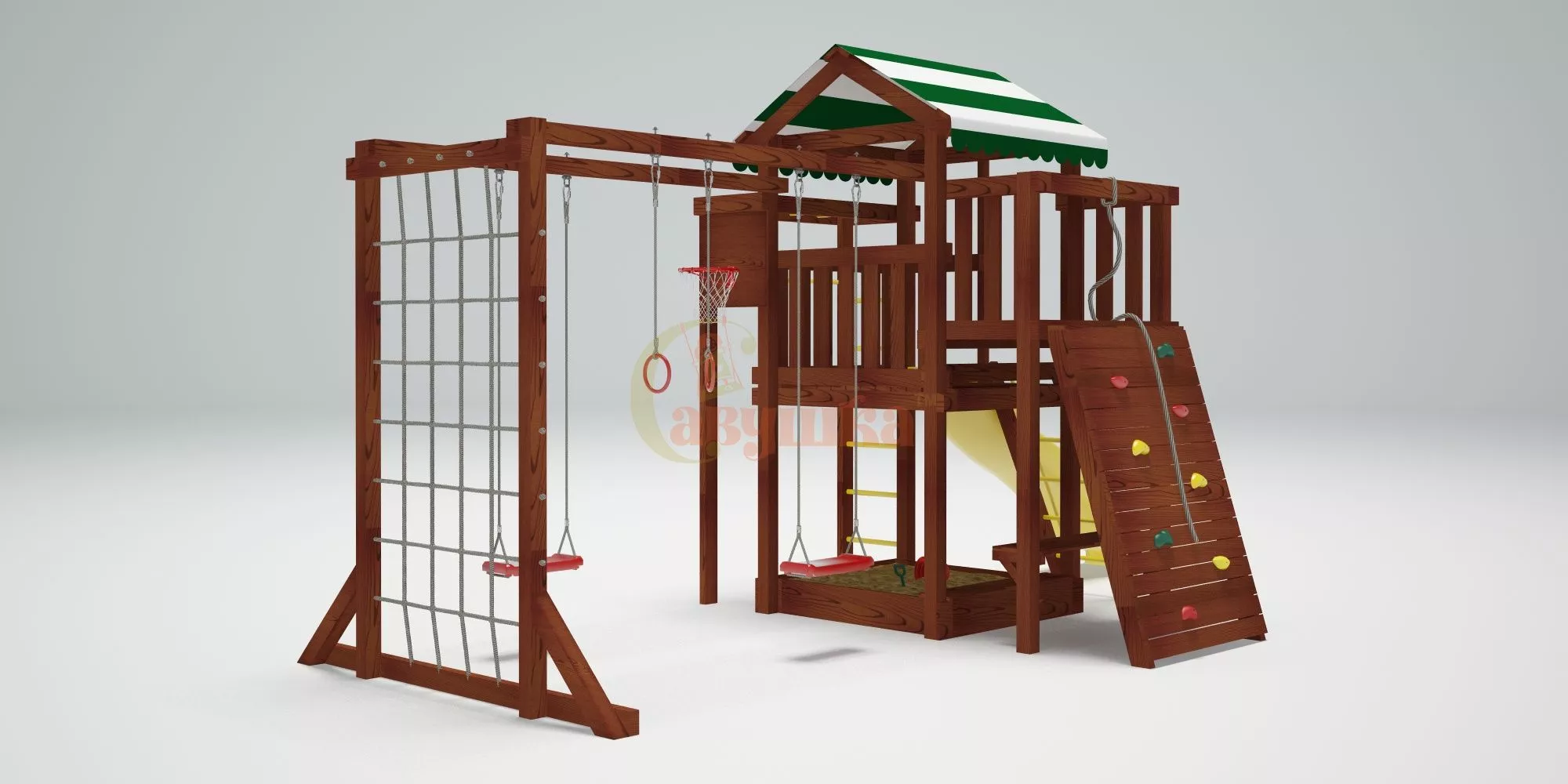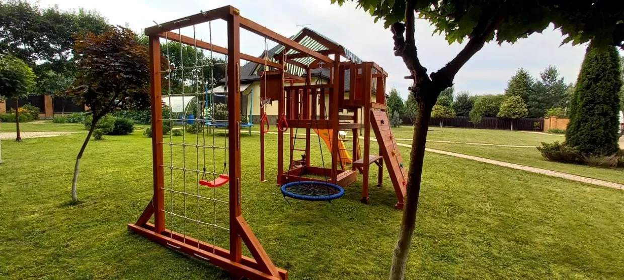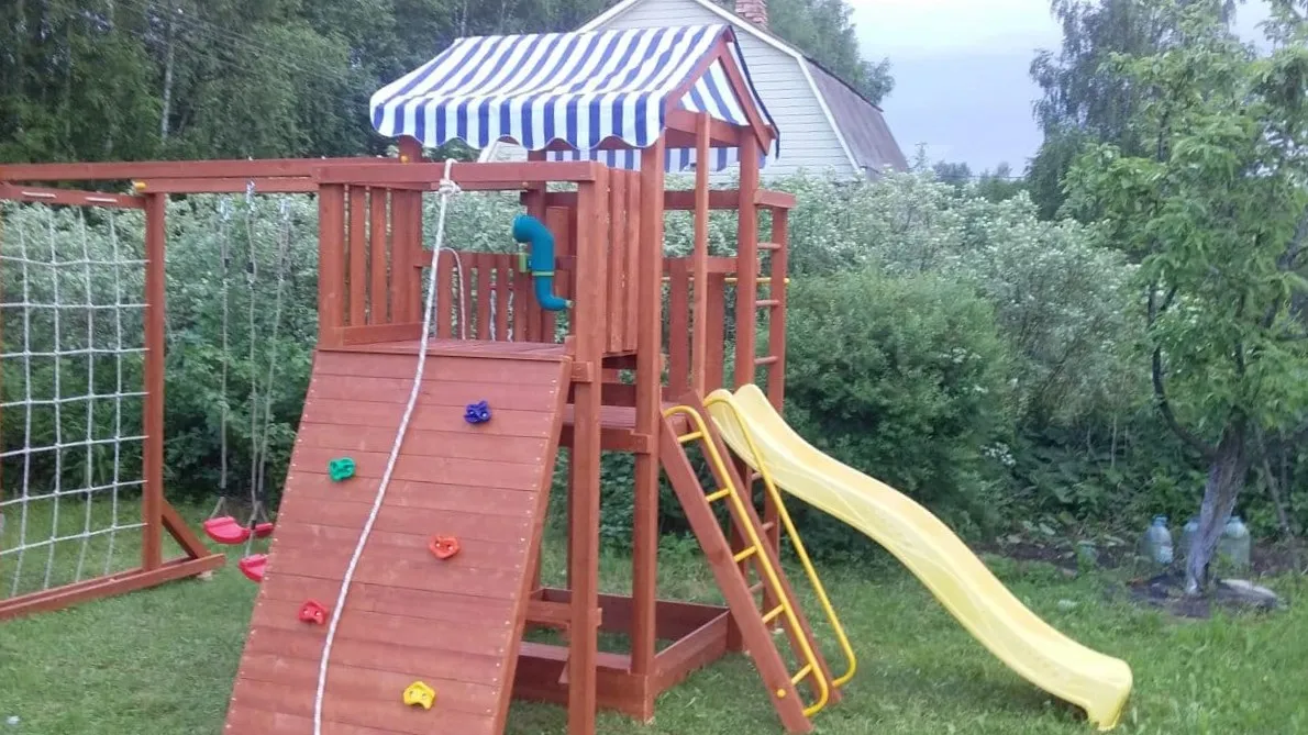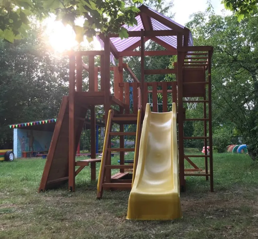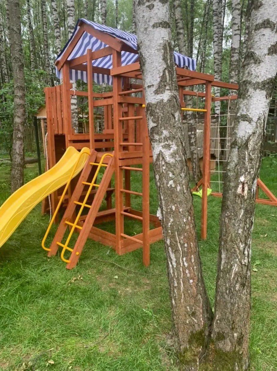 Конструкция выполнена из натуральных и экологичных материалов, все соединения надежно закреплены, а болтовые крепления закрыты пластиковыми заглушками. Это обеспечивает комфортную и безопасную игру на площадке.