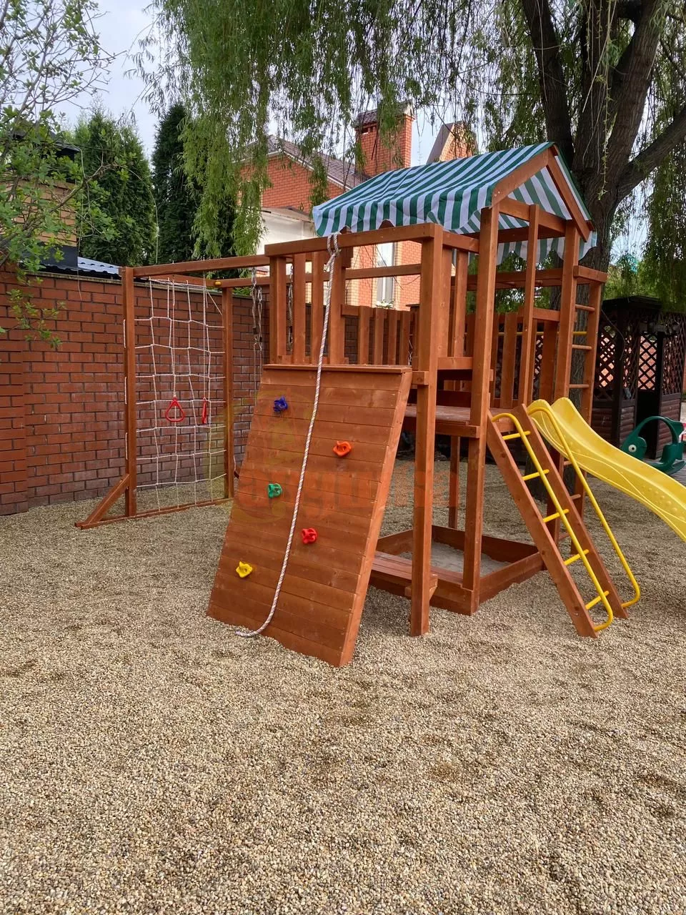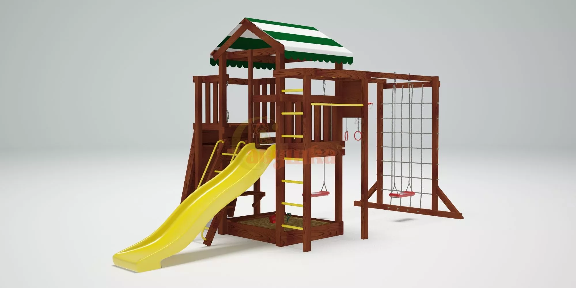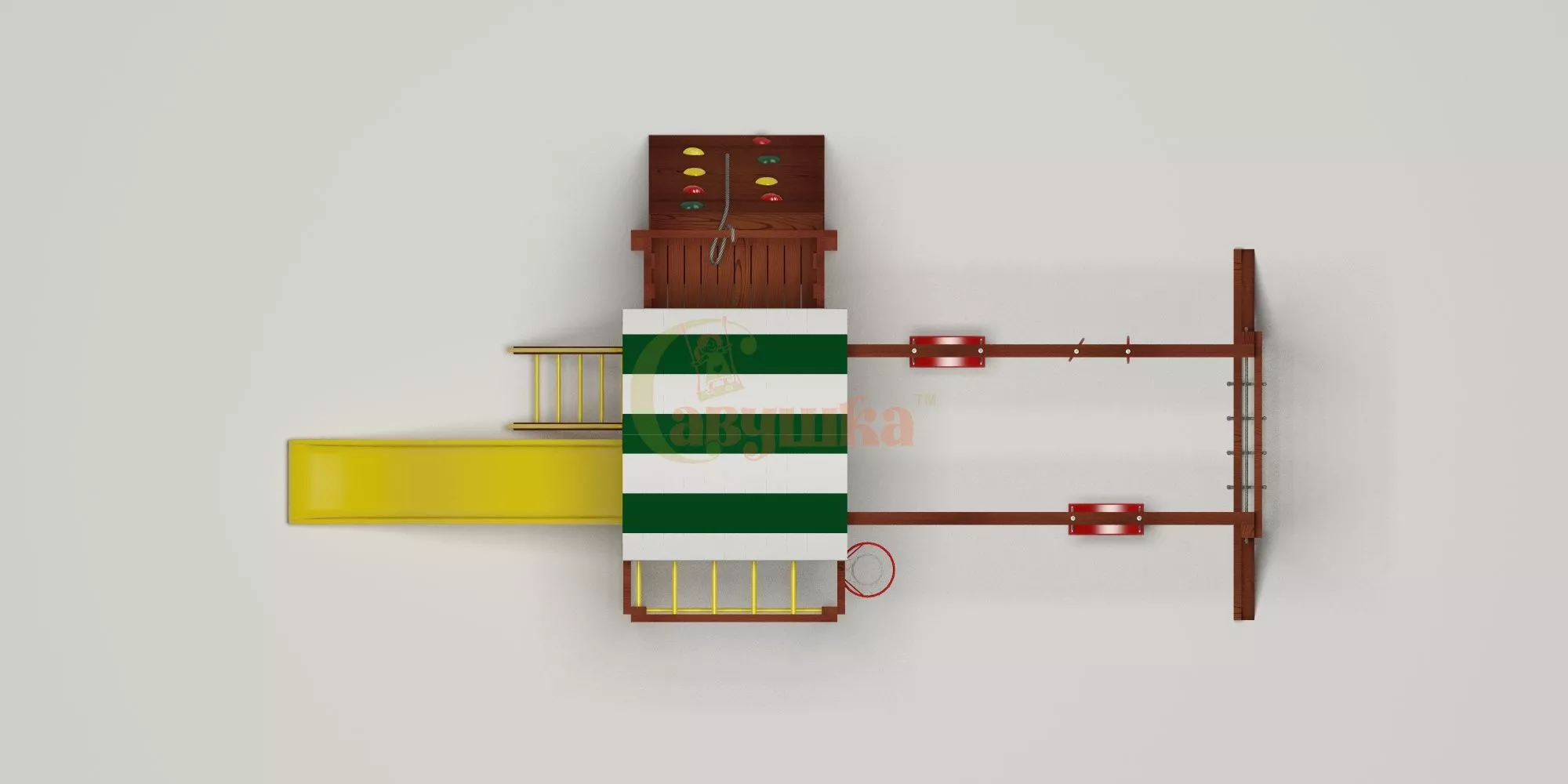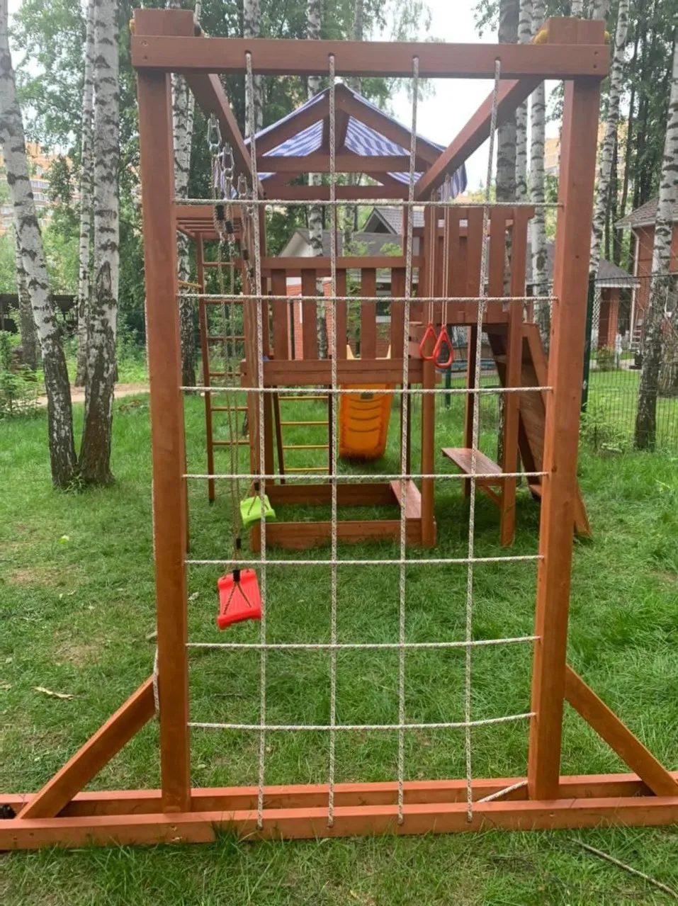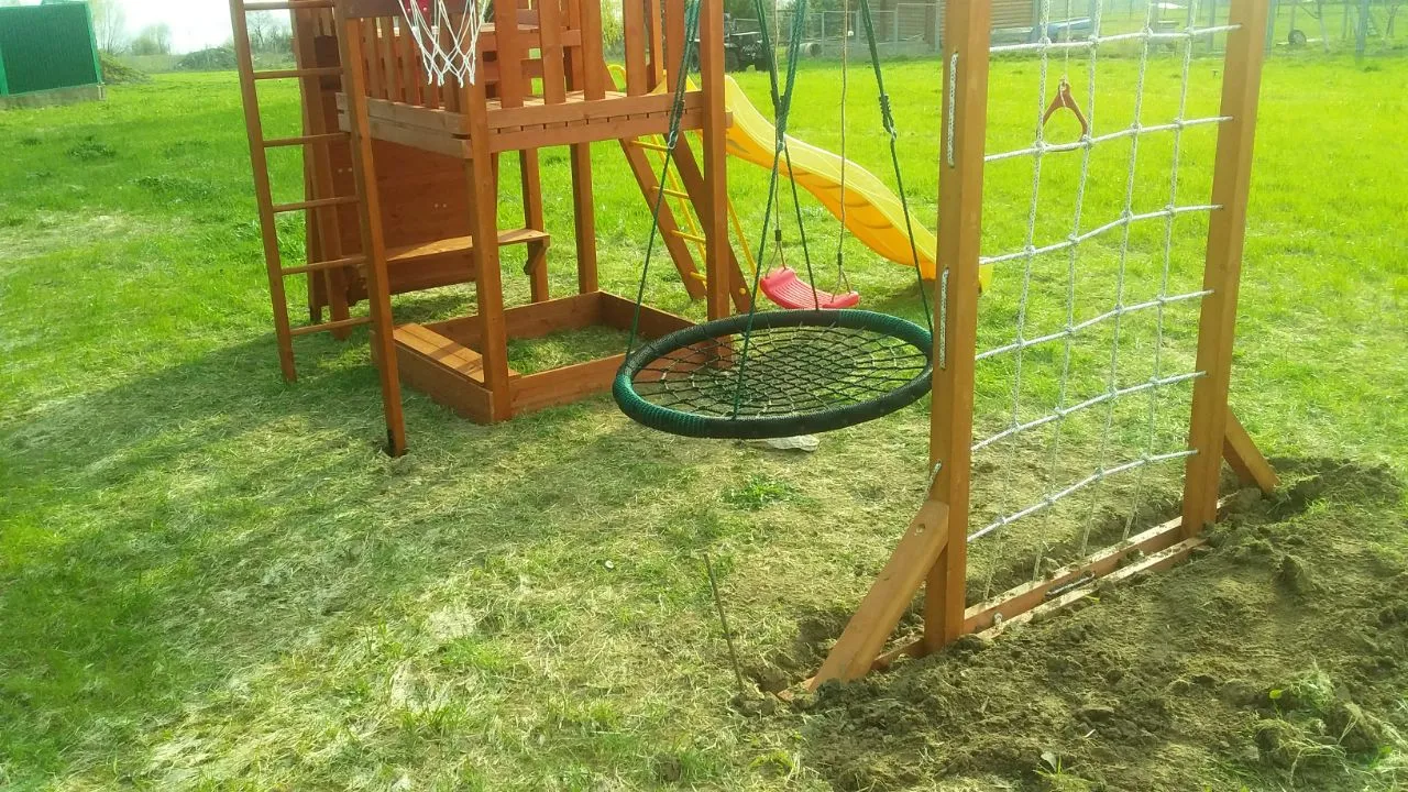 Конструкция выполнена из натуральных и экологичных материалов, все соединения надежно закреплены, а болтовые крепления закрыты пластиковыми заглушками. Это обеспечивает комфортную и безопасную игру на площадке.