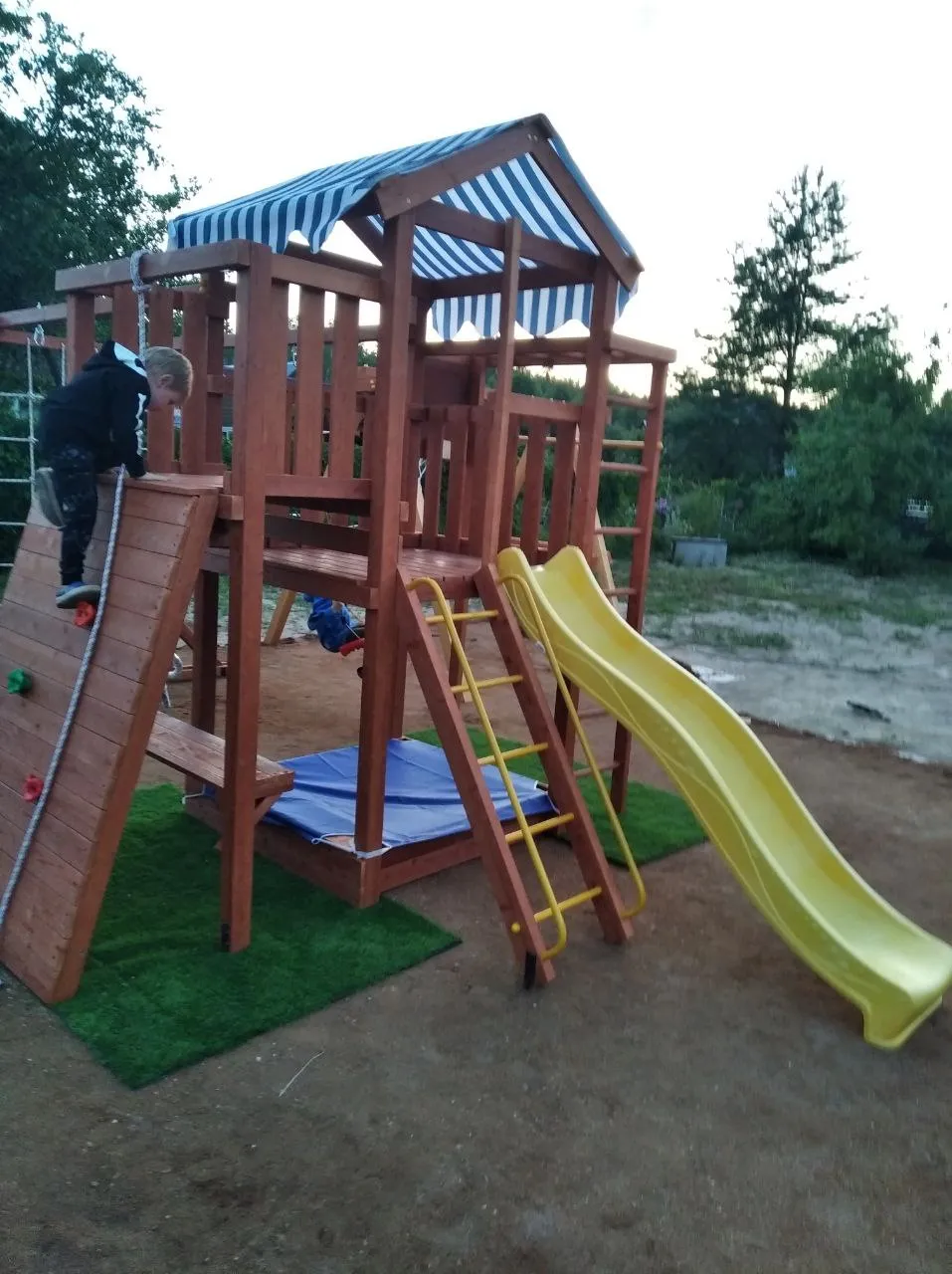 Игровая башня с крышей защищает от солнца и осадков, создавая удобное место для игр. Песочница с лавочкой позволяет детям комфортно играть, не касаясь песка.