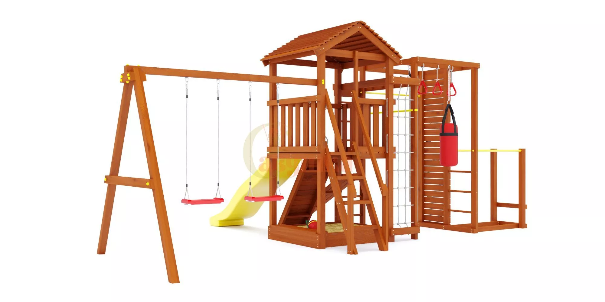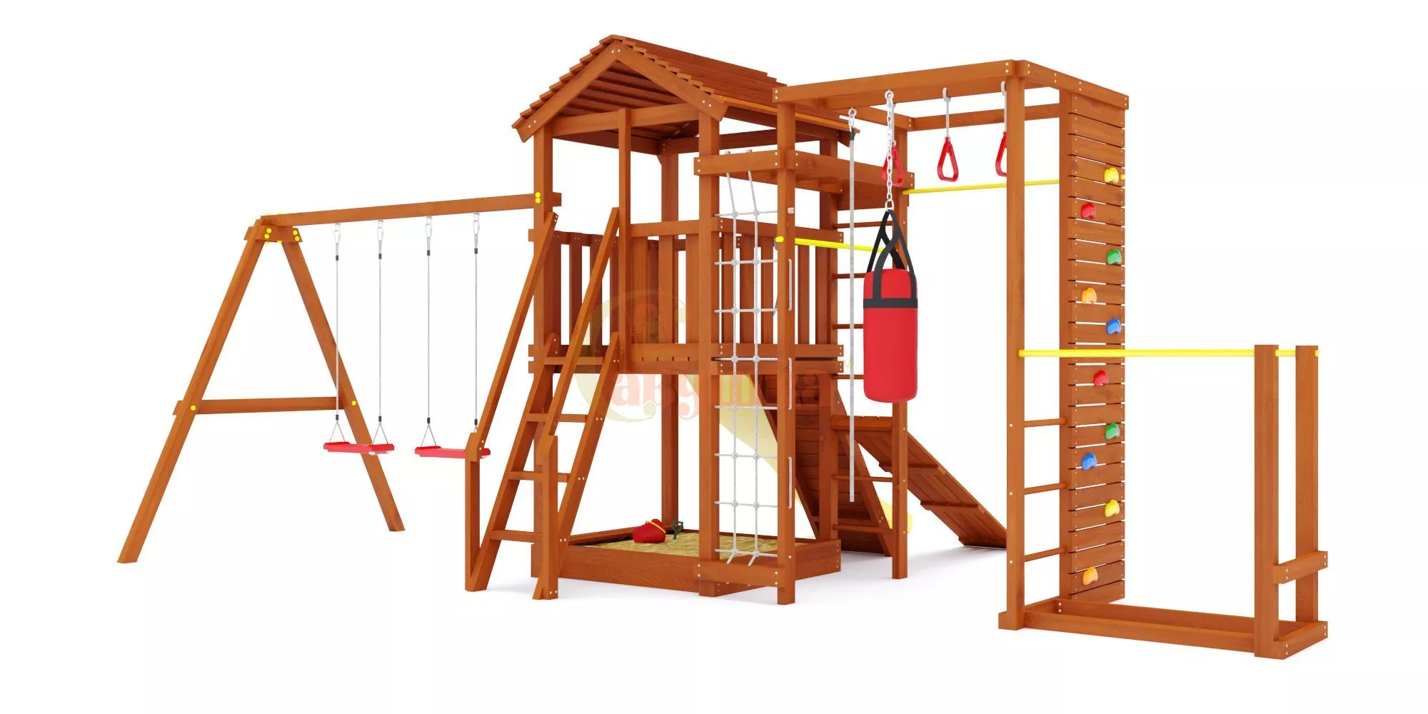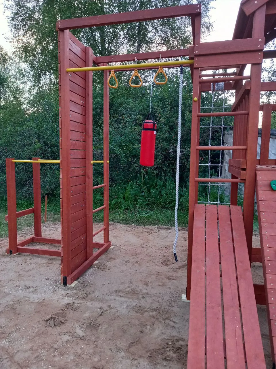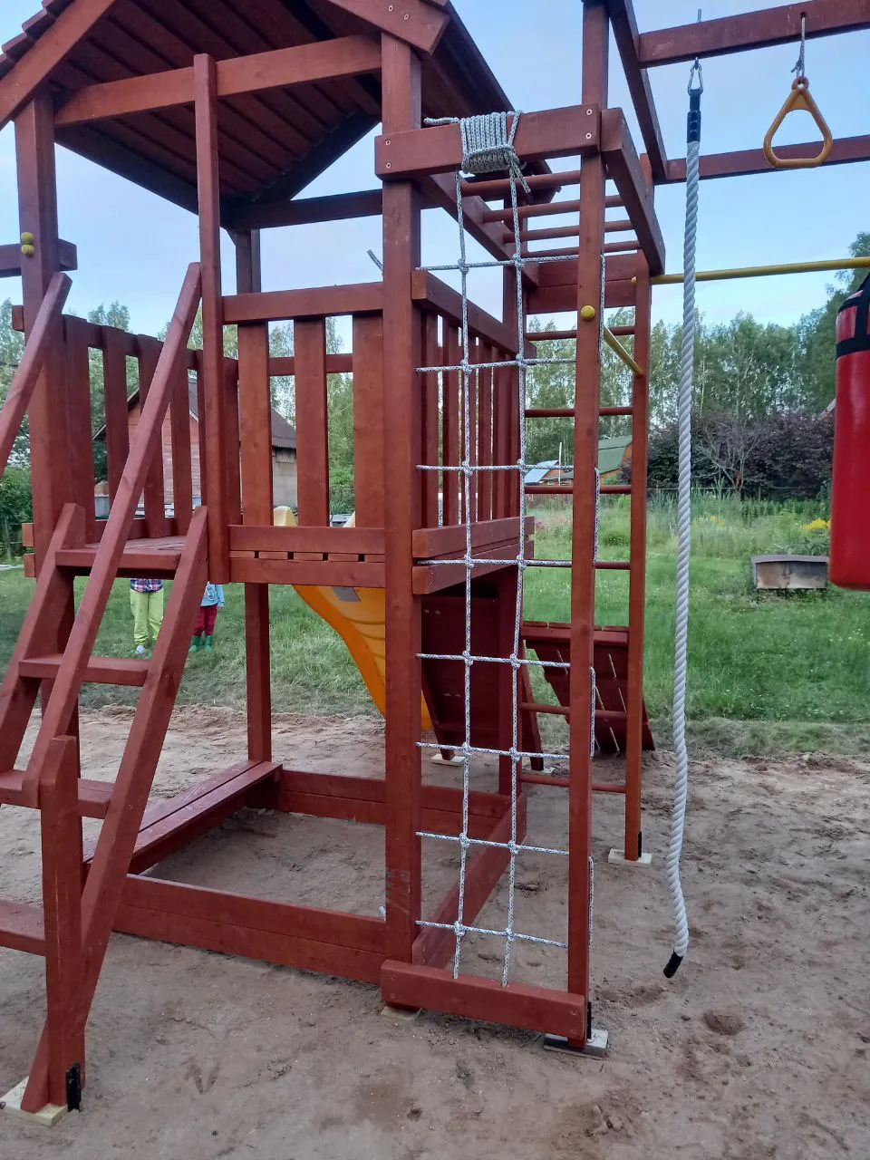 Благодаря спортивным элементам дети могут тренировать мышцы, улучшать гибкость и координацию движений. Рукоход, гимнастические кольца, турники и скалодром делают занятия спортом увлекательными, а разнообразные качели и горка добавляют радость в каждую игру.