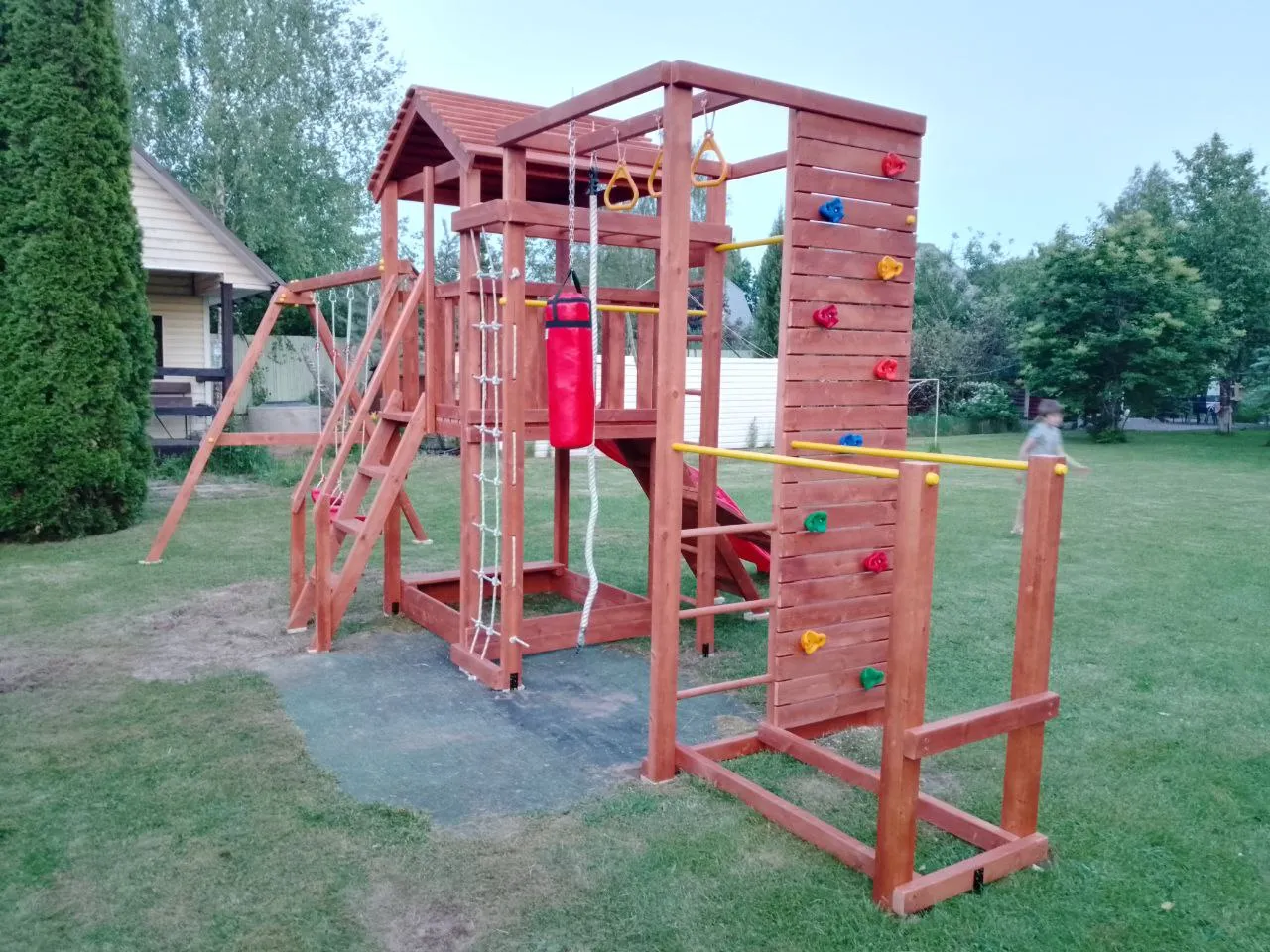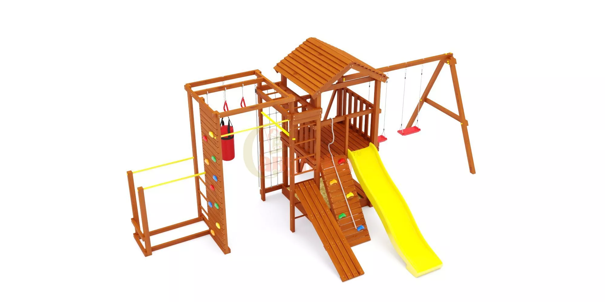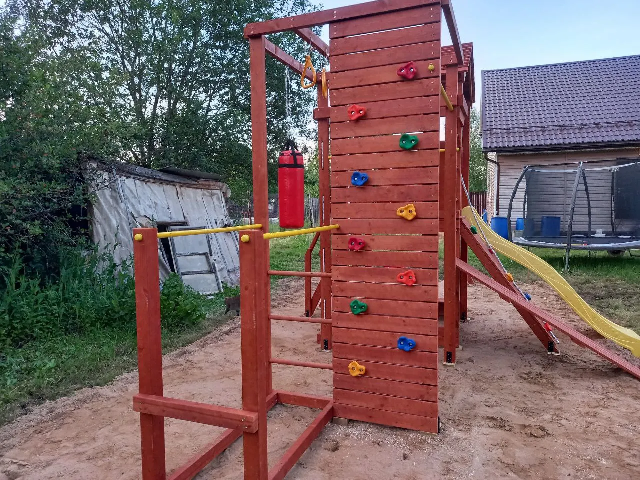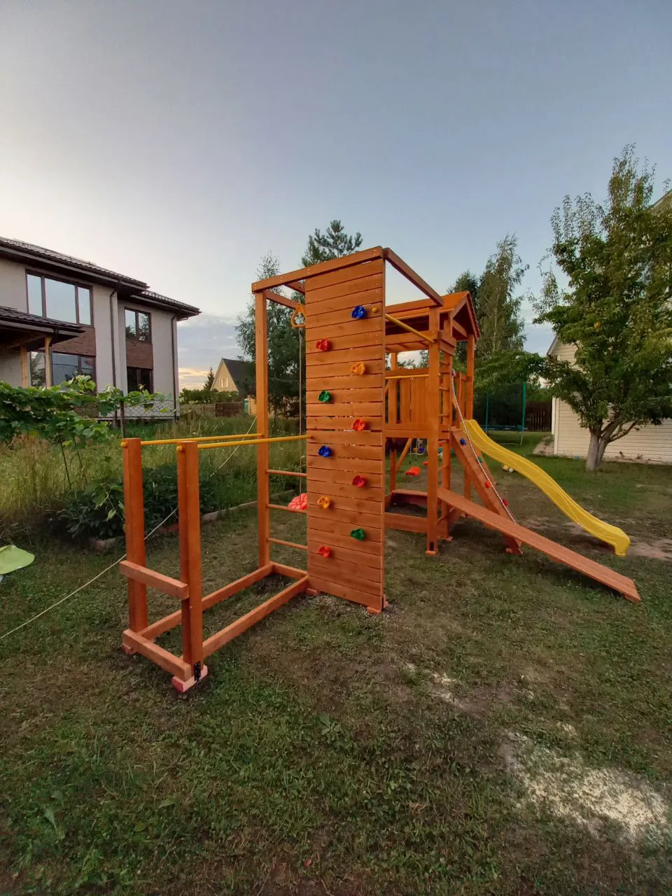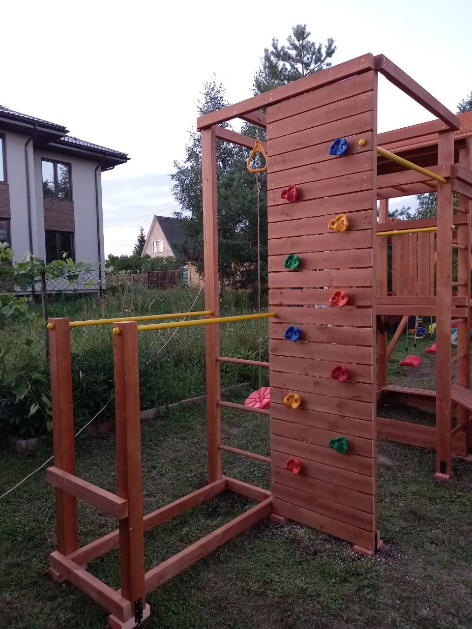 Благодаря спортивным элементам дети могут тренировать мышцы, улучшать гибкость и координацию движений. Рукоход, гимнастические кольца, турники и скалодром делают занятия спортом увлекательными, а разнообразные качели и горка добавляют радость в каждую игру.