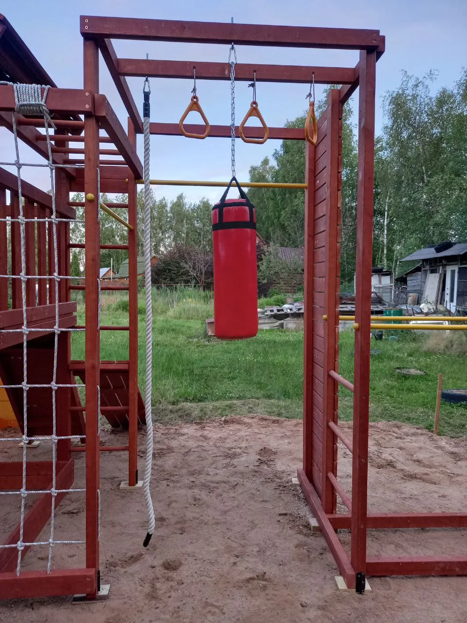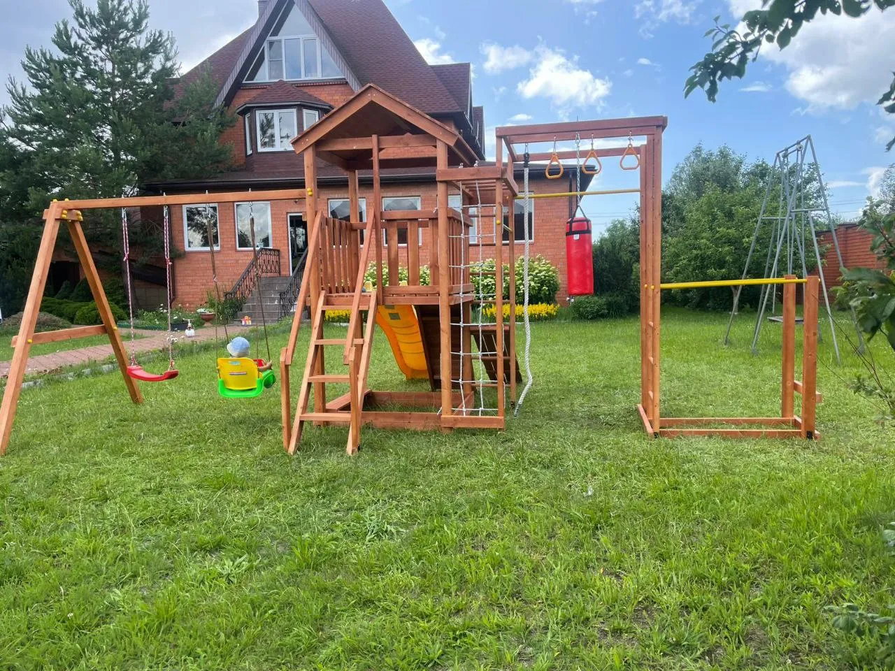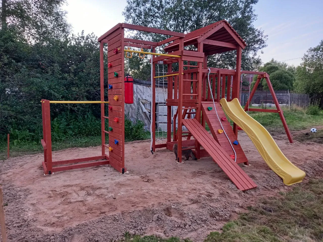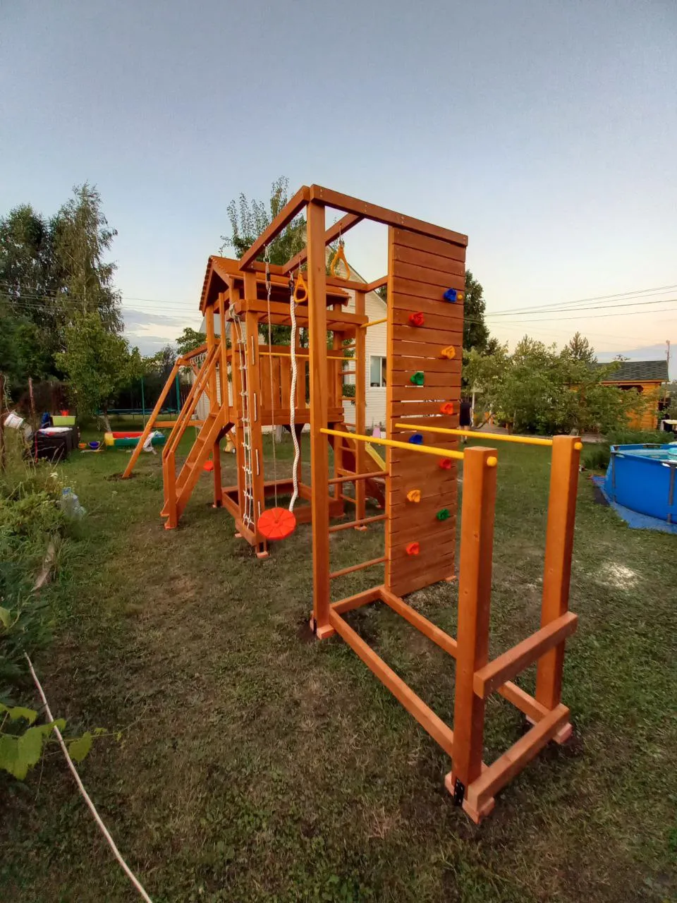 Благодаря спортивным элементам дети могут тренировать мышцы, улучшать гибкость и координацию движений. Рукоход, гимнастические кольца, турники и скалодром делают занятия спортом увлекательными, а разнообразные качели и горка добавляют радость в каждую игру.