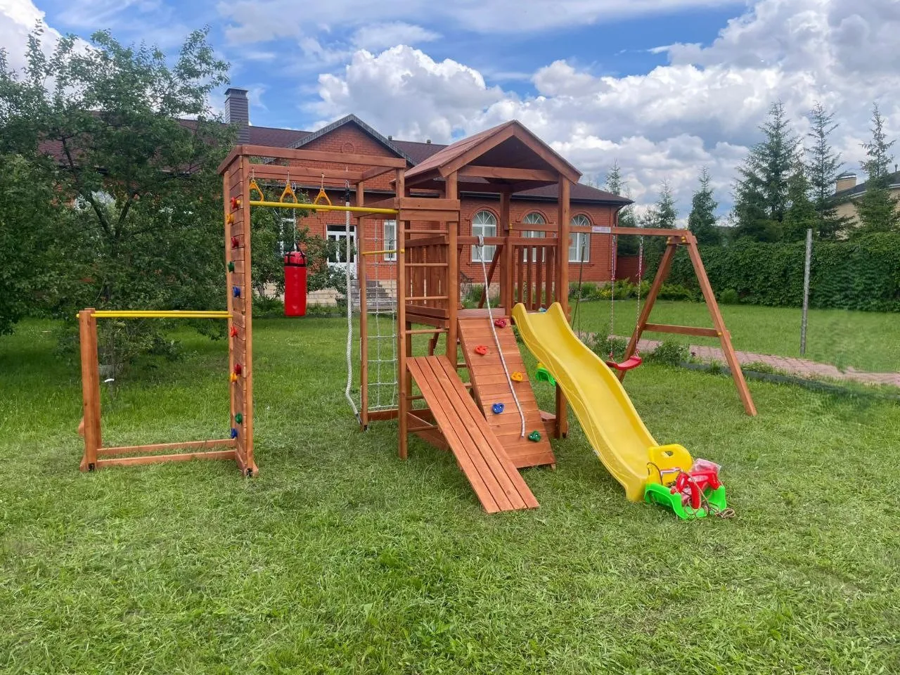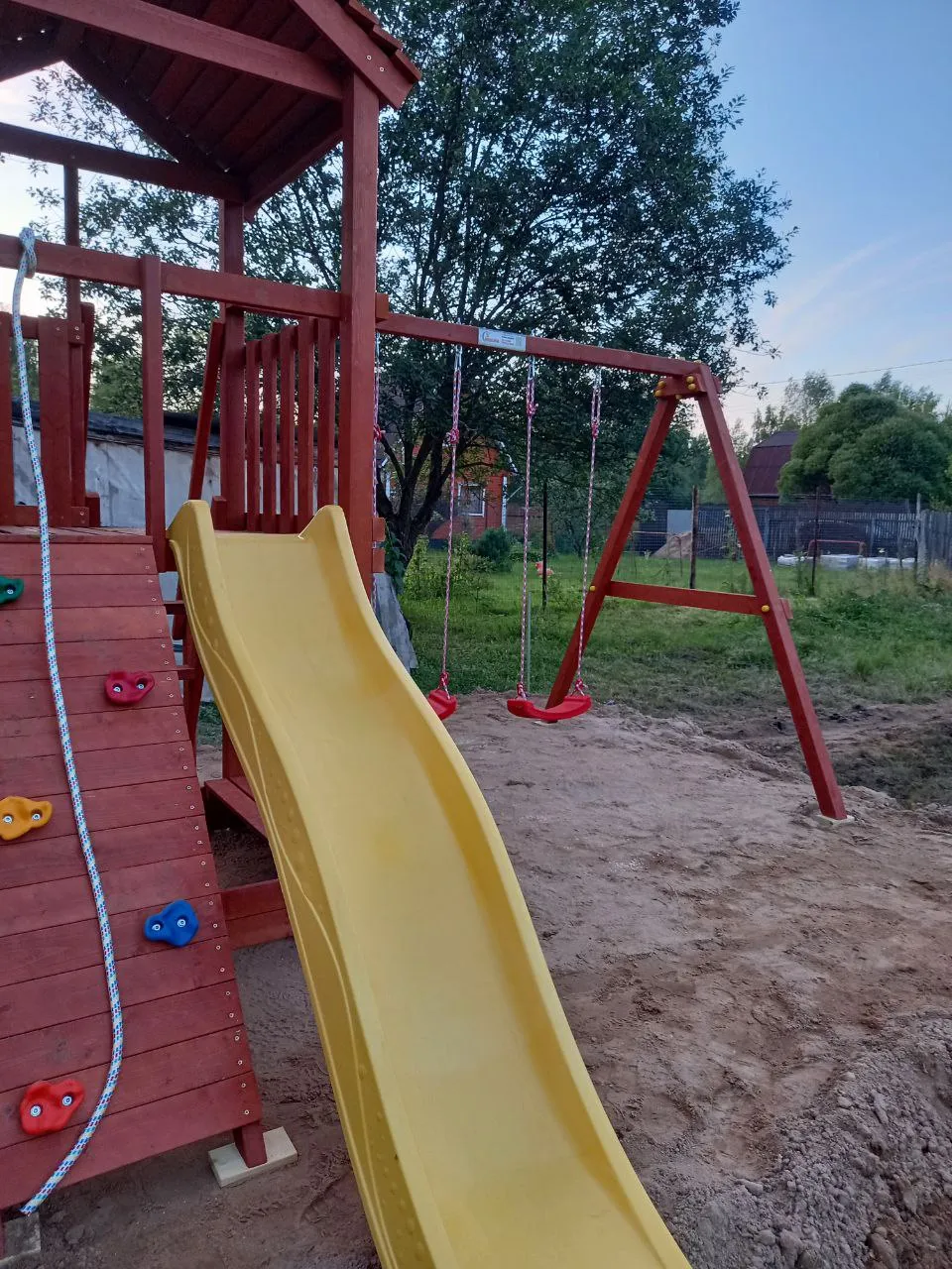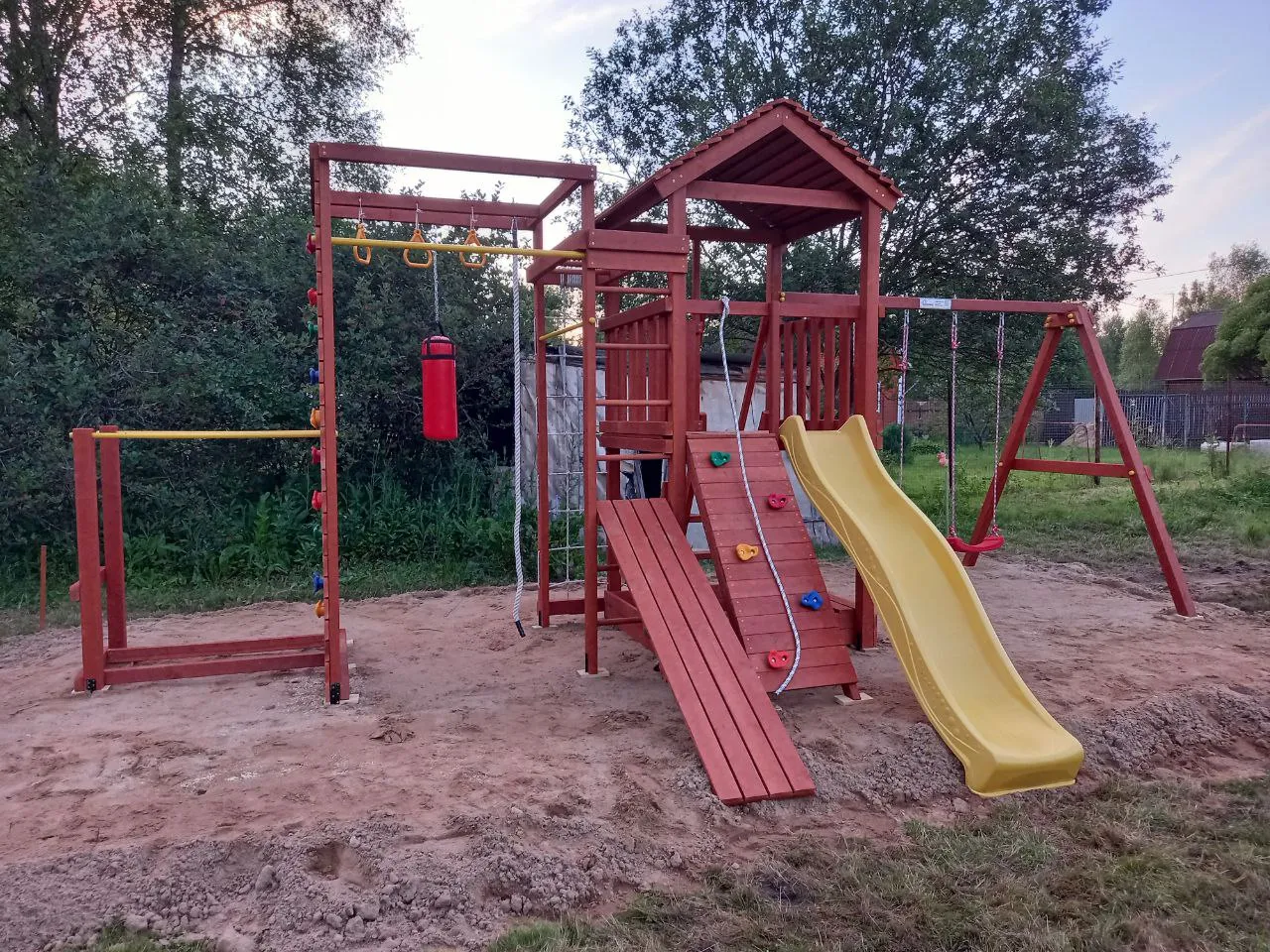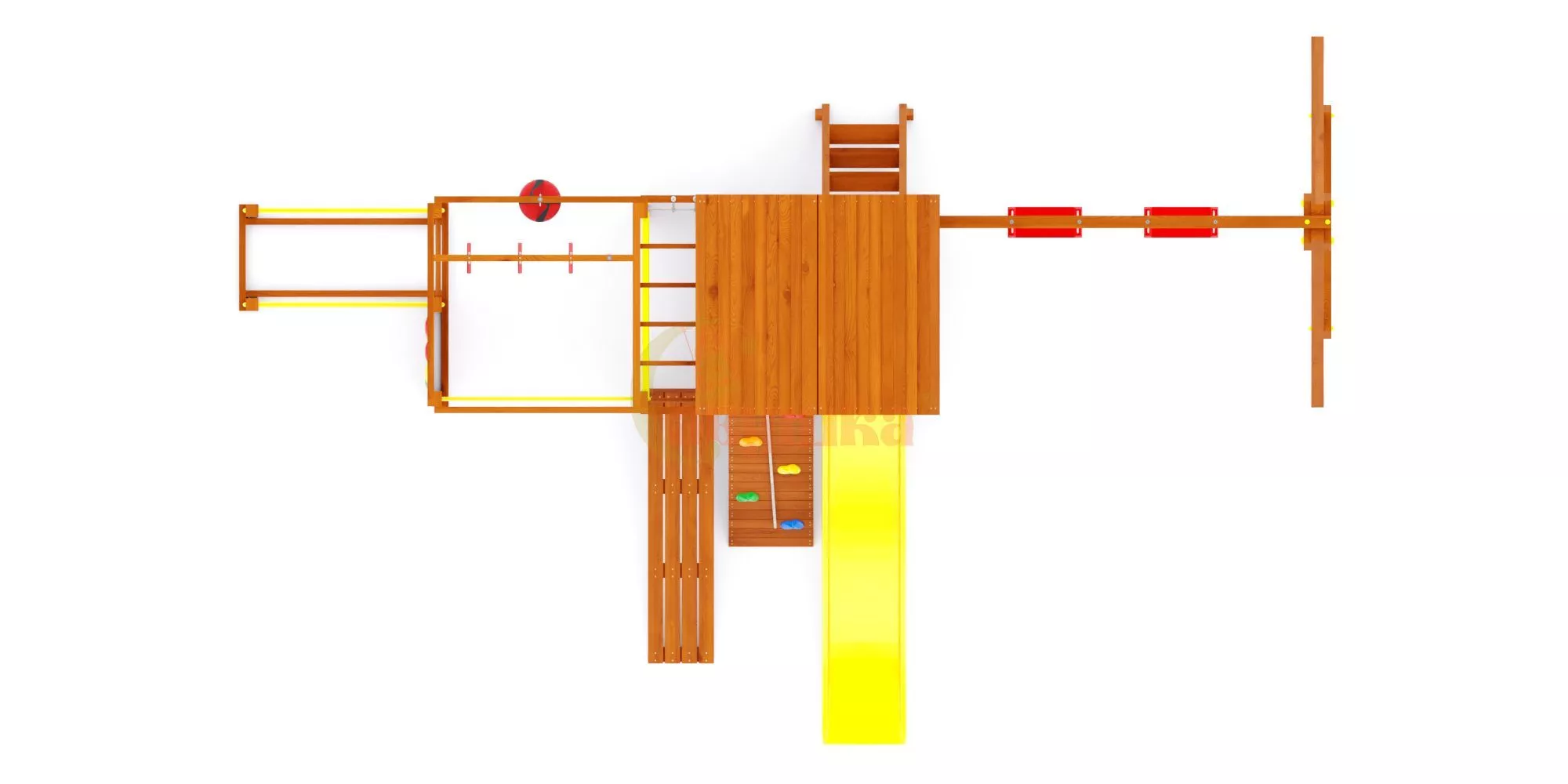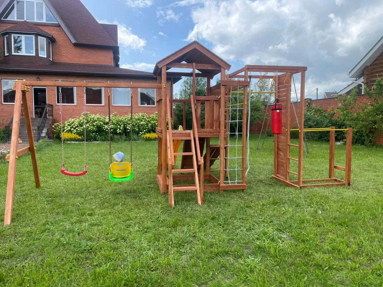 Благодаря спортивным элементам дети могут тренировать мышцы, улучшать гибкость и координацию движений. Рукоход, гимнастические кольца, турники и скалодром делают занятия спортом увлекательными, а разнообразные качели и горка добавляют радость в каждую игру.