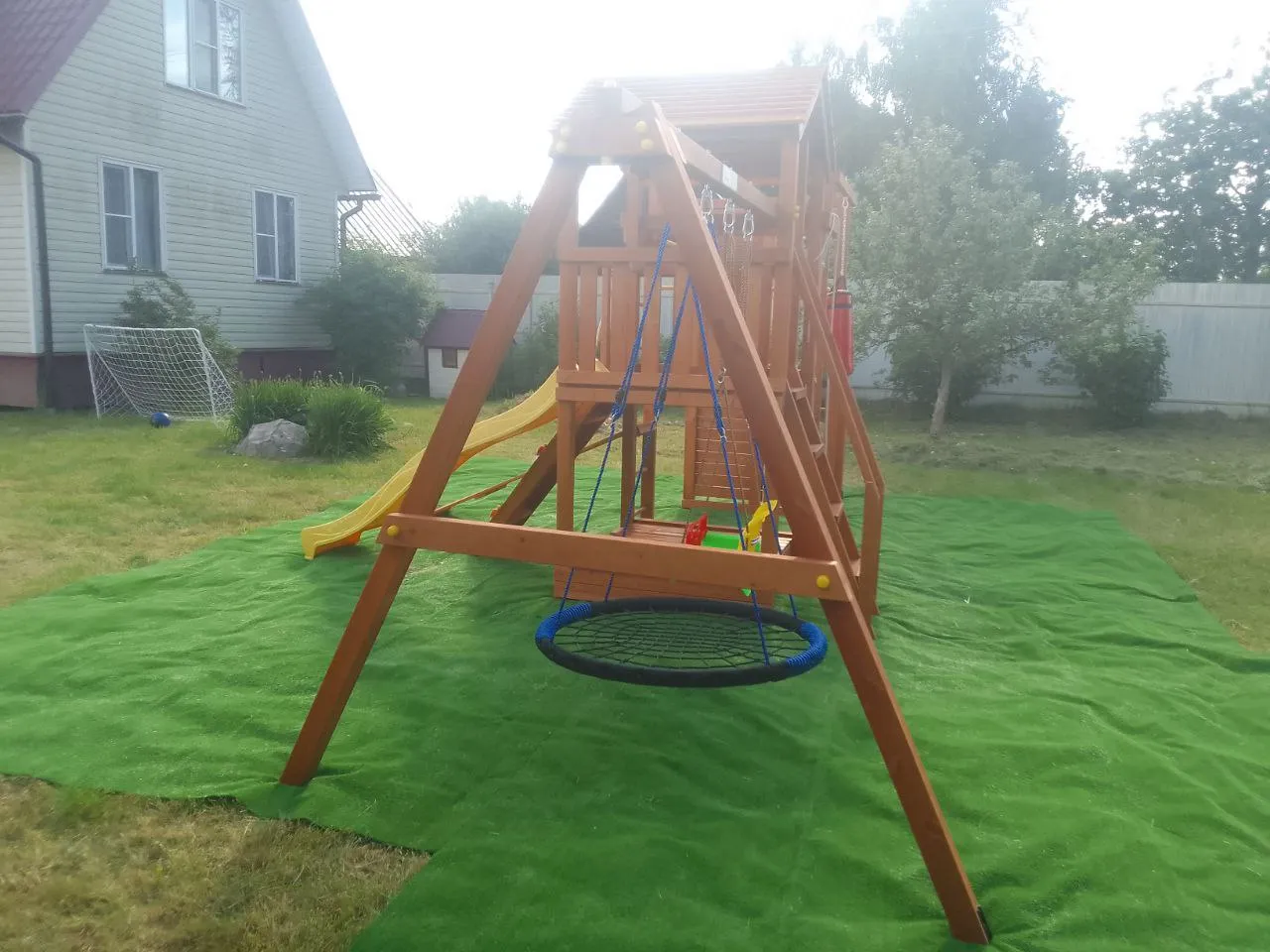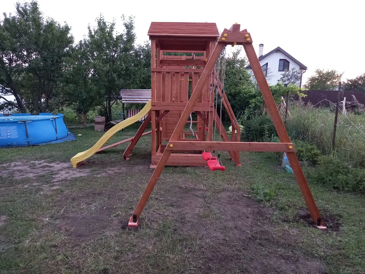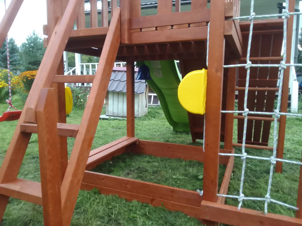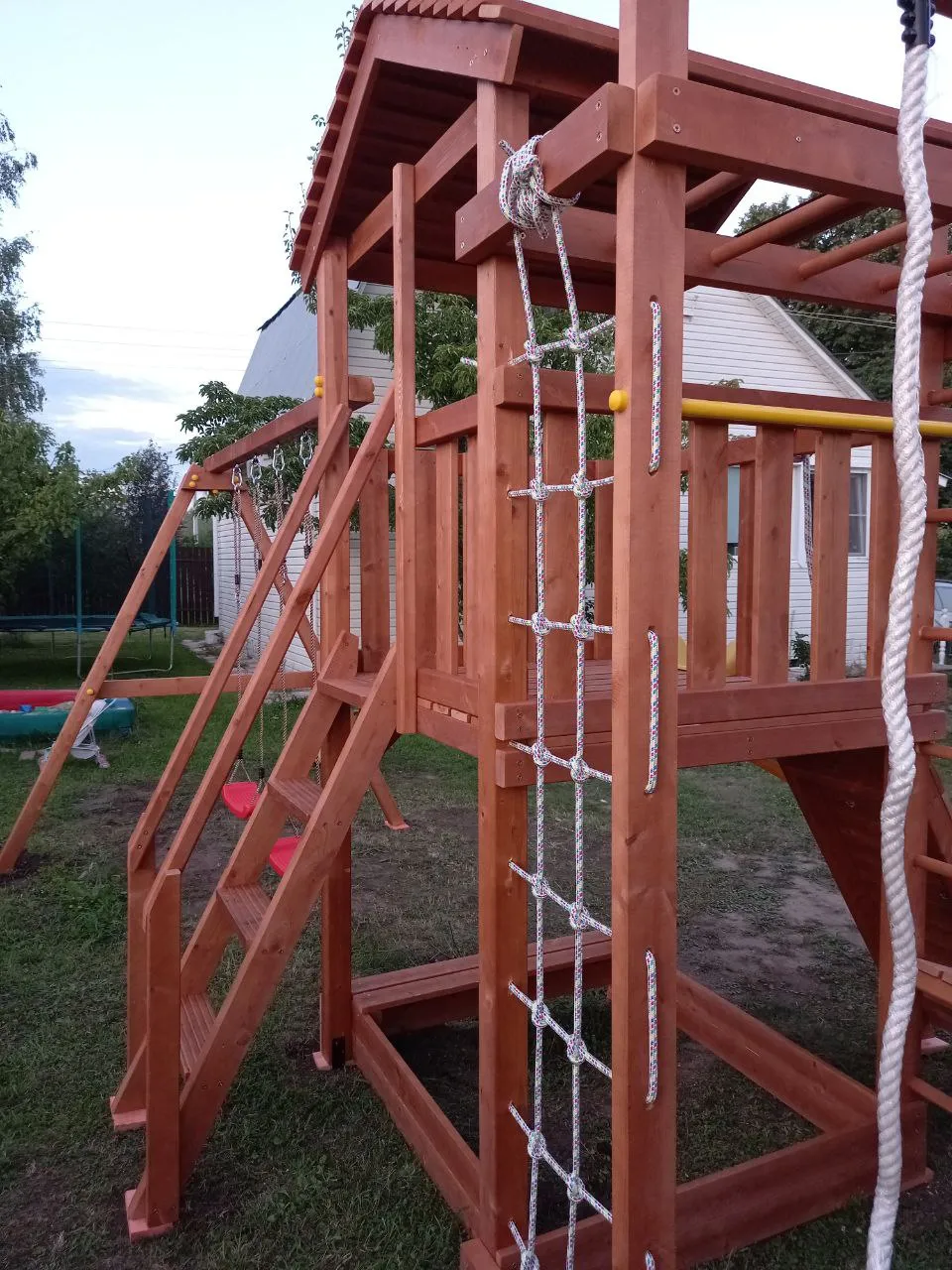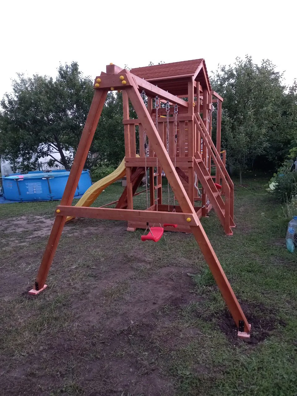 Комплекс выполнен из качественной древесины, обработанной для защиты от внешних воздействий. Все соединения надежно закреплены, а болтовые соединения закрыты пластиковыми заглушками.