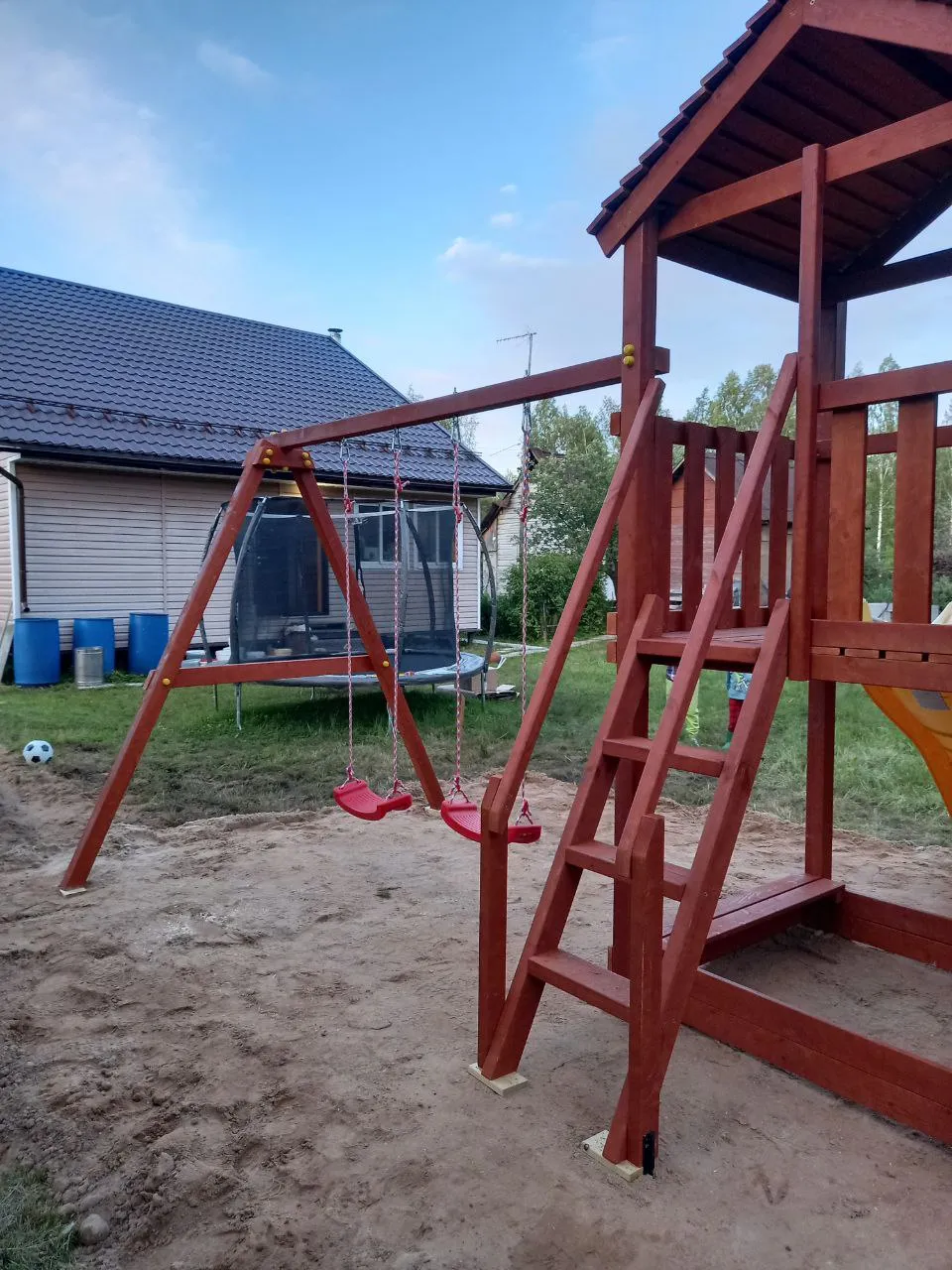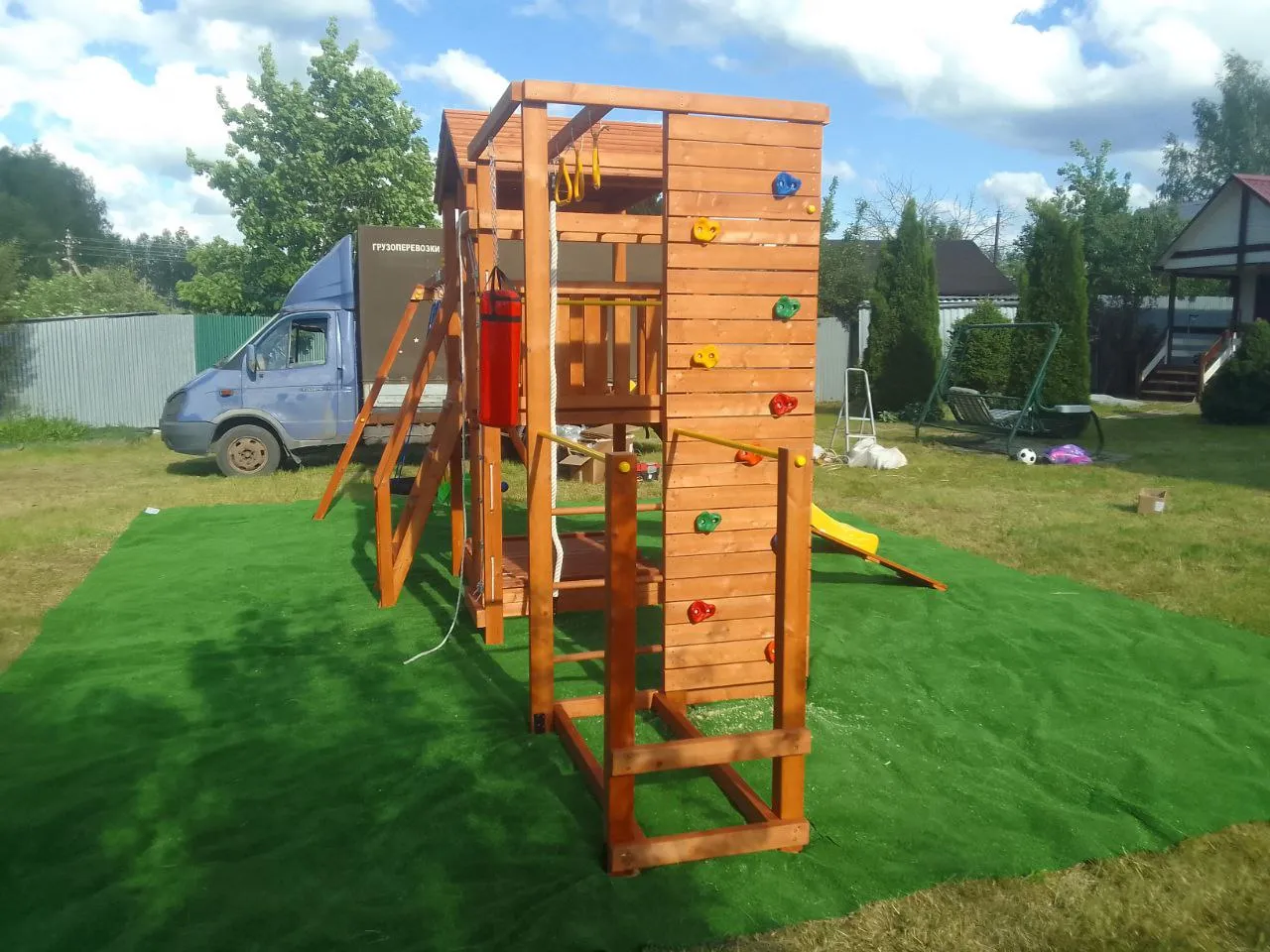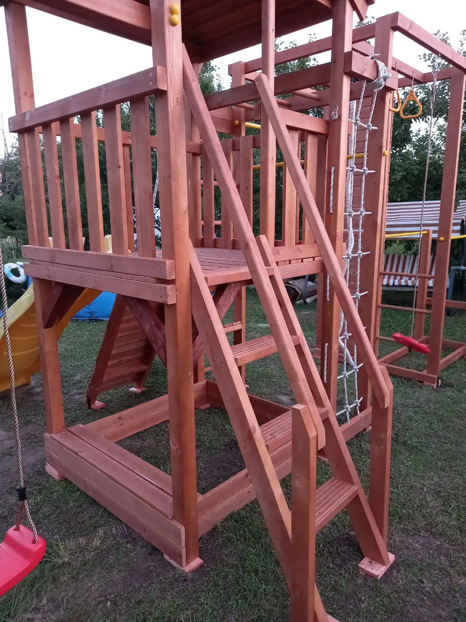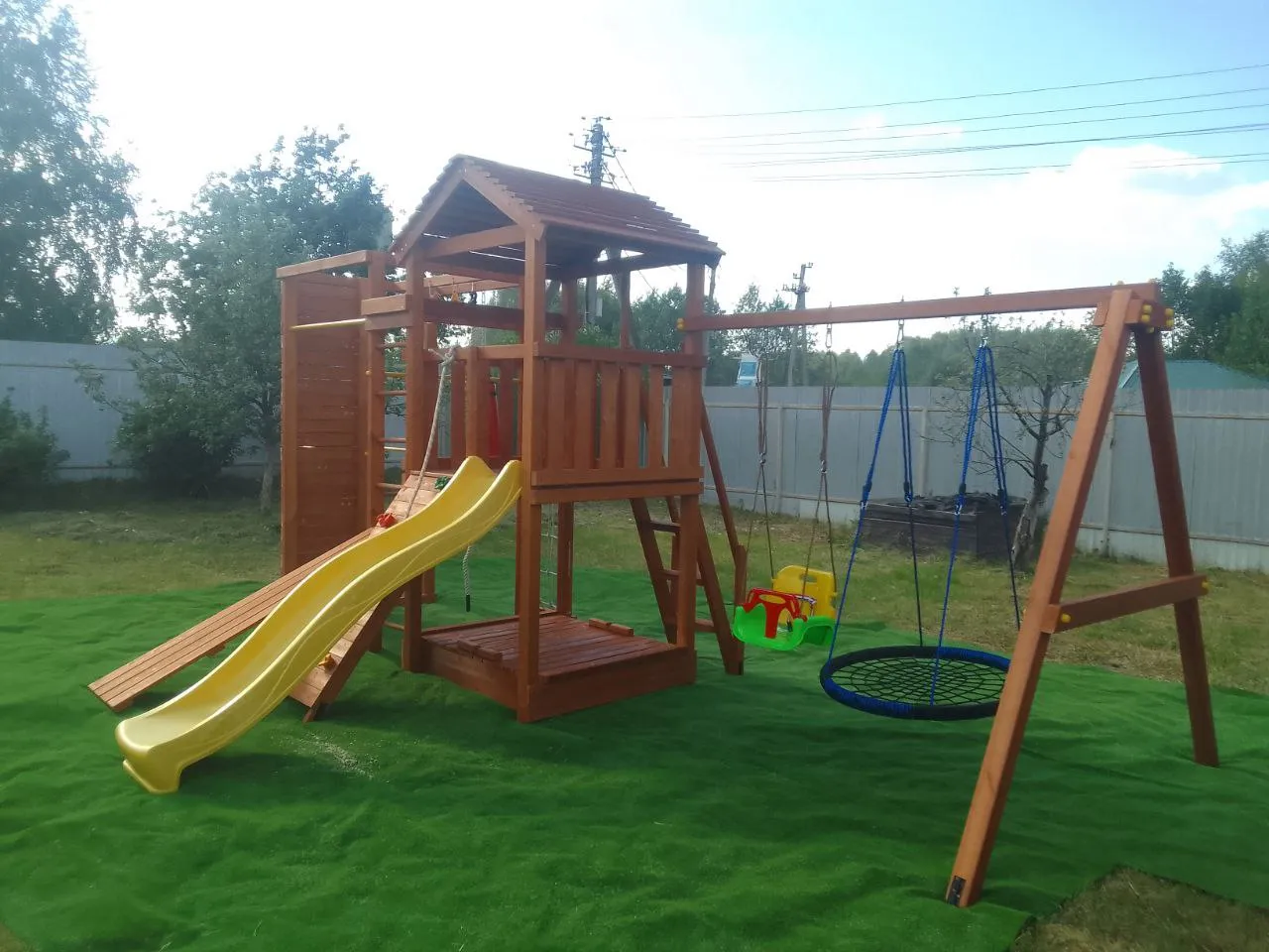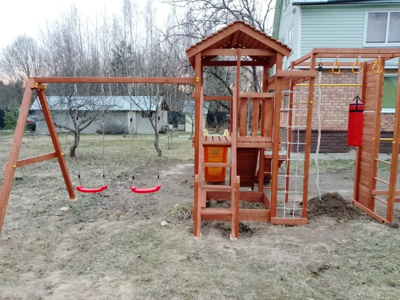 Комплекс выполнен из качественной древесины, обработанной для защиты от внешних воздействий. Все соединения надежно закреплены, а болтовые соединения закрыты пластиковыми заглушками.