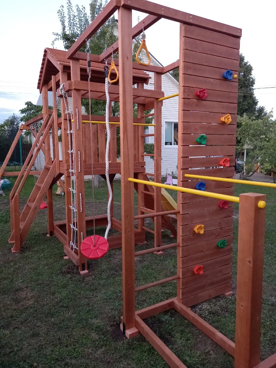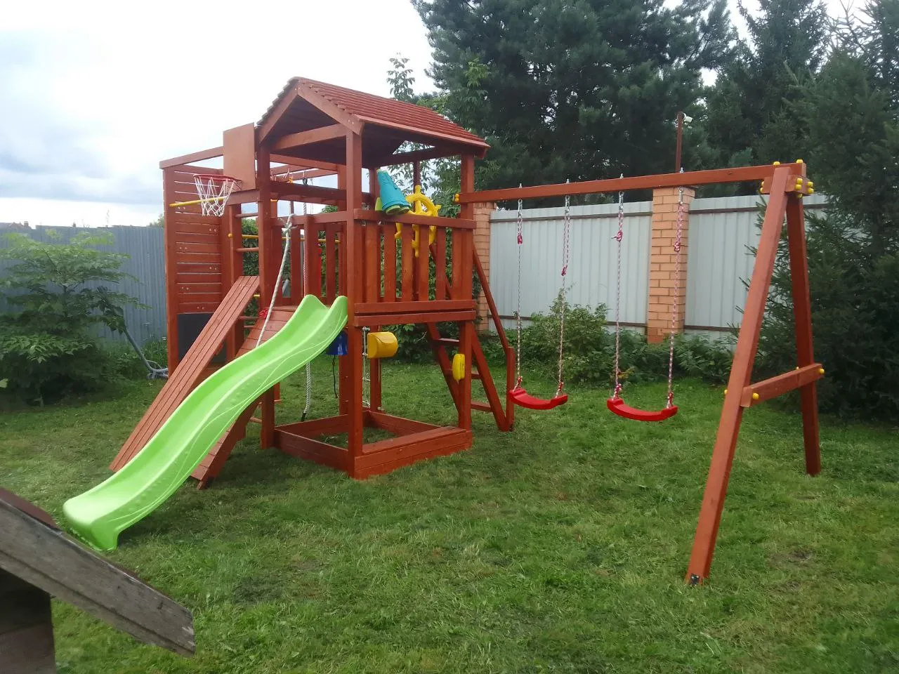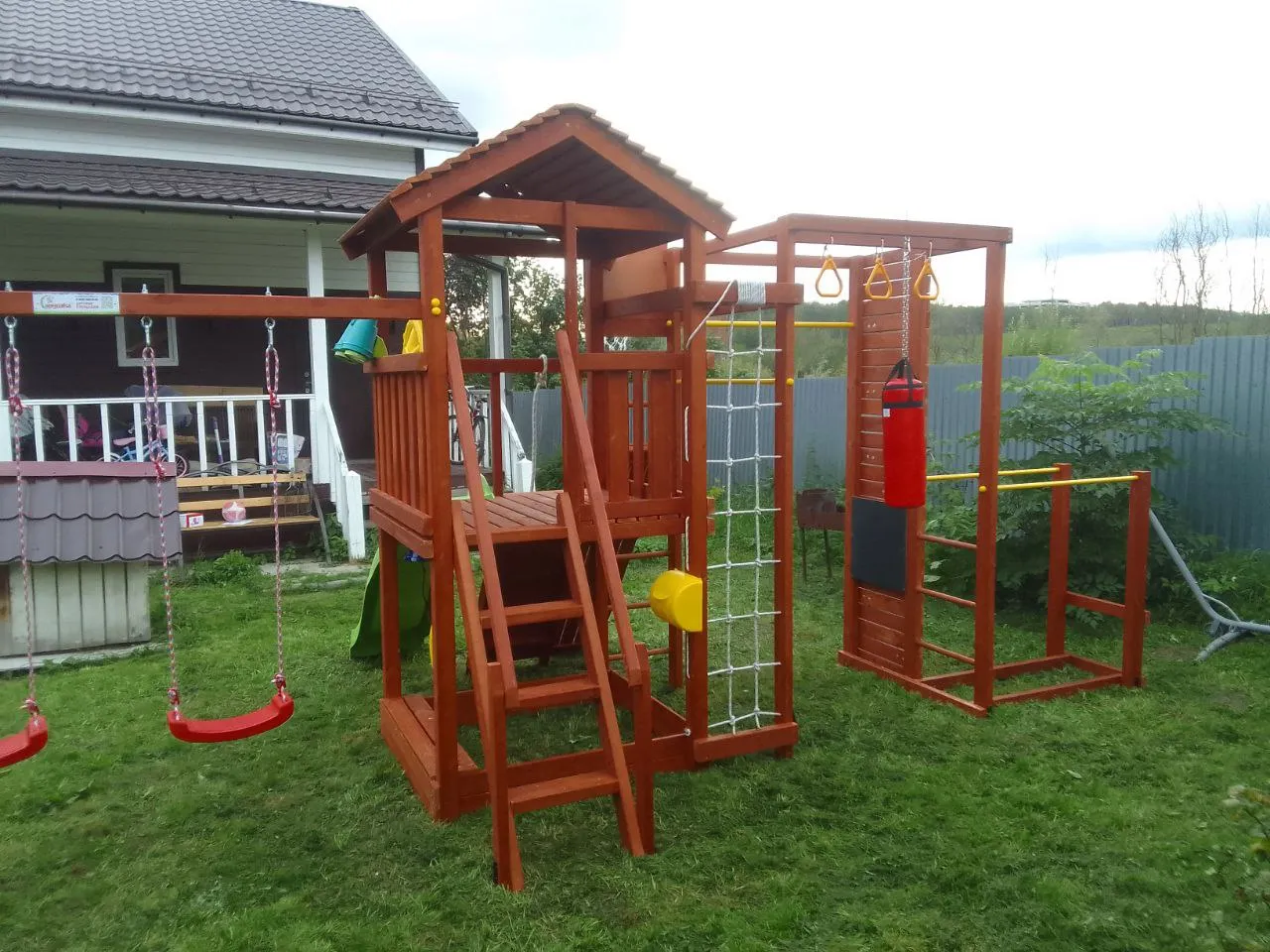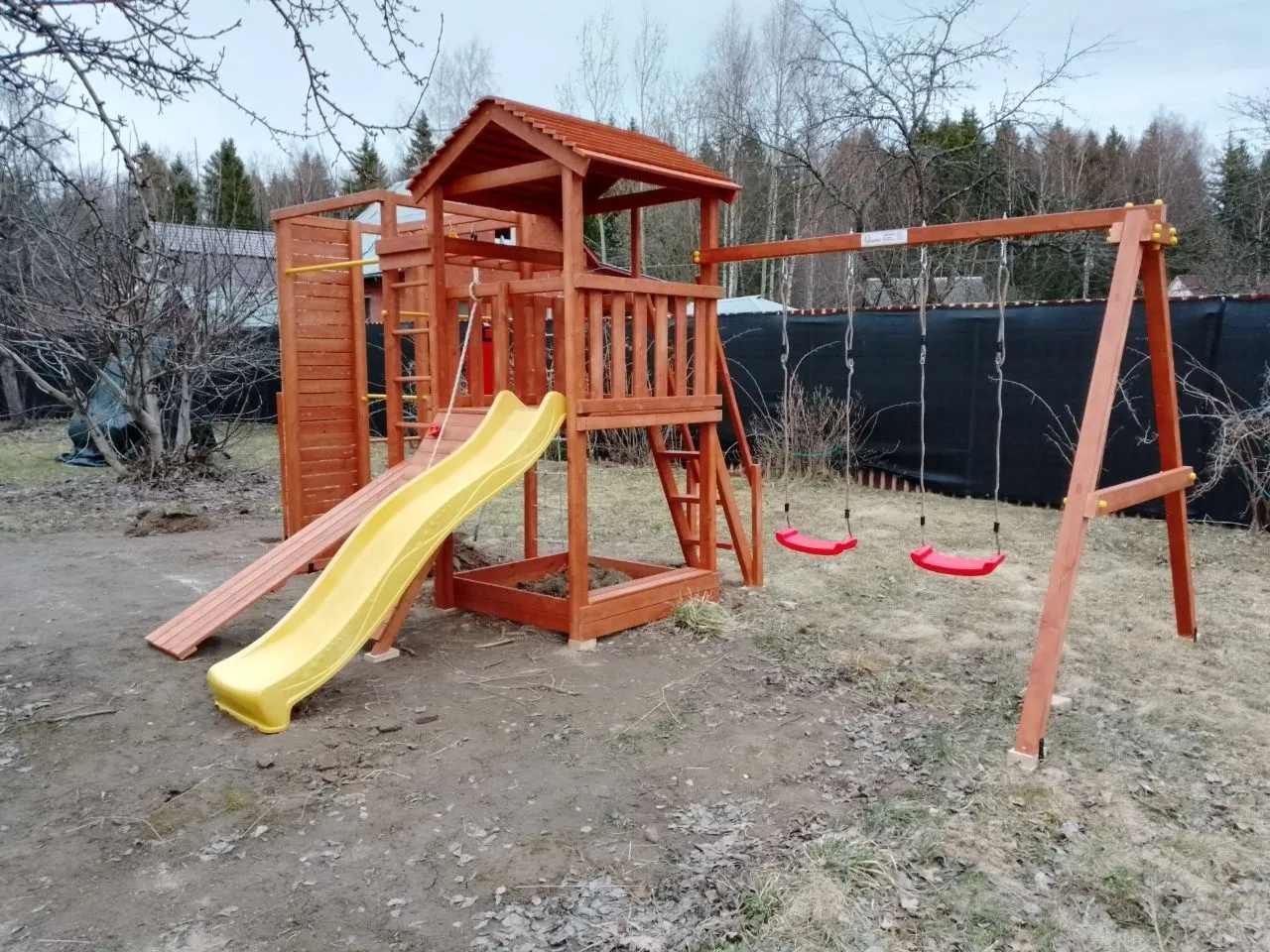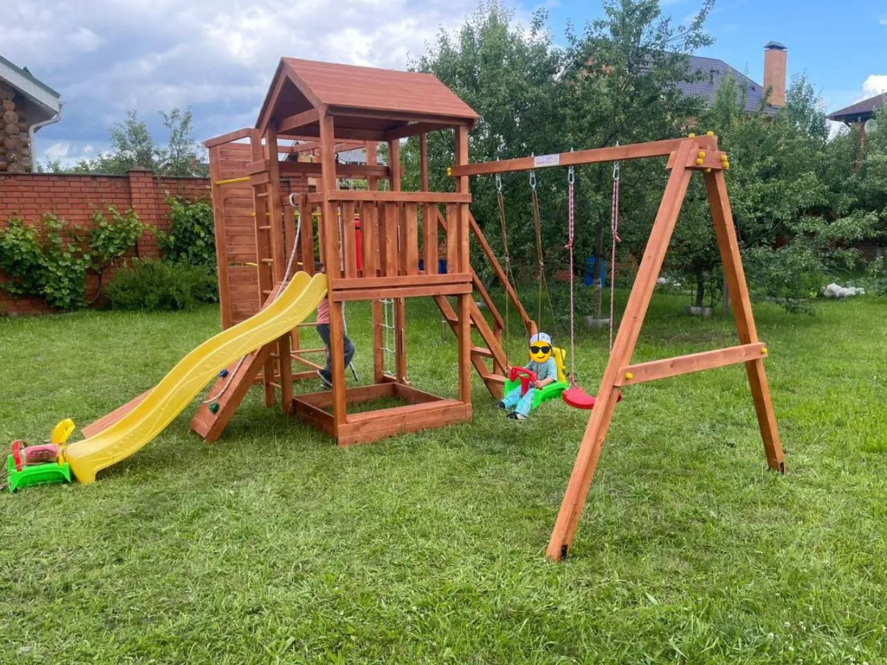 Комплекс выполнен из качественной древесины, обработанной для защиты от внешних воздействий. Все соединения надежно закреплены, а болтовые соединения закрыты пластиковыми заглушками.