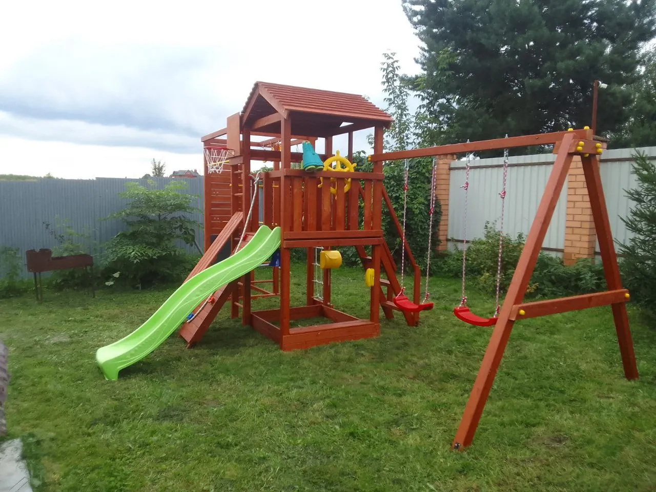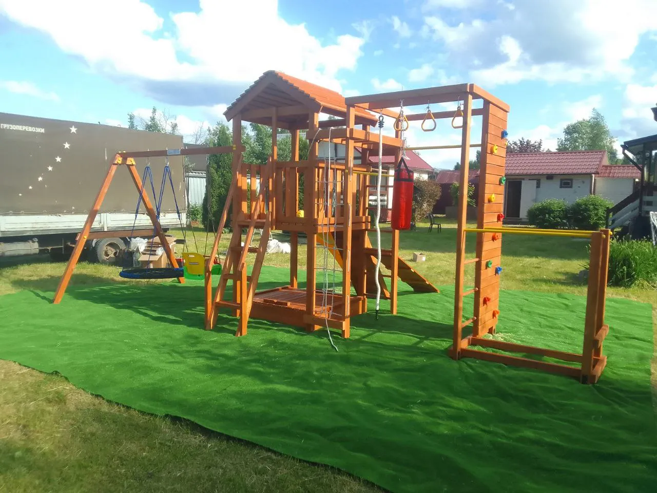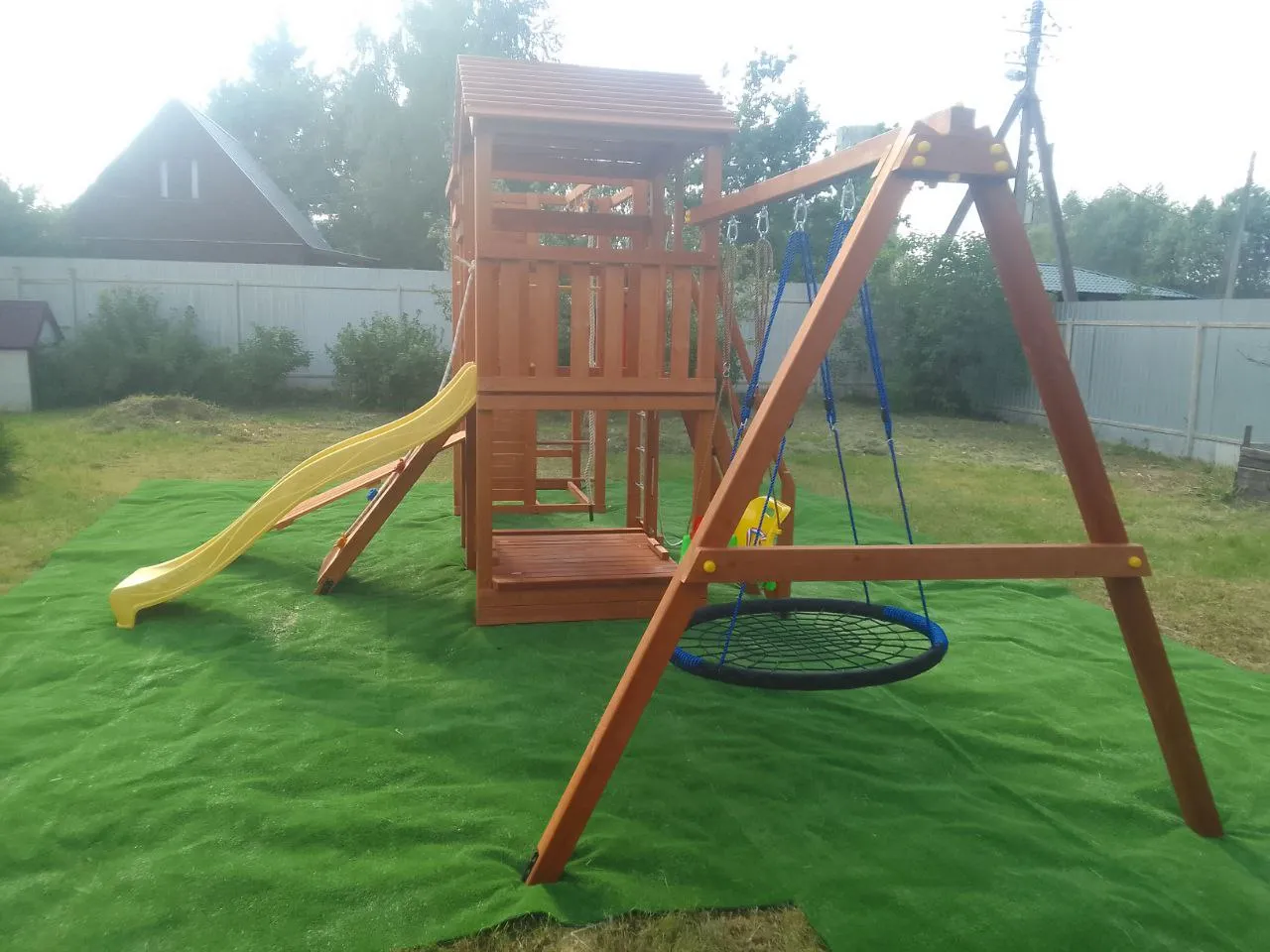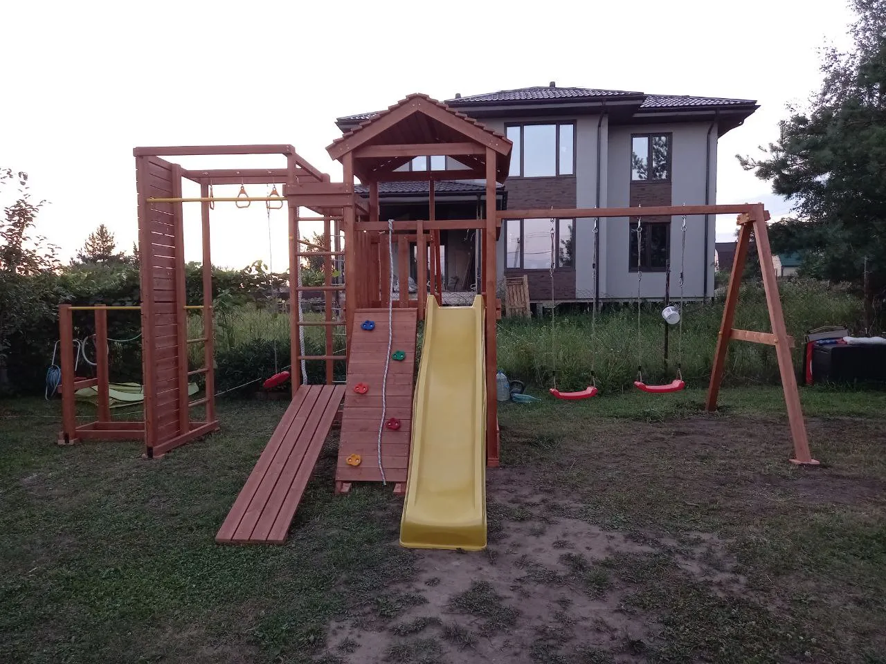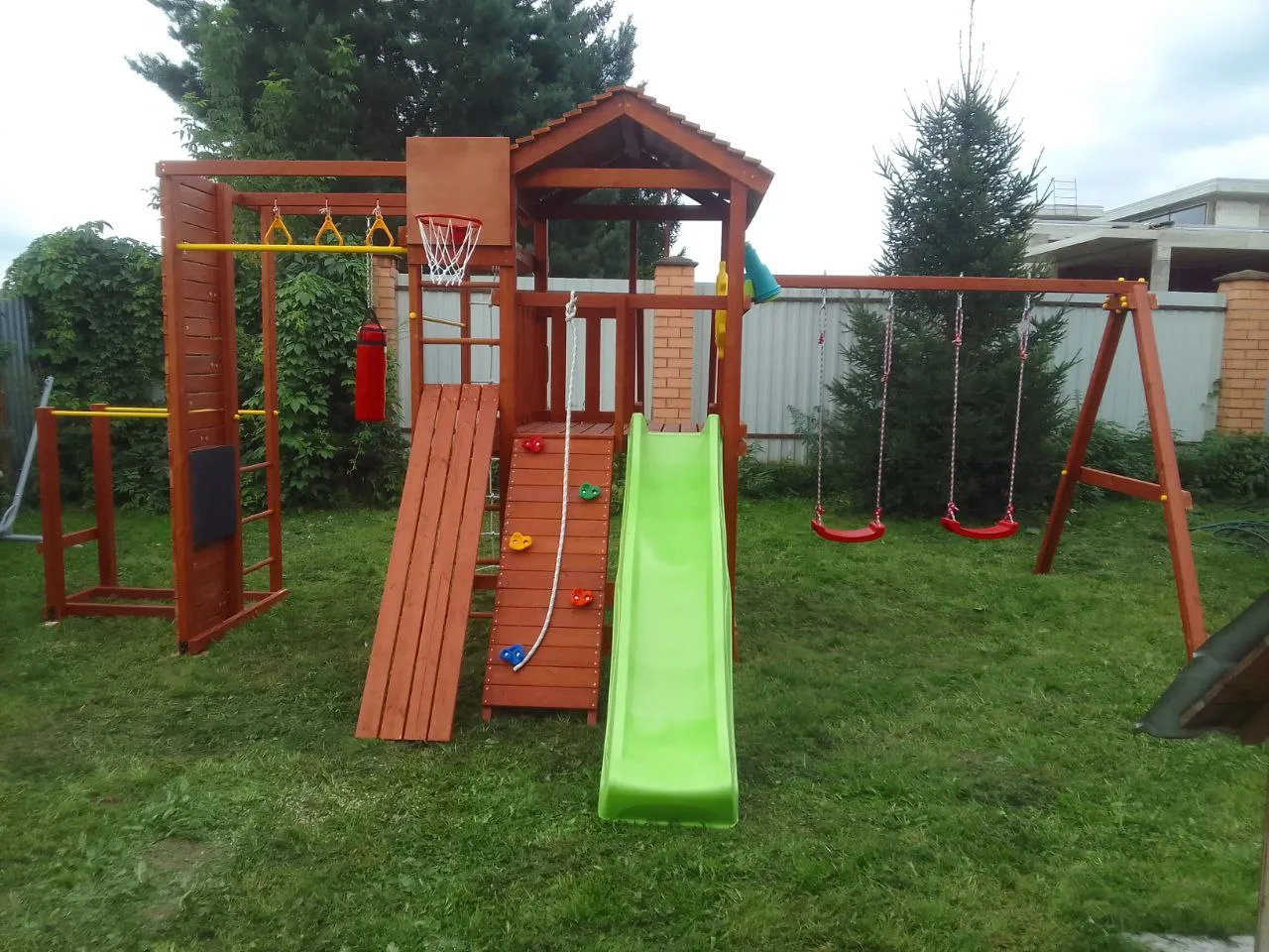 Комплекс выполнен из качественной древесины, обработанной для защиты от внешних воздействий. Все соединения надежно закреплены, а болтовые соединения закрыты пластиковыми заглушками.