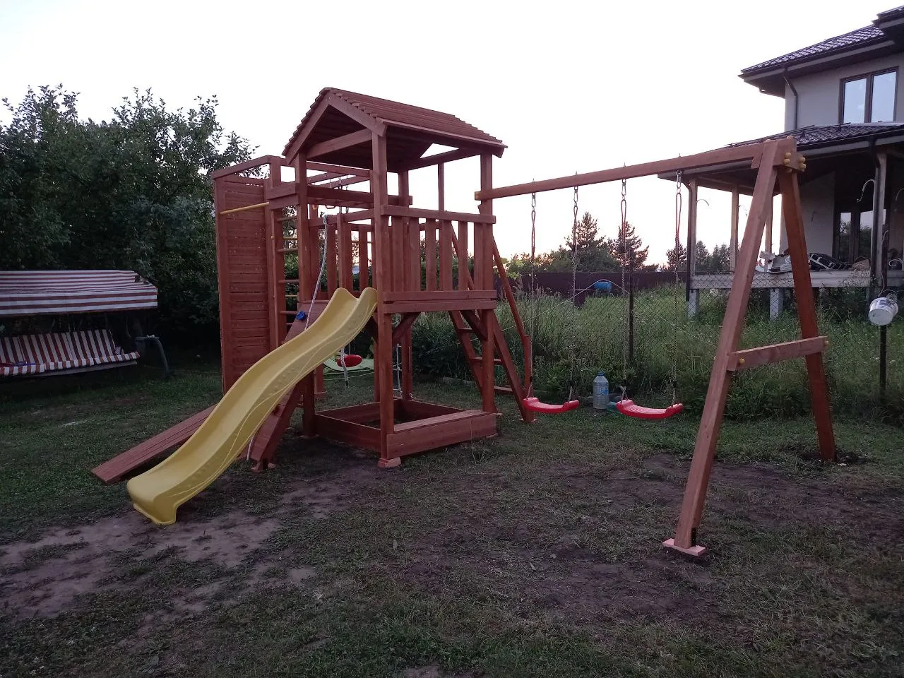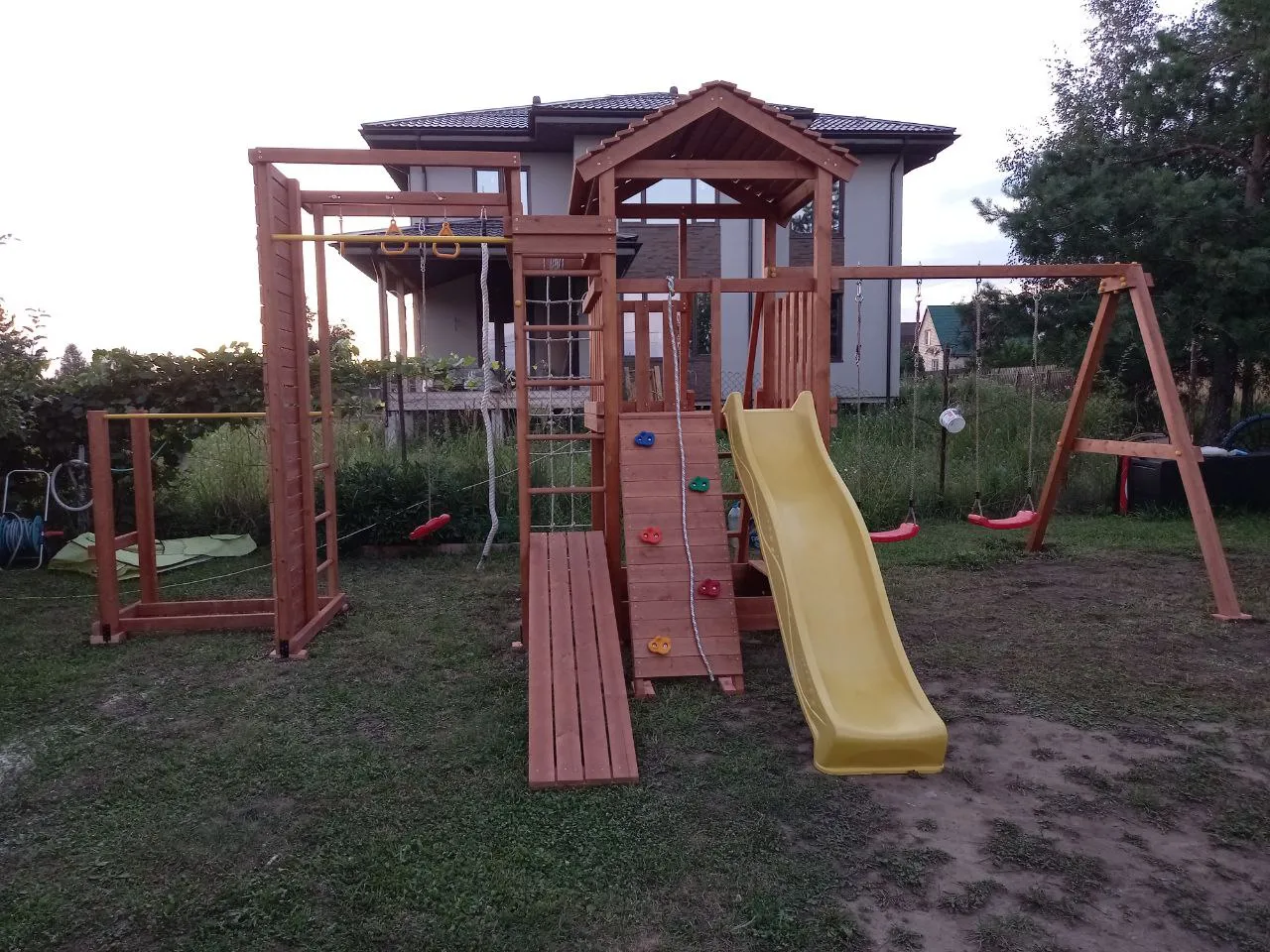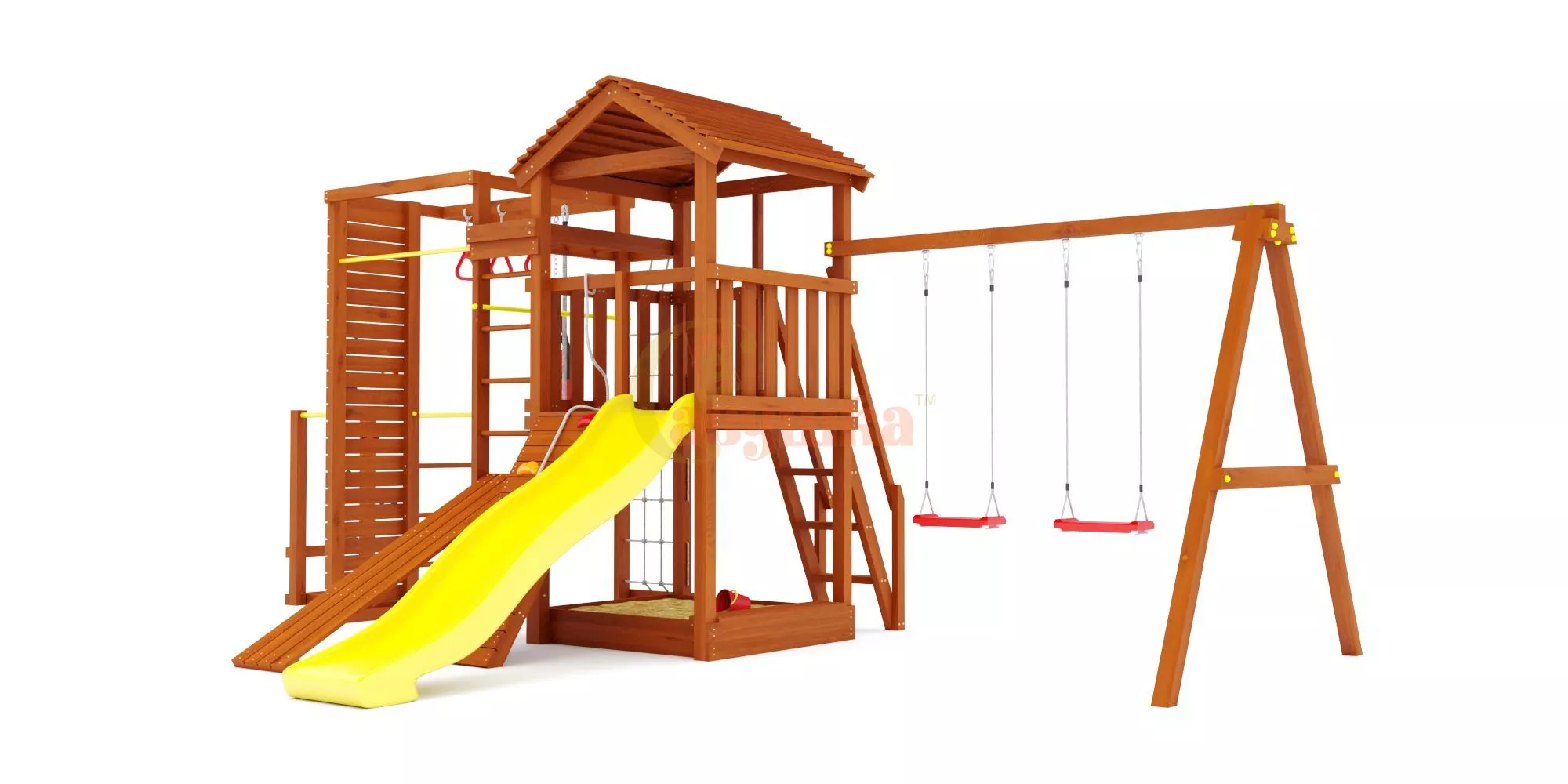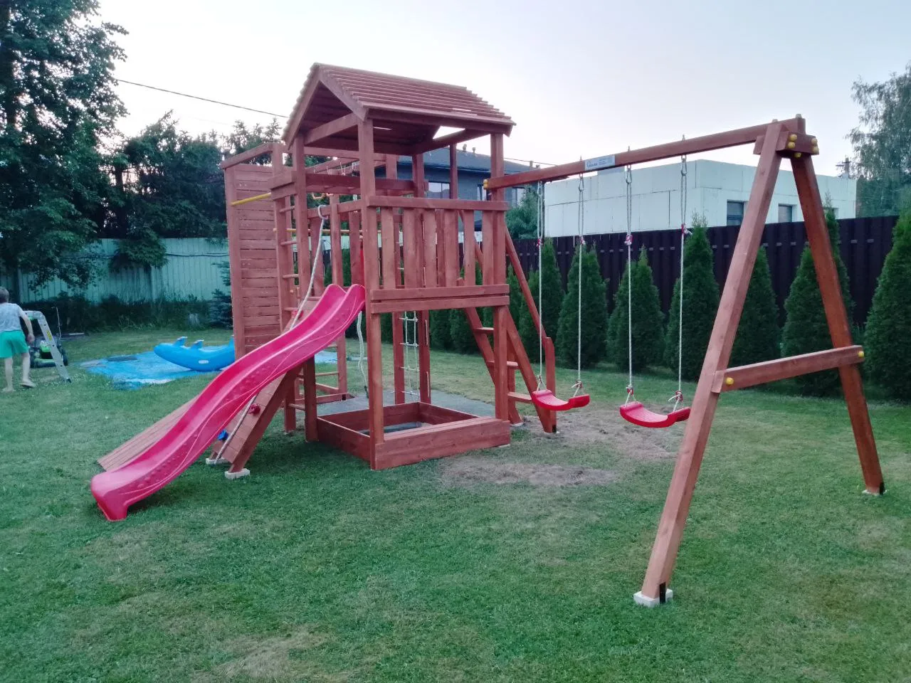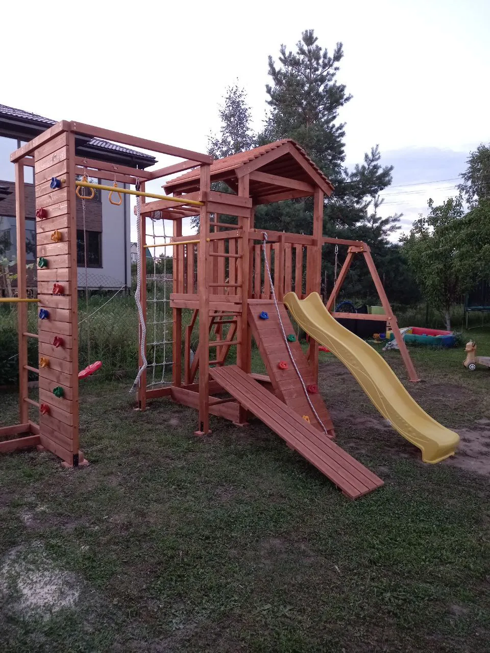 Комплекс выполнен из качественной древесины, обработанной для защиты от внешних воздействий. Все соединения надежно закреплены, а болтовые соединения закрыты пластиковыми заглушками.