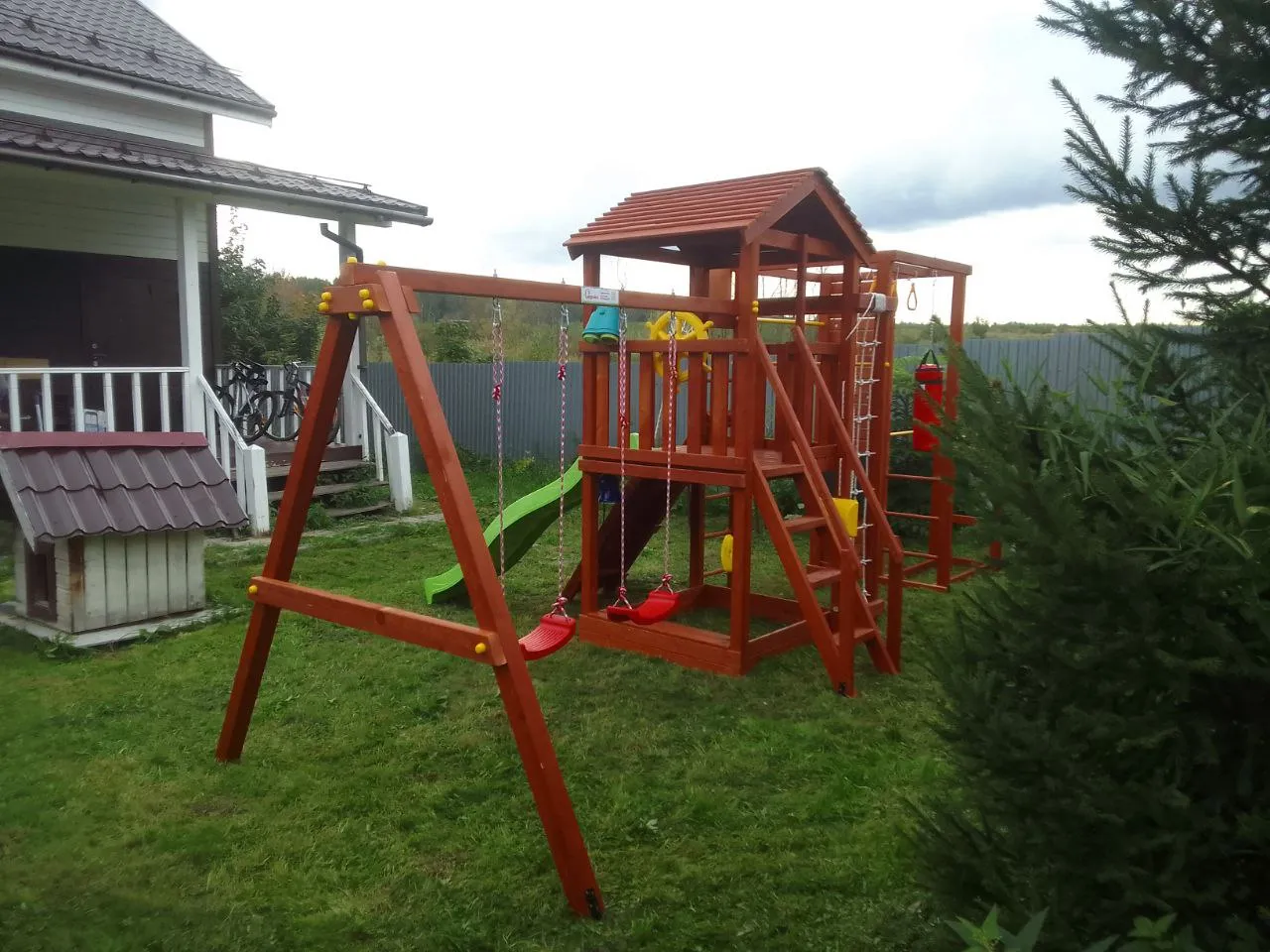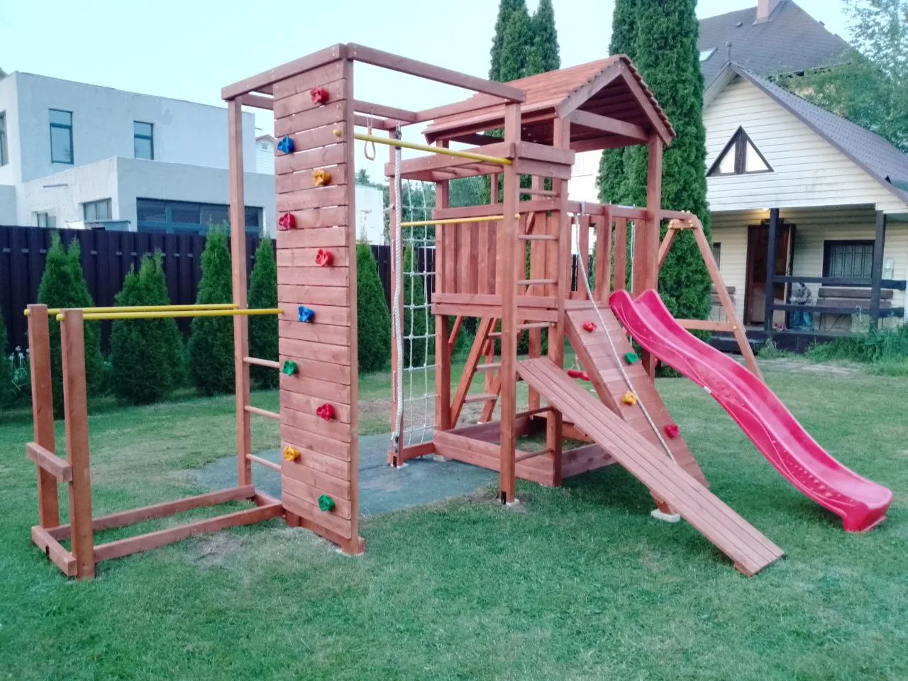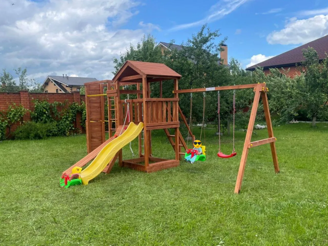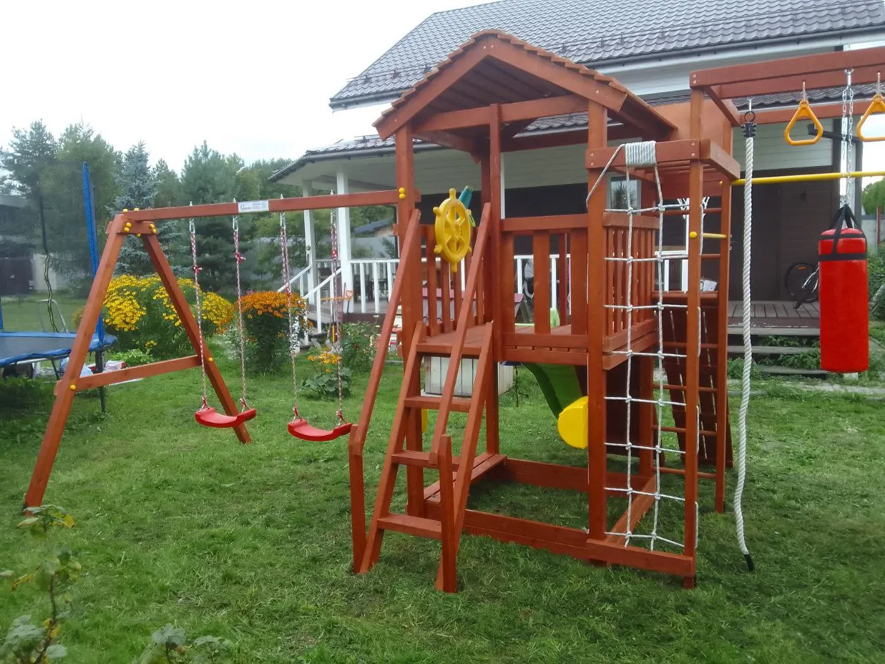 Комплекс выполнен из качественной древесины, обработанной для защиты от внешних воздействий. Все соединения надежно закреплены, а болтовые соединения закрыты пластиковыми заглушками.