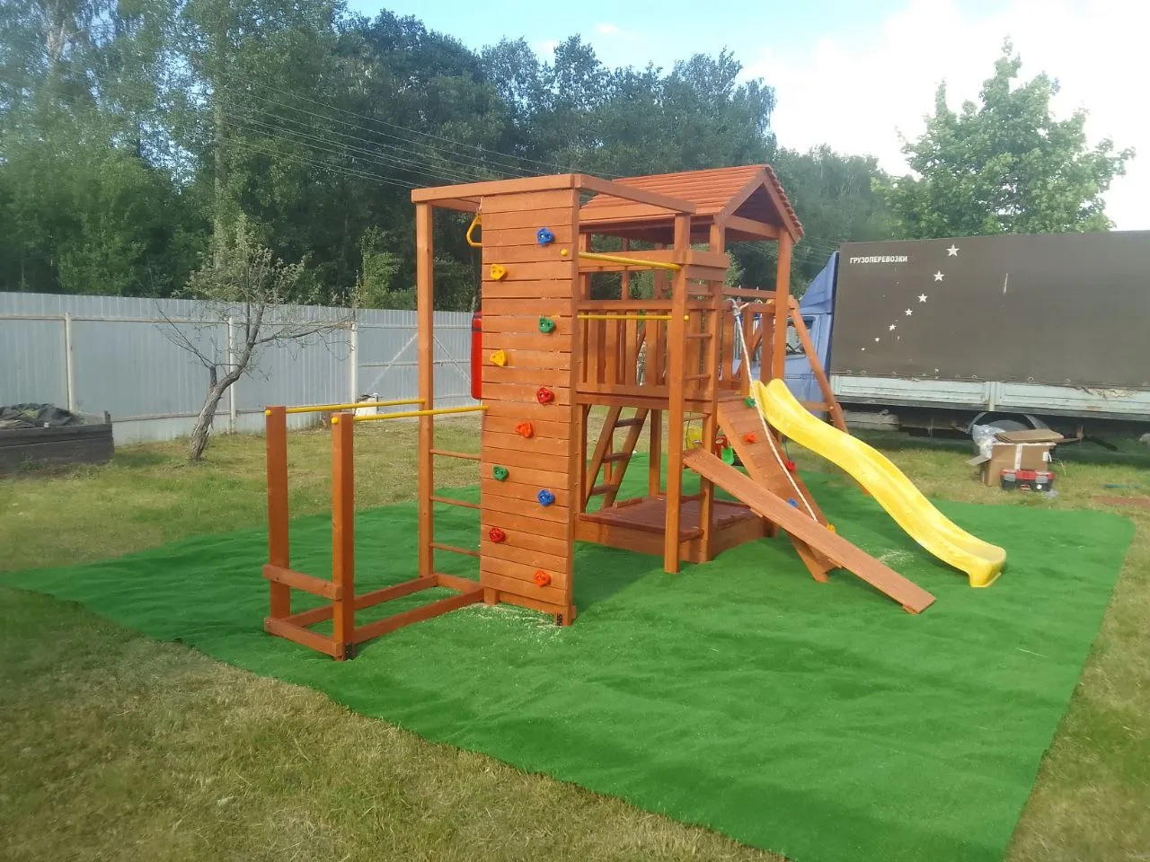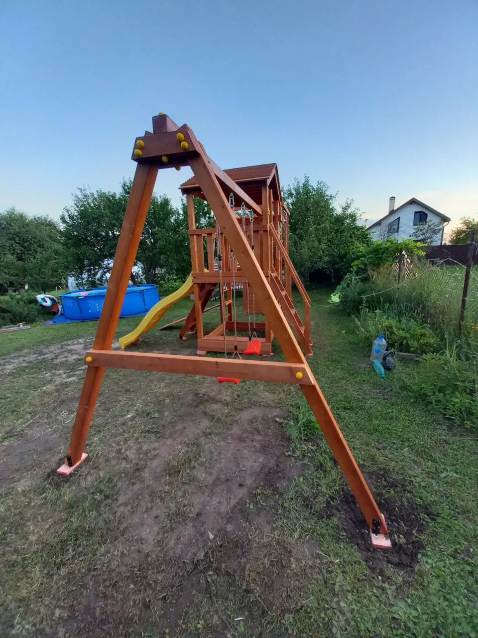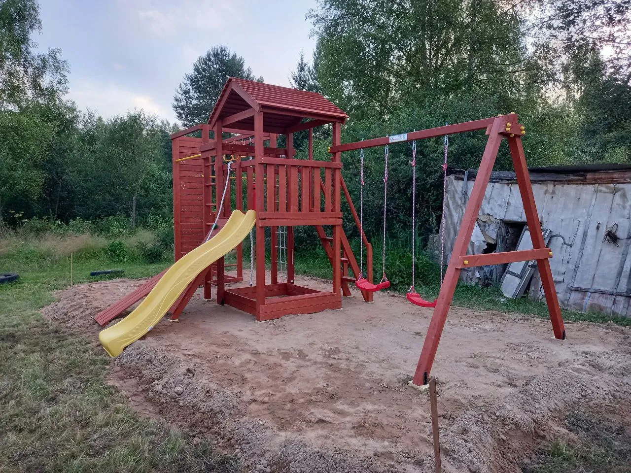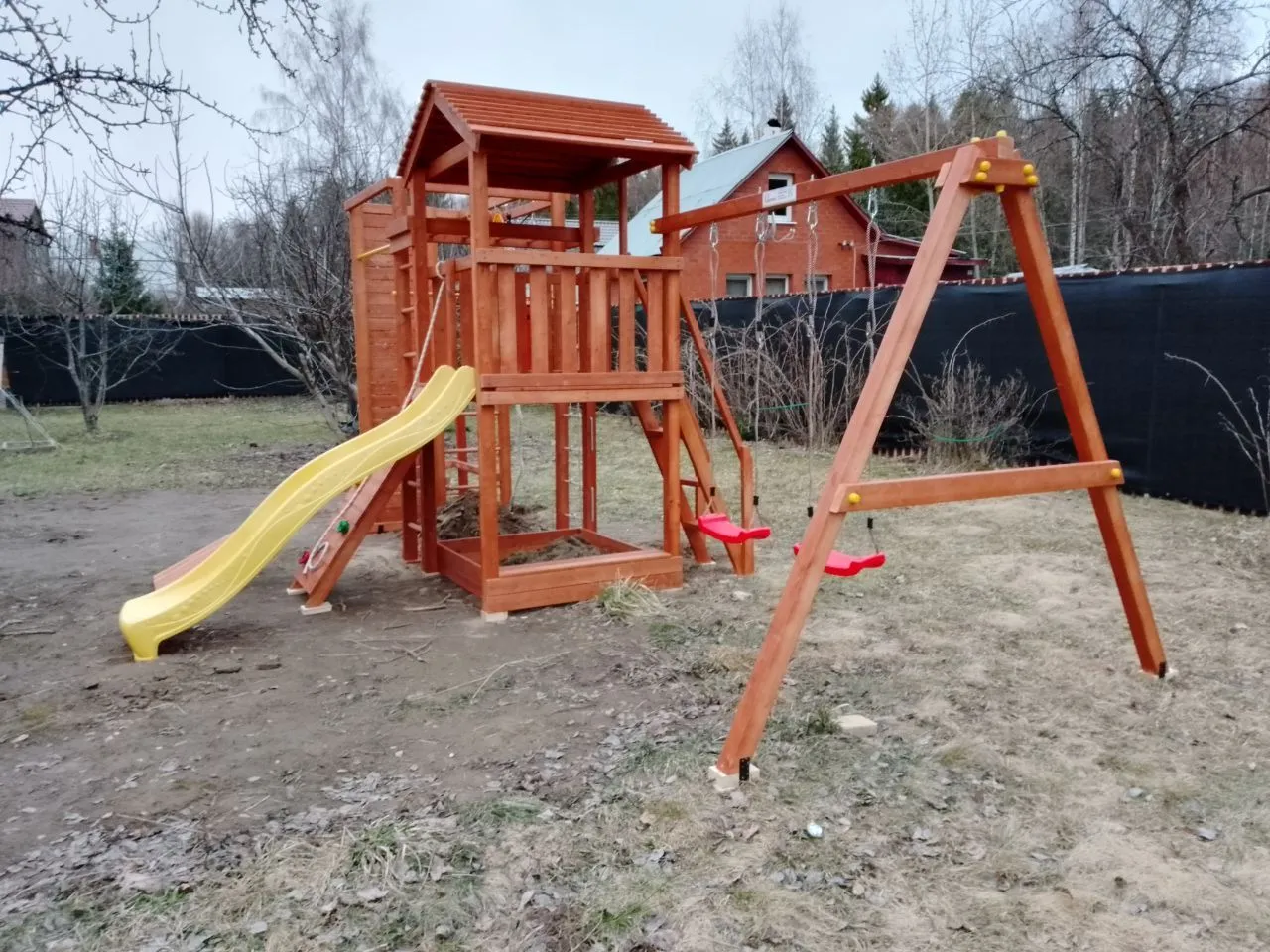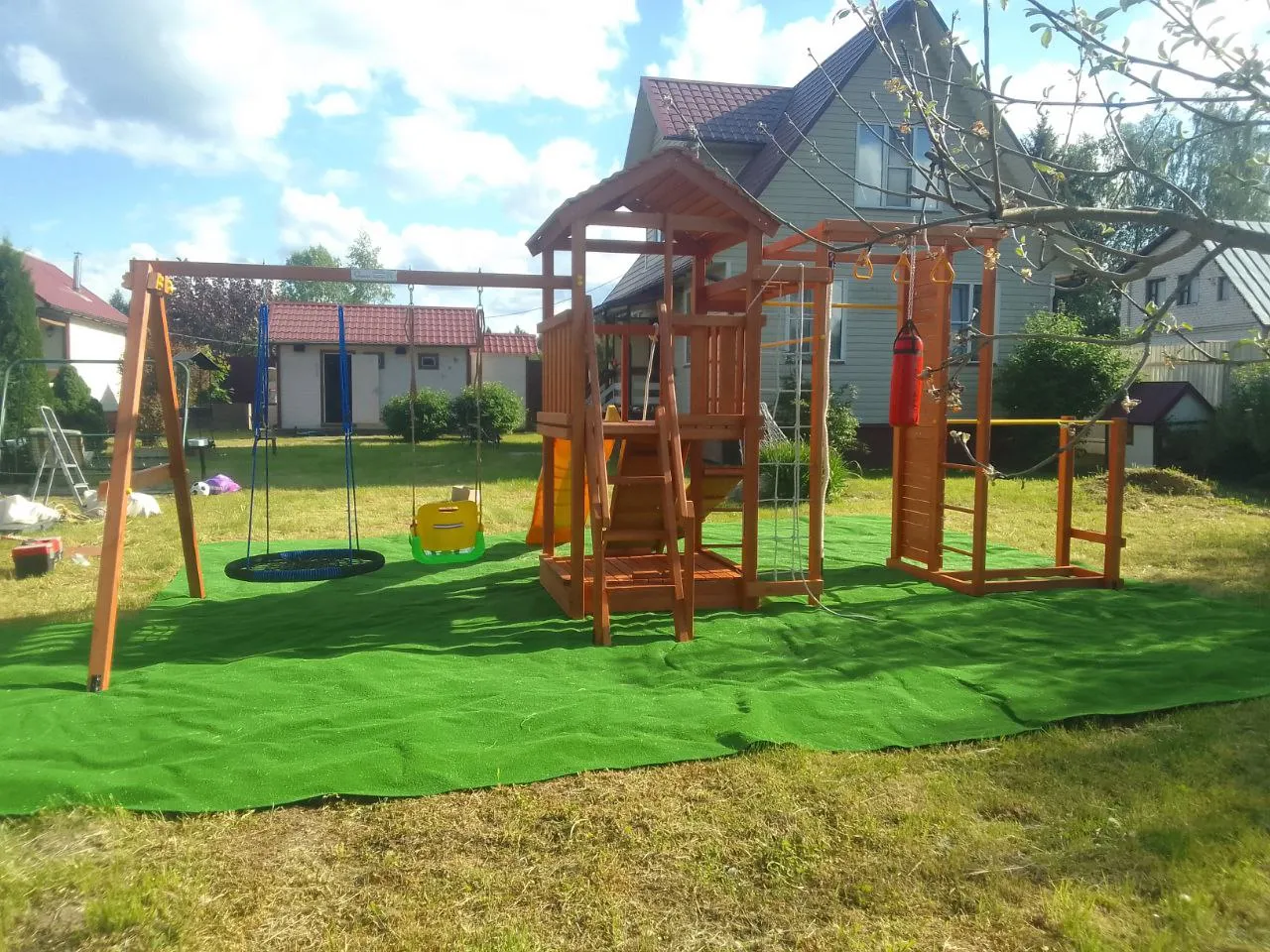 Комплекс выполнен из качественной древесины, обработанной для защиты от внешних воздействий. Все соединения надежно закреплены, а болтовые соединения закрыты пластиковыми заглушками.