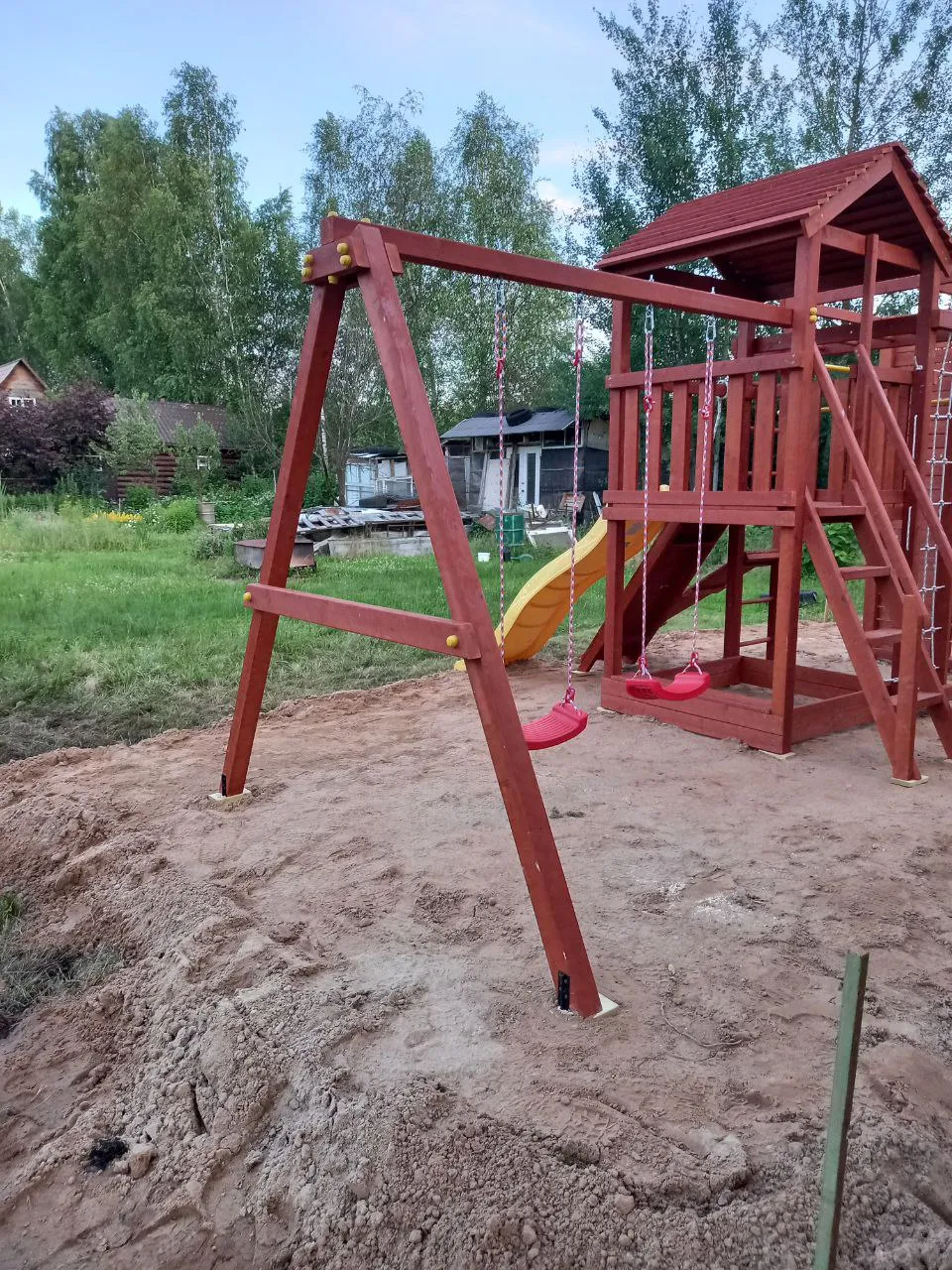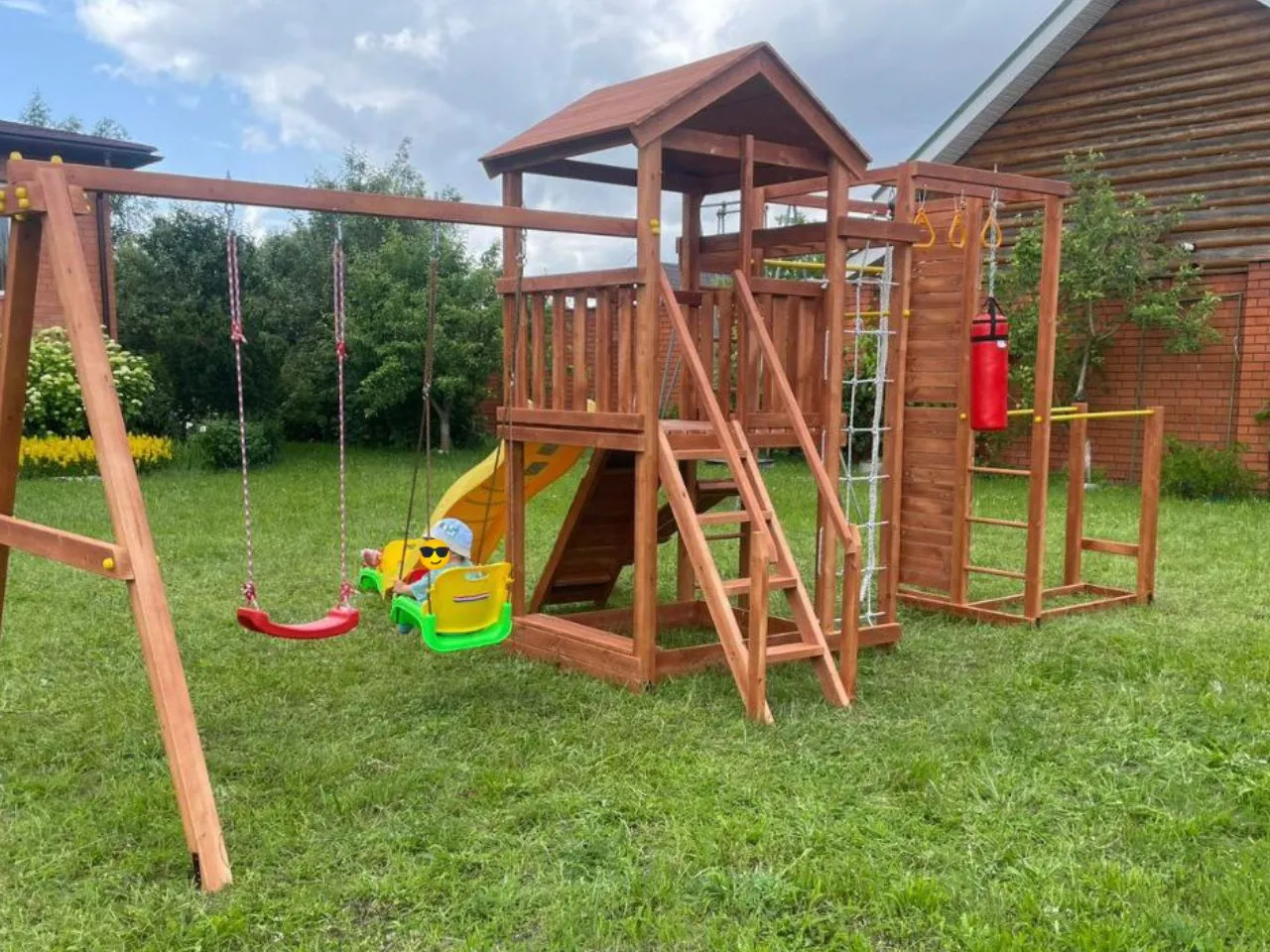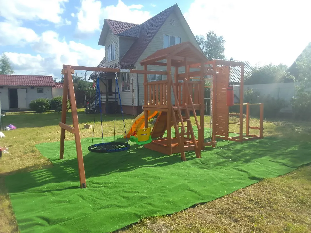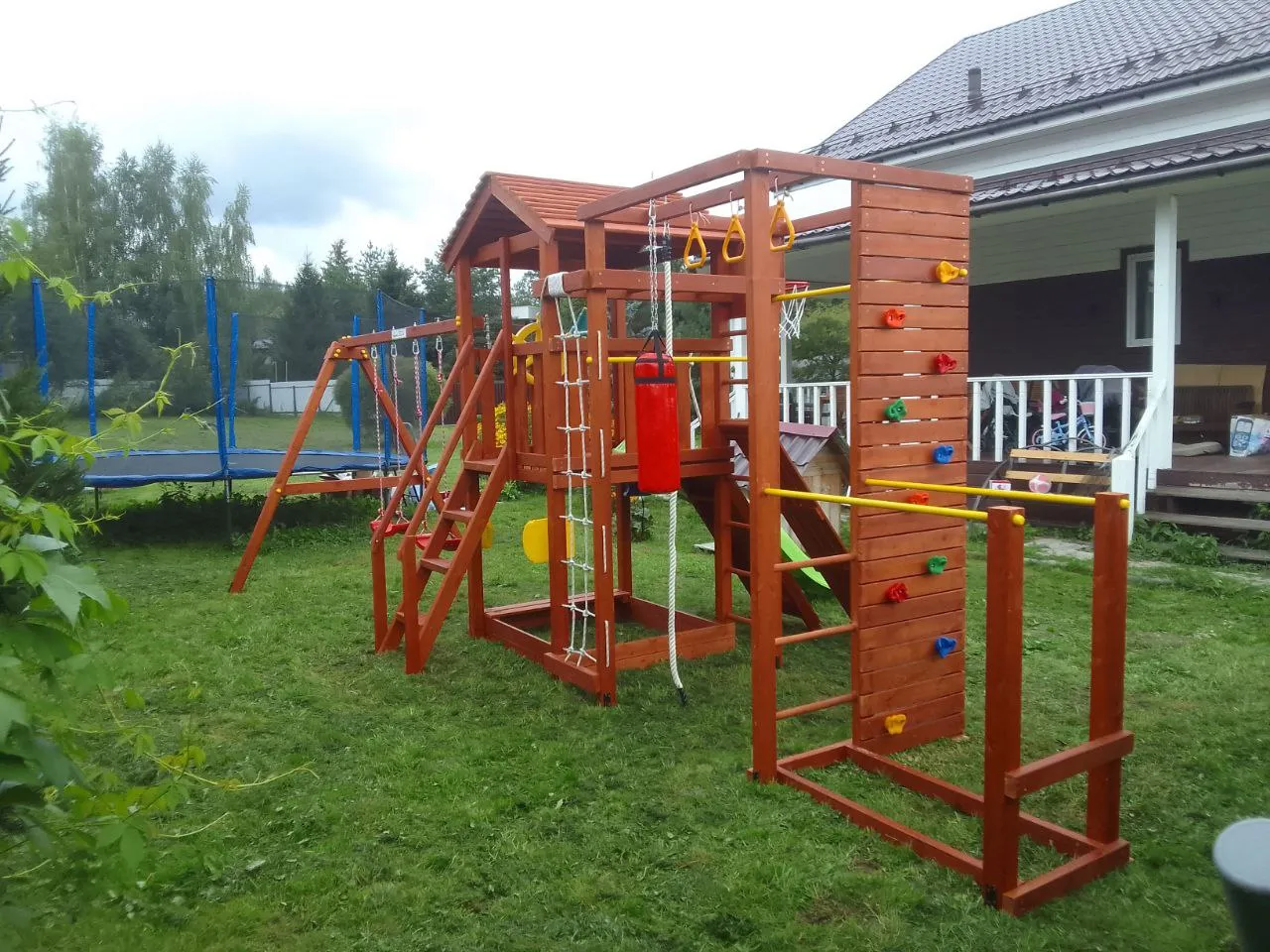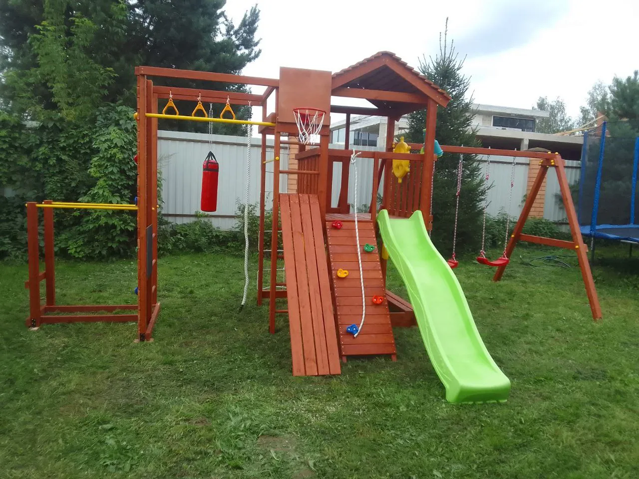 Комплекс выполнен из качественной древесины, обработанной для защиты от внешних воздействий. Все соединения надежно закреплены, а болтовые соединения закрыты пластиковыми заглушками.