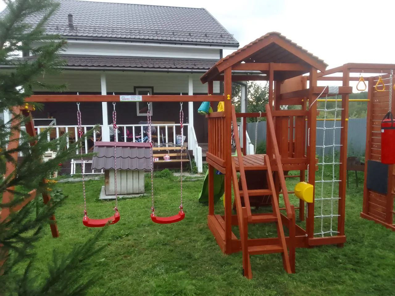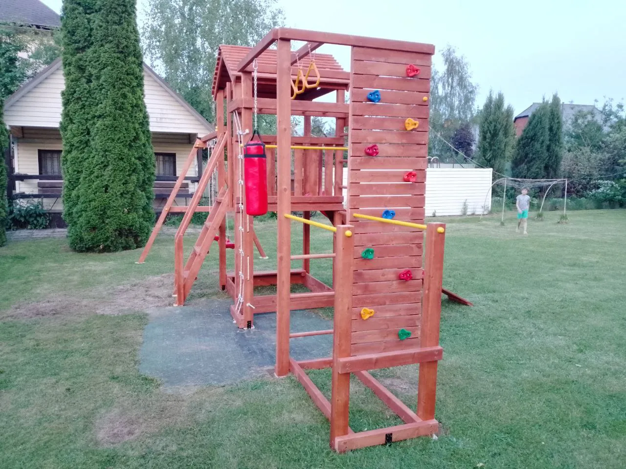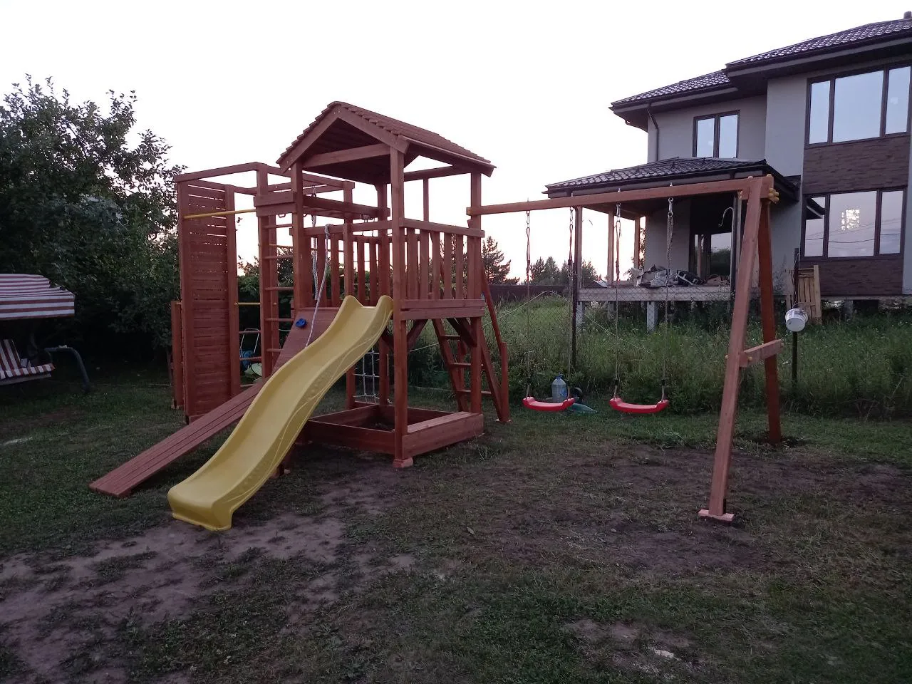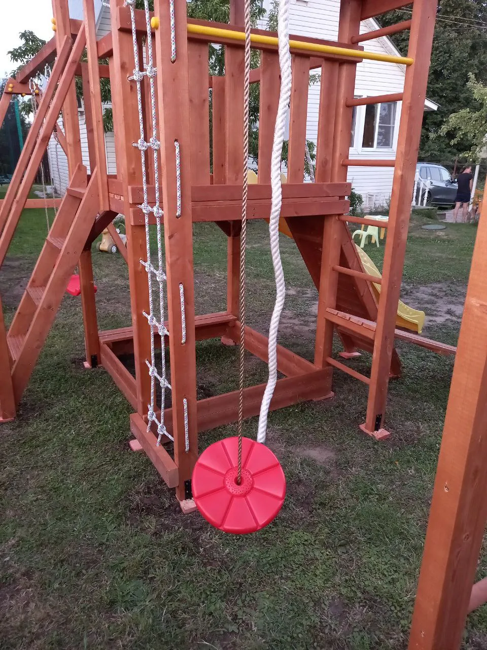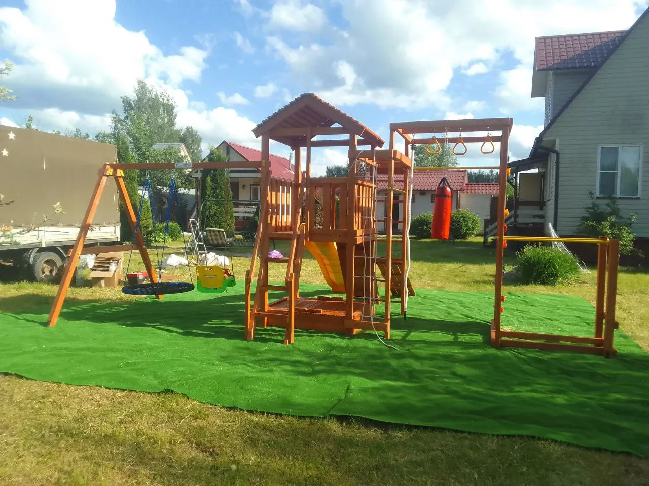 Комплекс выполнен из качественной древесины, обработанной для защиты от внешних воздействий. Все соединения надежно закреплены, а болтовые соединения закрыты пластиковыми заглушками.